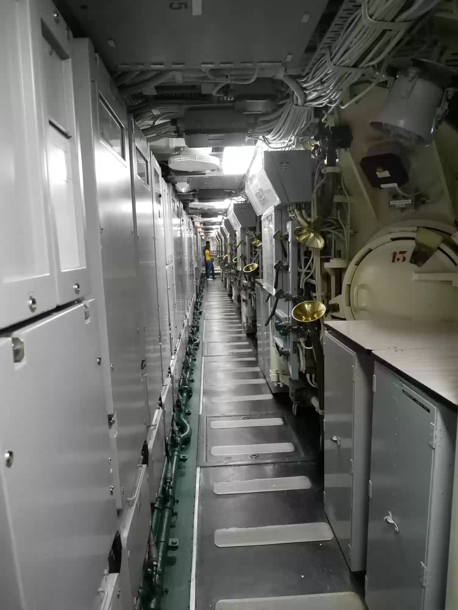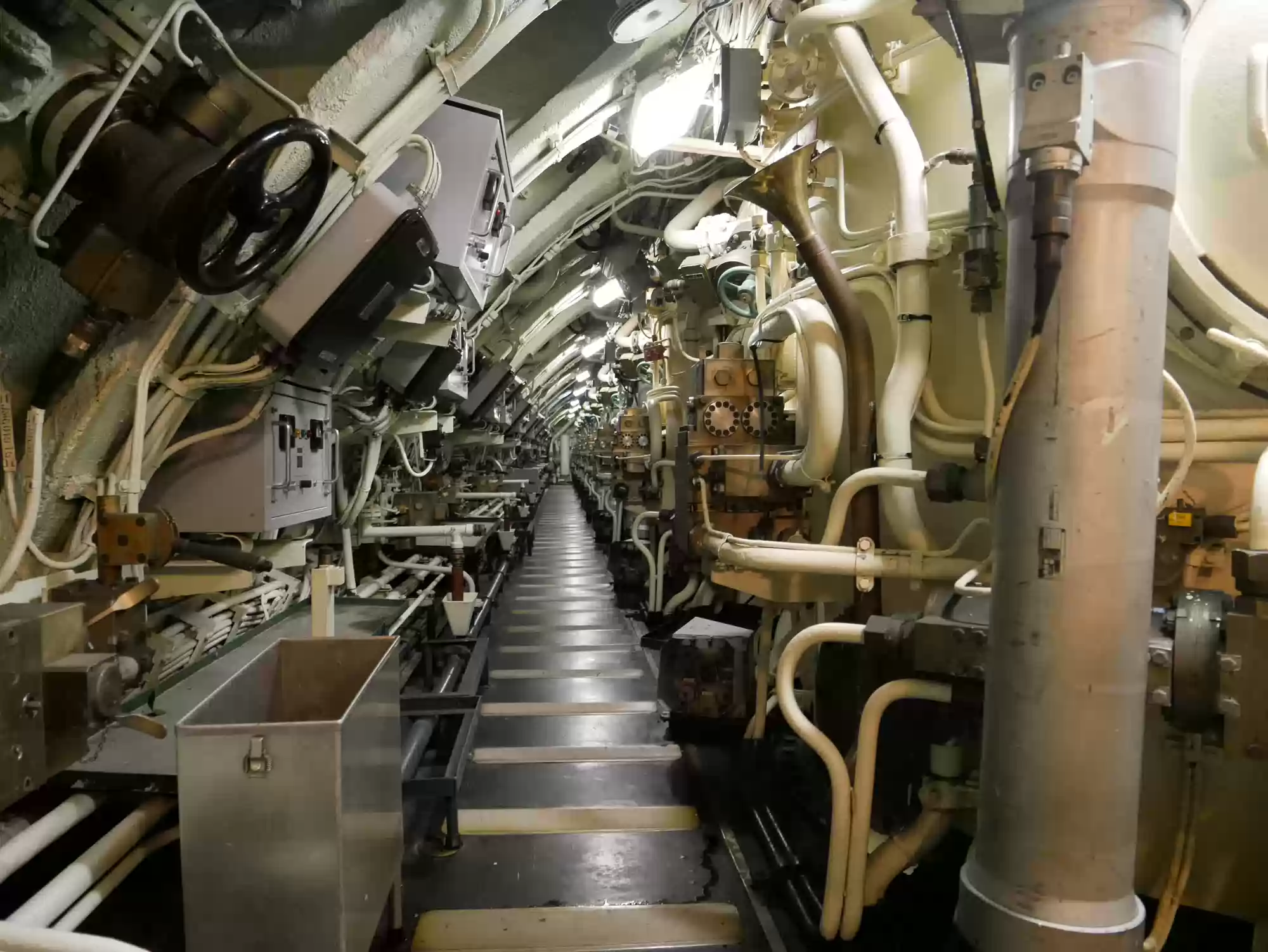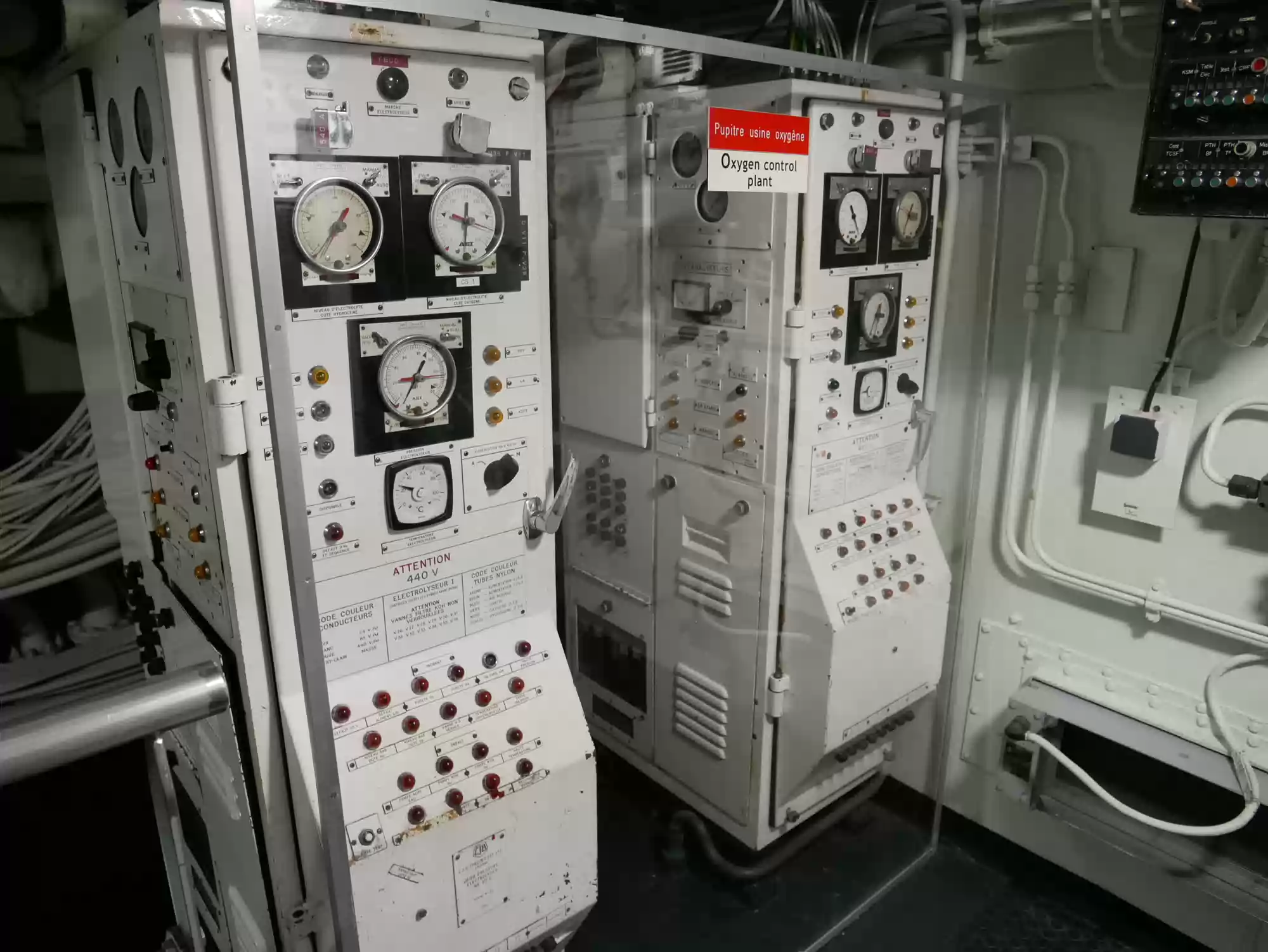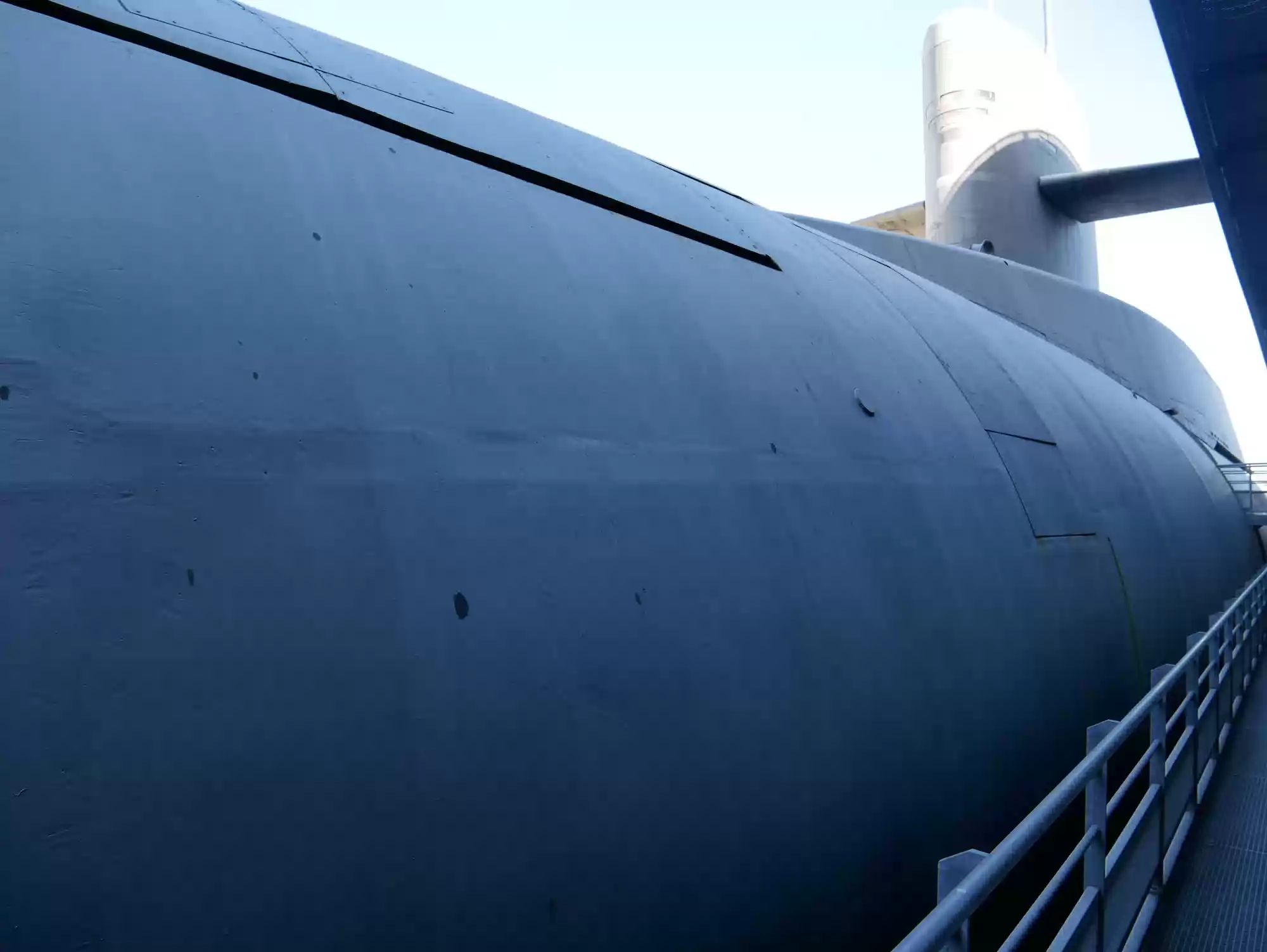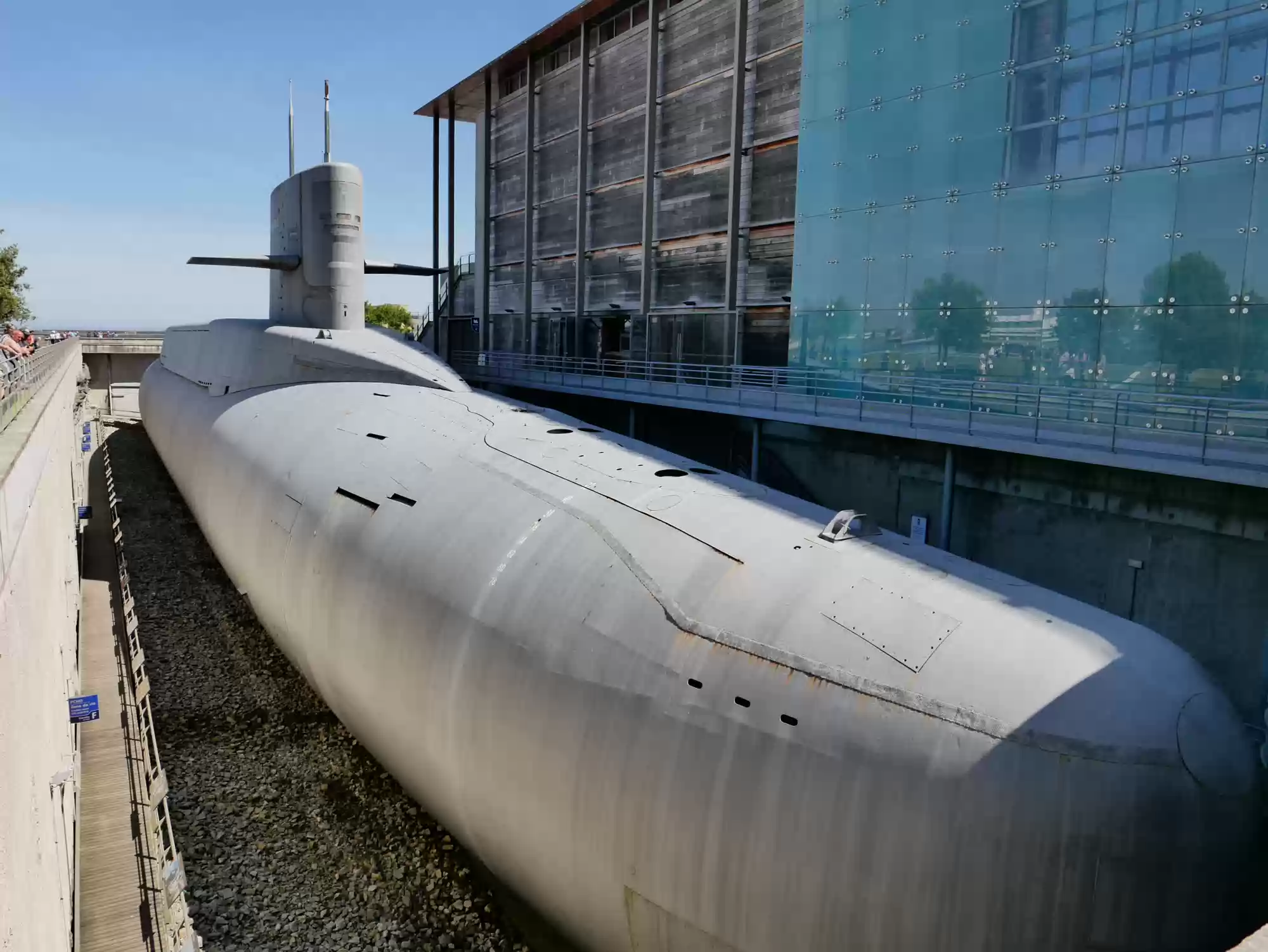 Redoutable submarine, the first French nuclear-powered submarine, launched in 1967, used for 21 years. 128 m long, 10.6 m wide, 8000 tons. Double hull. Rudder jack. Reduction gear located between the steam engine and the propulsian gear. Steam production section. Steam production section. Heat was produced by a nuclear power plant, which was removed from the submarine after decommissioning. Alternator. Oxygen control plant. Oxygen and drinkable water were produced out of sea water. Periscope. Missile tube. The Redoutable carried 16 sea-to-ground missiles with a range of more than 2000 km. Missile tube. The Redoutable carried 16 sea-to-ground missiles with a range of more than 2000 km. The 16 missile tubes. Labels