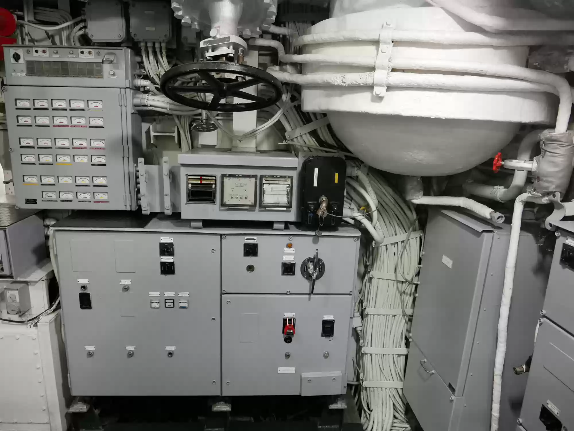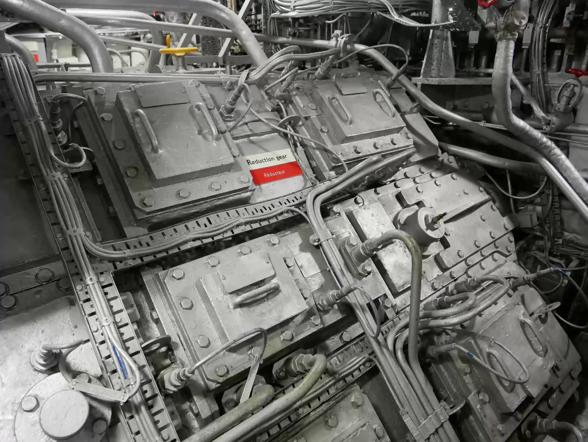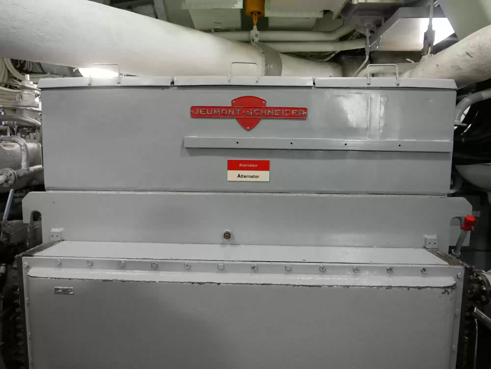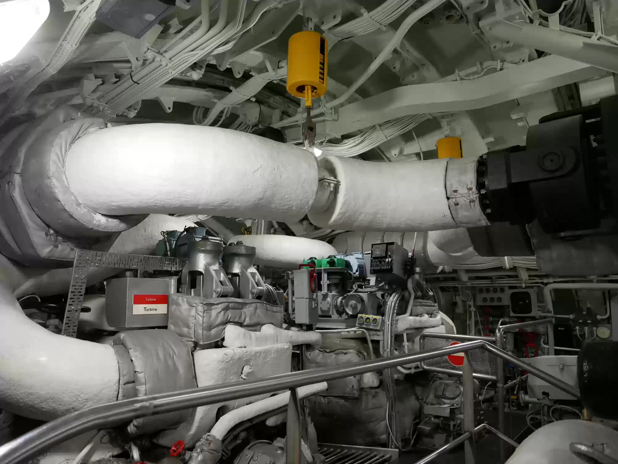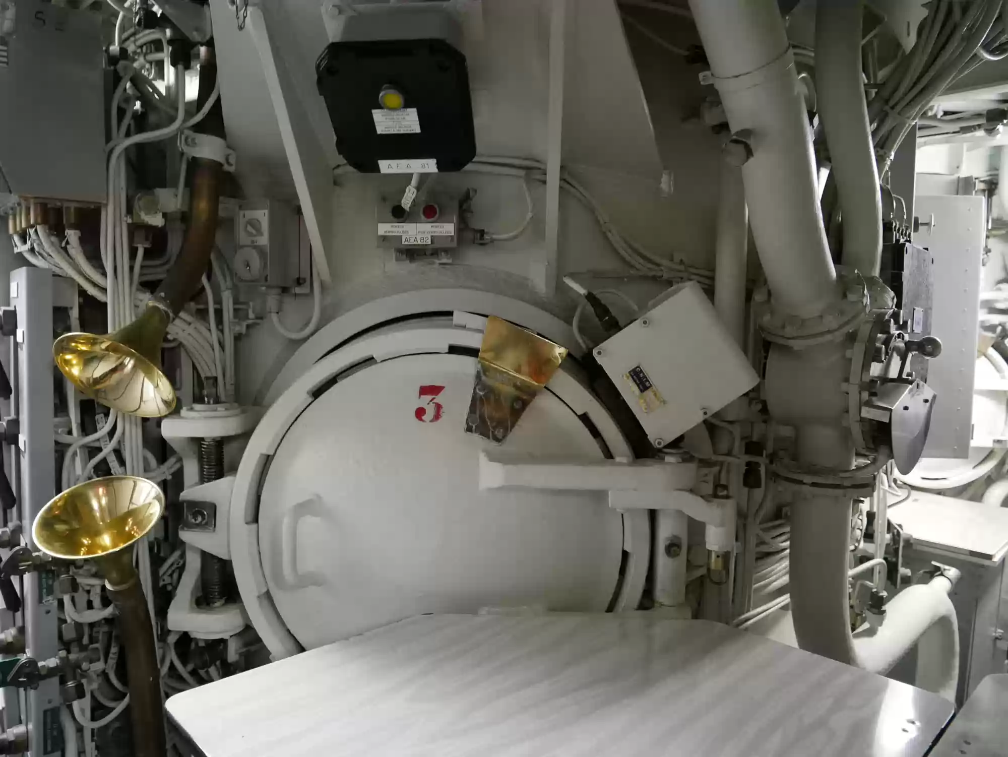 Redoutable submarine, the first French nuclear-powered submarine, launched in 1967, used for 21 years. 128 m long, 10.6 m wide, 8000 tons. Double hull. Rudder jack. Reduction gear located between the steam engine and the propulsian gear. Steam production section. Steam production section. Heat was produced by a nuclear power plant, which was removed from the submarine after decommissioning. Alternator. Oxygen control plant. Oxygen and drinkable water were produced out of sea water. Periscope. Missile tube. The Redoutable carried 16 sea-to-ground missiles with a range of more than 2000 km. Missile tube. The Redoutable carried 16 sea-to-ground missiles with a range of more than 2000 km. The 16 missile tubes. Labels
