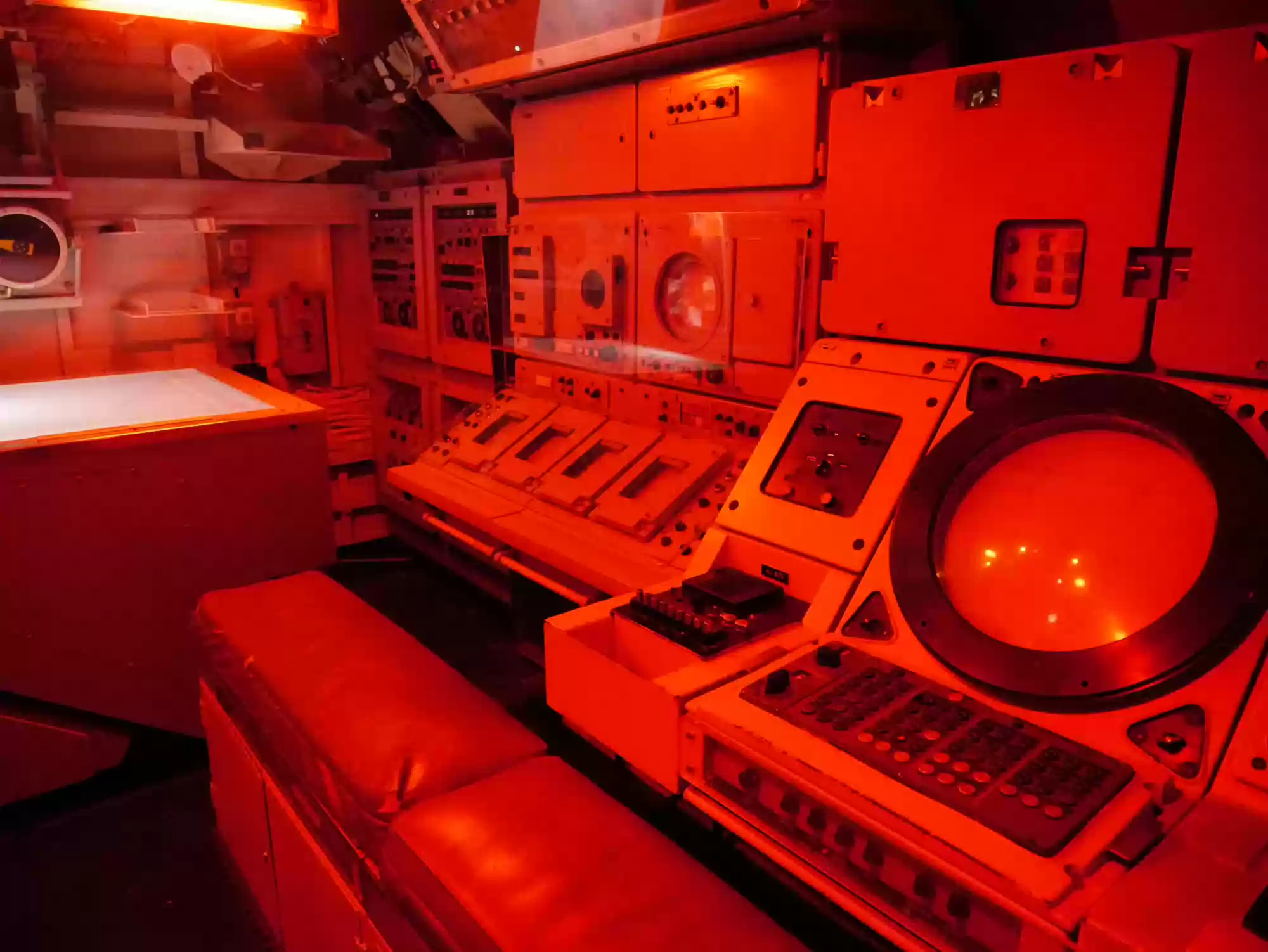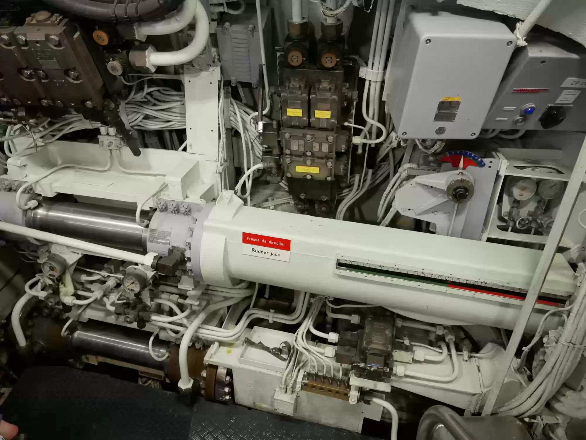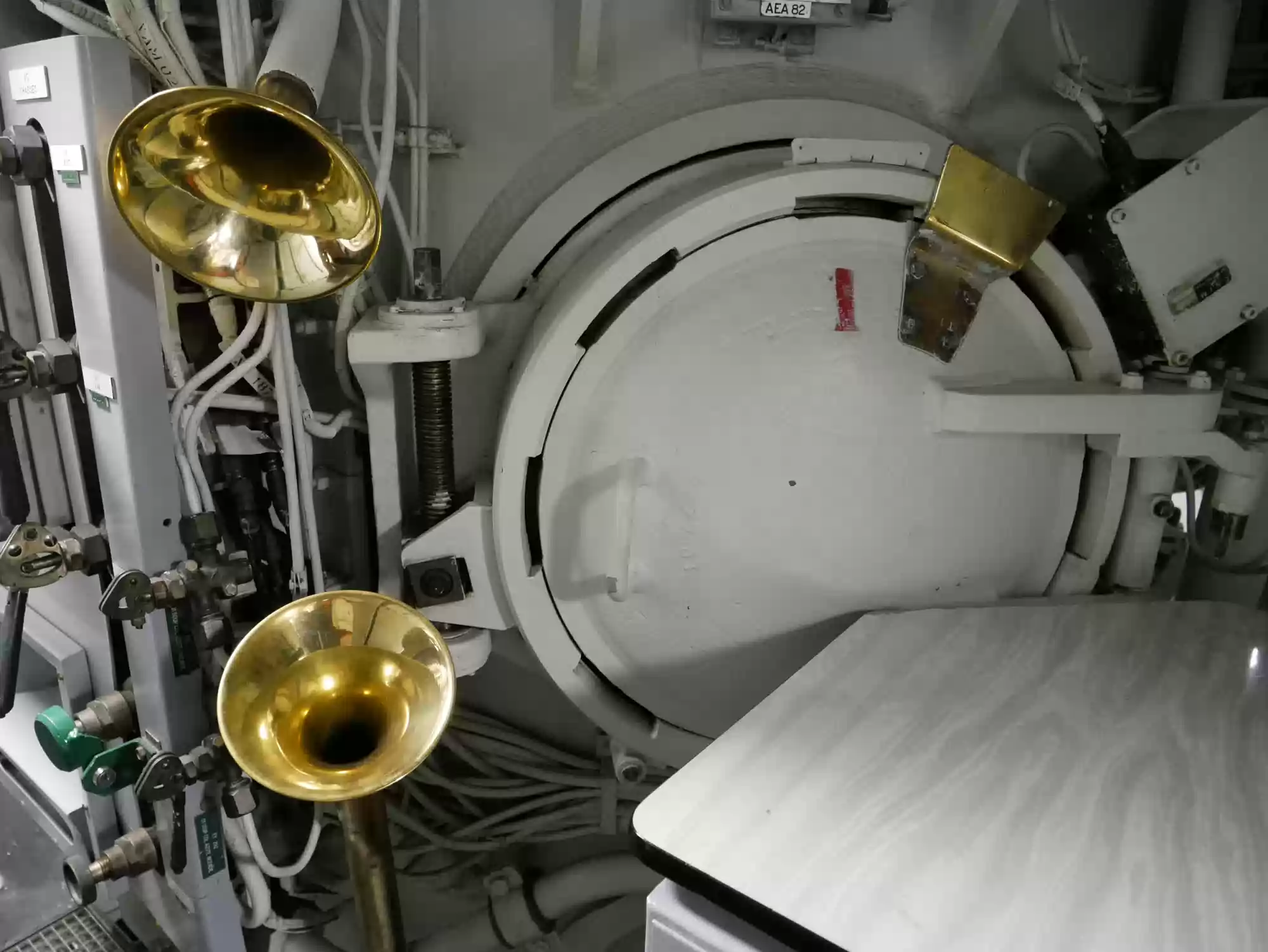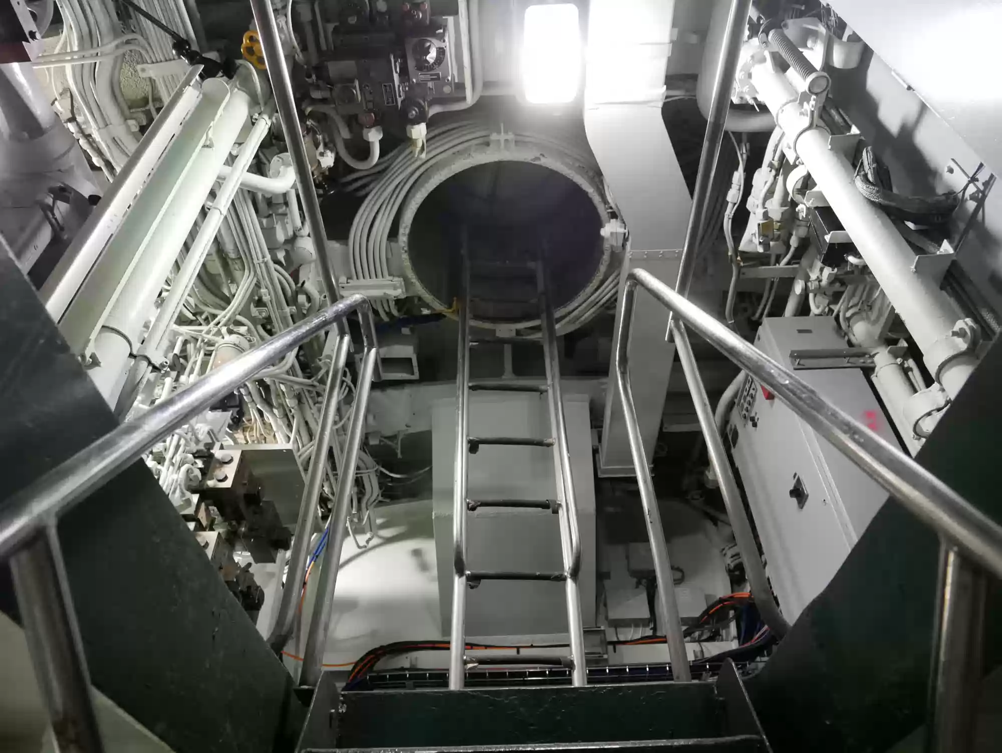 Redoutable submarine, the first French nuclear-powered submarine, launched in 1967, used for 21 years. 128 m long, 10.6 m wide, 8000 tons. Double hull. Rudder jack. Reduction gear located between the steam engine and the propulsian gear. Steam production section. Steam production section. Heat was produced by a nuclear power plant, which was removed from the submarine after decommissioning. Alternator. Oxygen control plant. Oxygen and drinkable water were produced out of sea water. Periscope. Missile tube. The Redoutable carried 16 sea-to-ground missiles with a range of more than 2000 km. Missile tube. The Redoutable carried 16 sea-to-ground missiles with a range of more than 2000 km. The 16 missile tubes. Labels