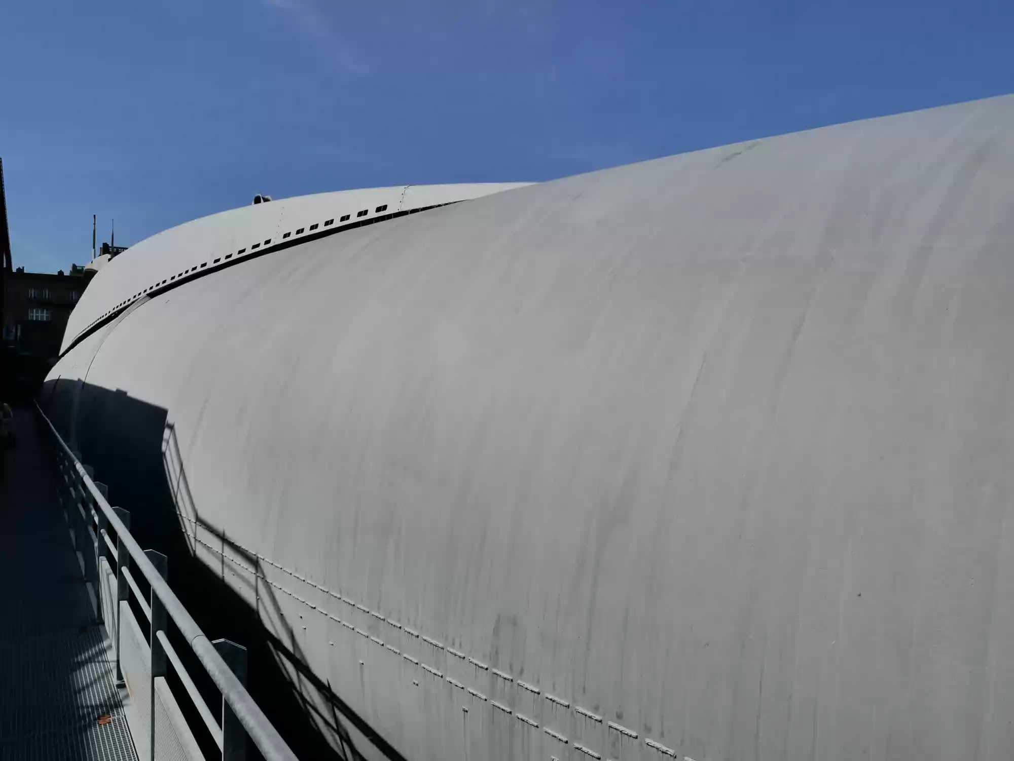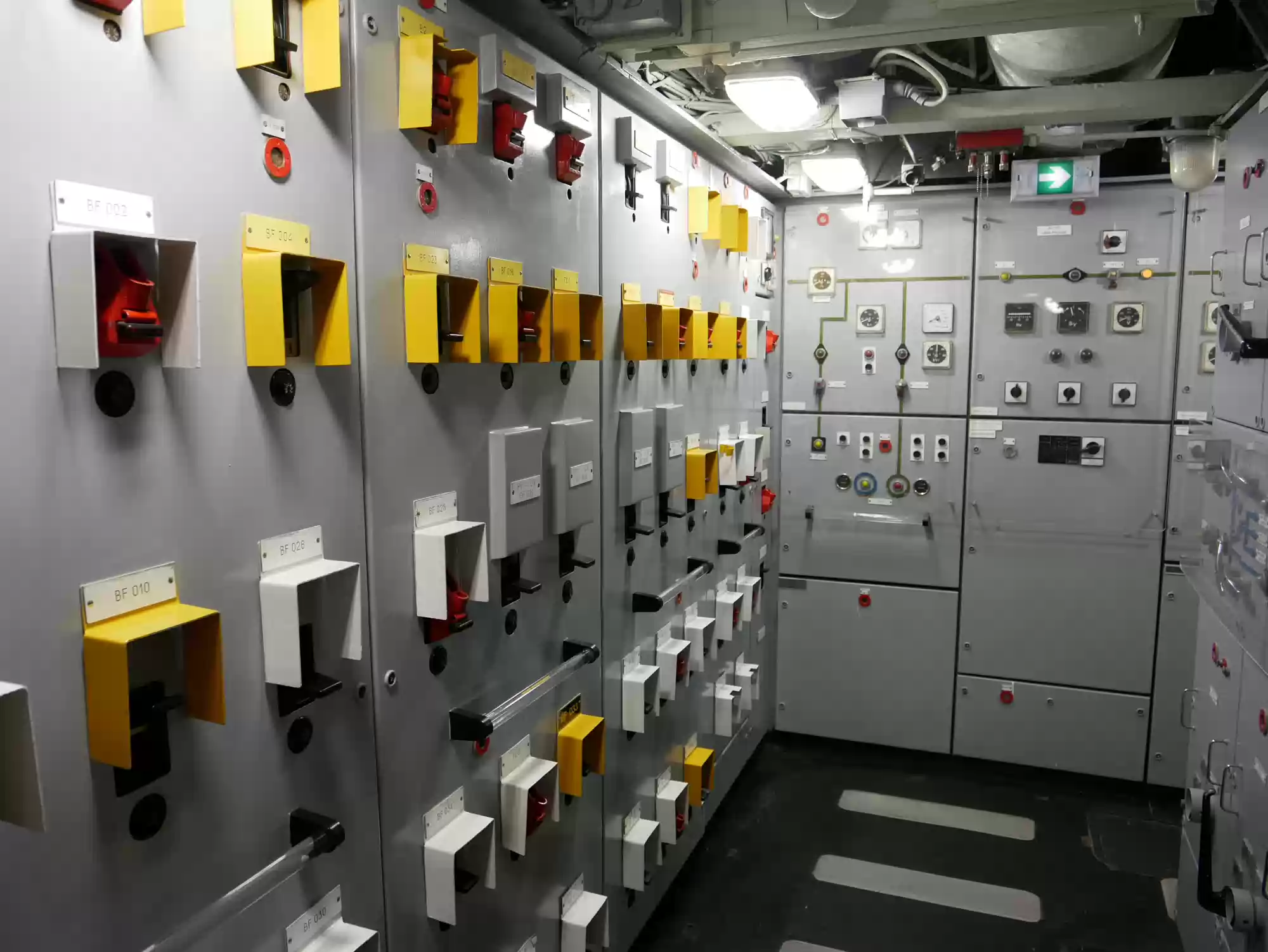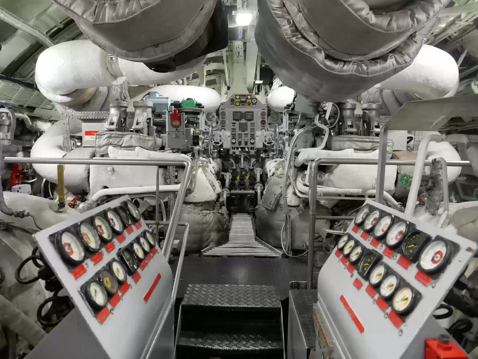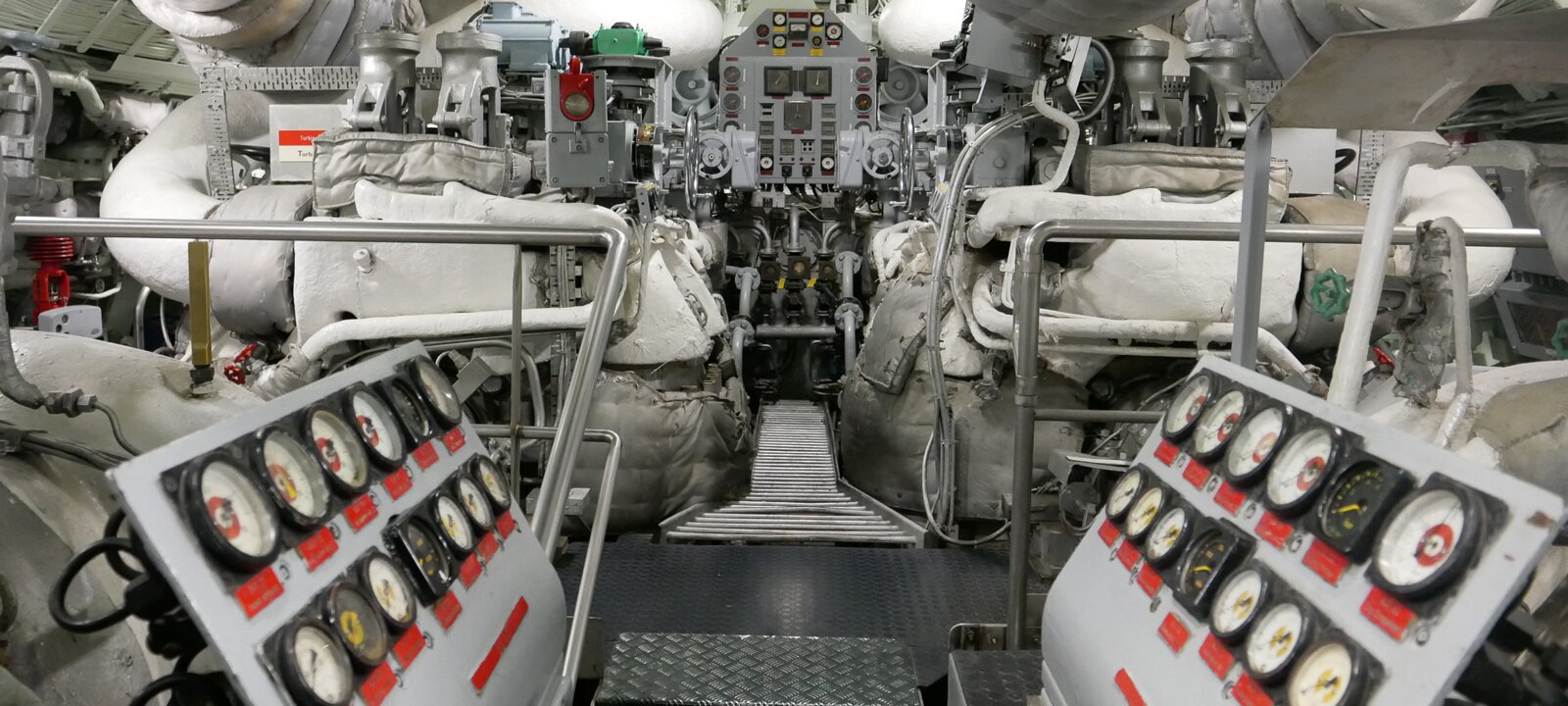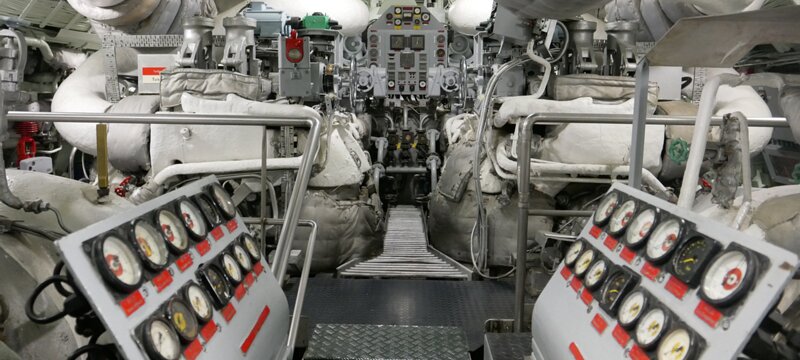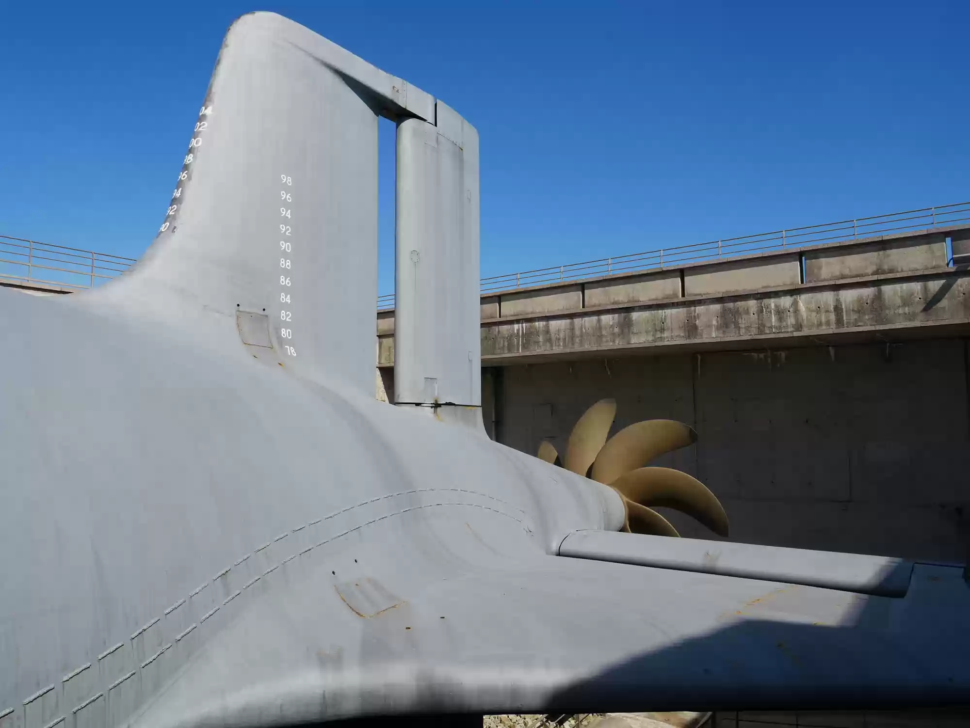 Redoutable submarine, the first French nuclear-powered submarine, launched in 1967, used for 21 years. 128 m long, 10.6 m wide, 8000 tons. Double hull. Rudder jack. Reduction gear located between the steam engine and the propulsian gear. Steam production section. Steam production section. Heat was produced by a nuclear power plant, which was removed from the submarine after decommissioning. Alternator. Oxygen control plant. Oxygen and drinkable water were produced out of sea water. Periscope. Missile tube. The Redoutable carried 16 sea-to-ground missiles with a range of more than 2000 km. Missile tube. The Redoutable carried 16 sea-to-ground missiles with a range of more than 2000 km. The 16 missile tubes. Labels