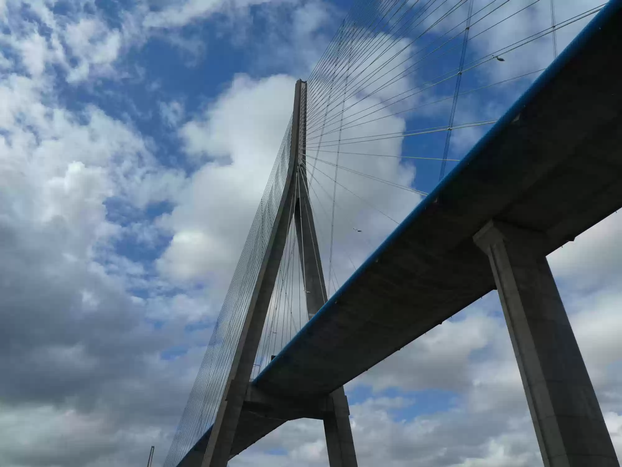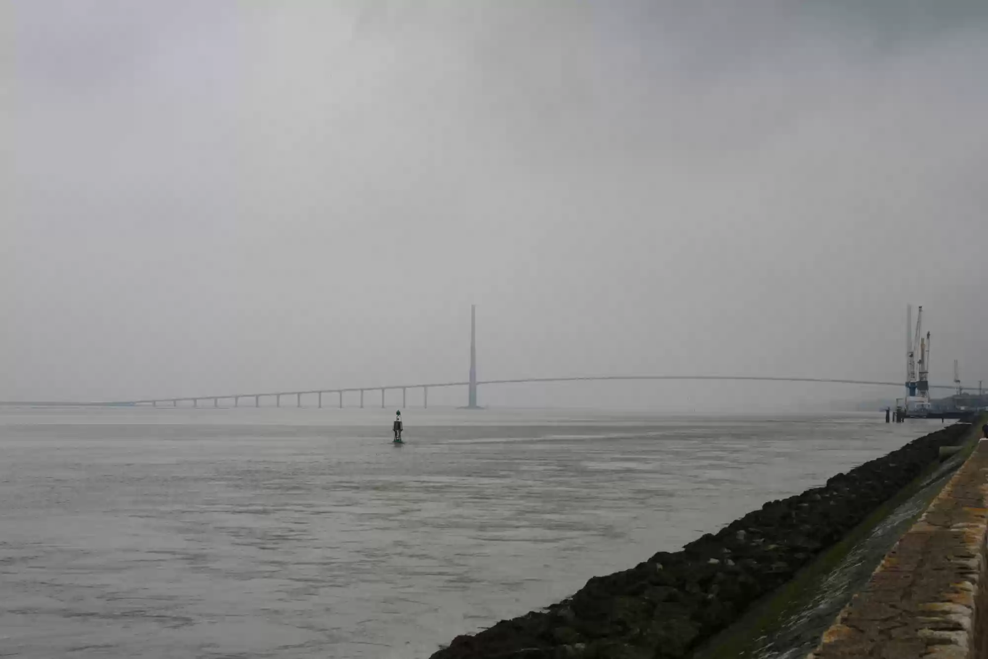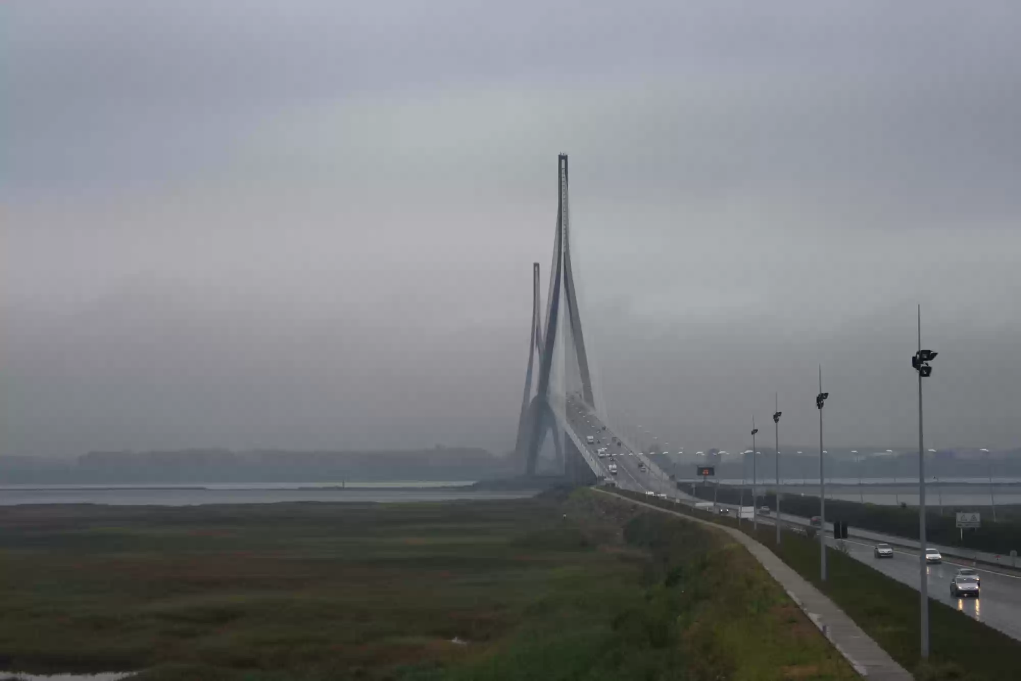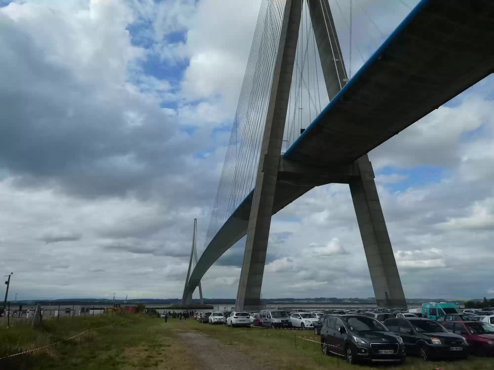 Bridge of Normandie (Pont de Normandie), spanning the Seine river between Le Havre and Honfleur, built in 1988-1995. The total length of the bridge is 2.1km with a longest span of 856m. The pylons are 215m high. Bridge over a canal in the Le Havree harnour, next to the bridge of Normandie. Landscape surrounding the bridge. Armada 2019 Labels