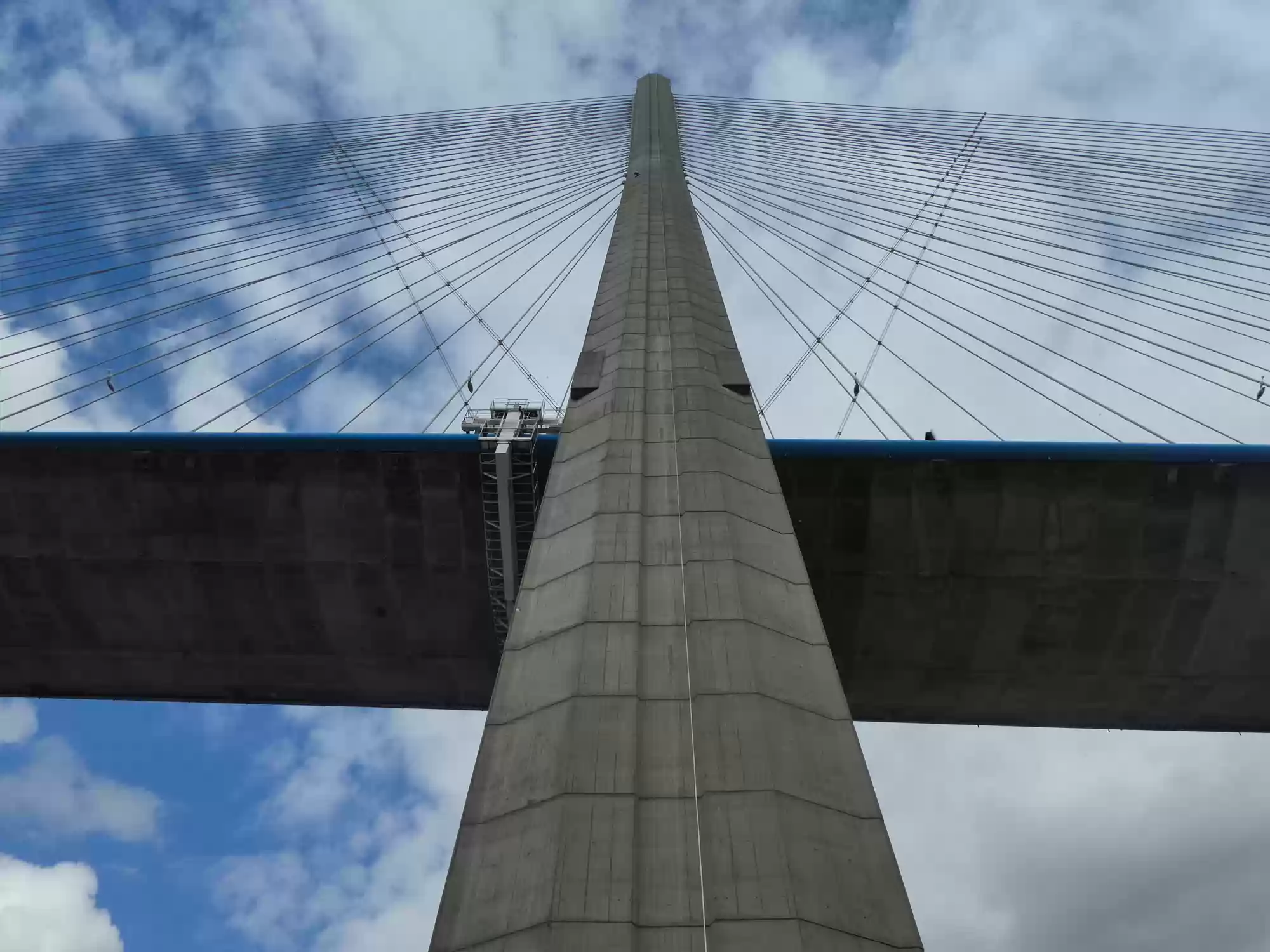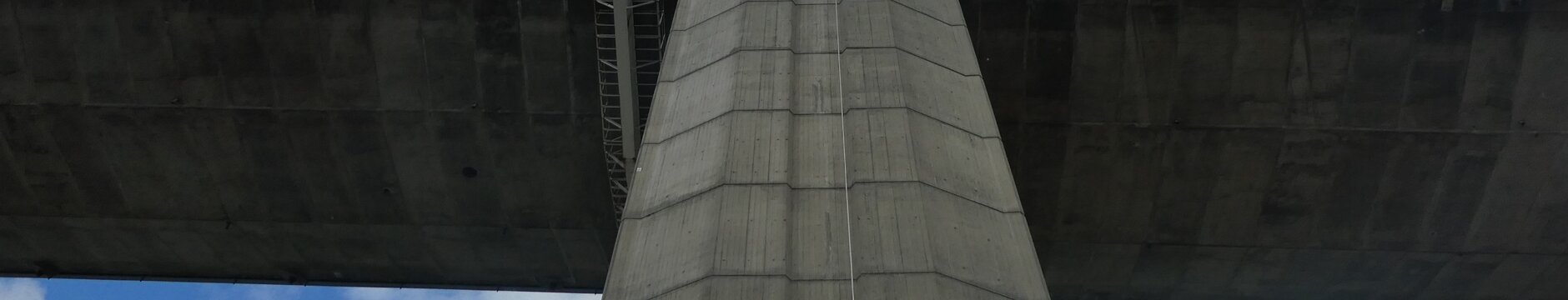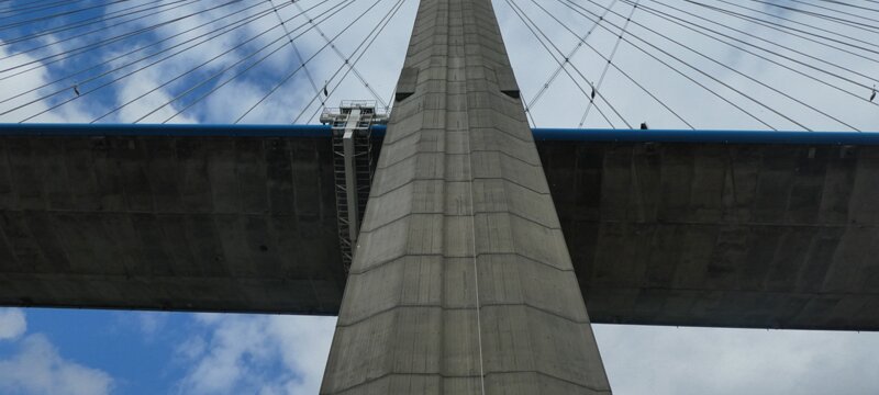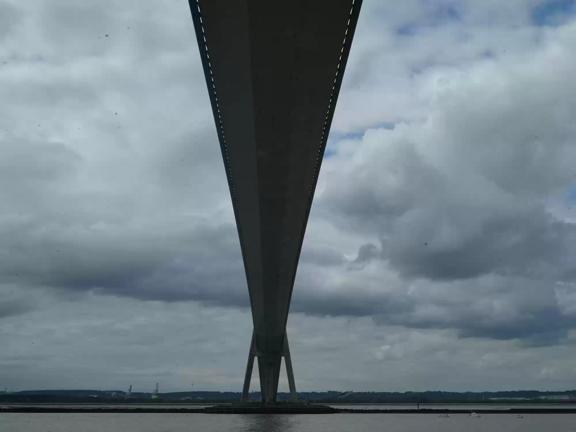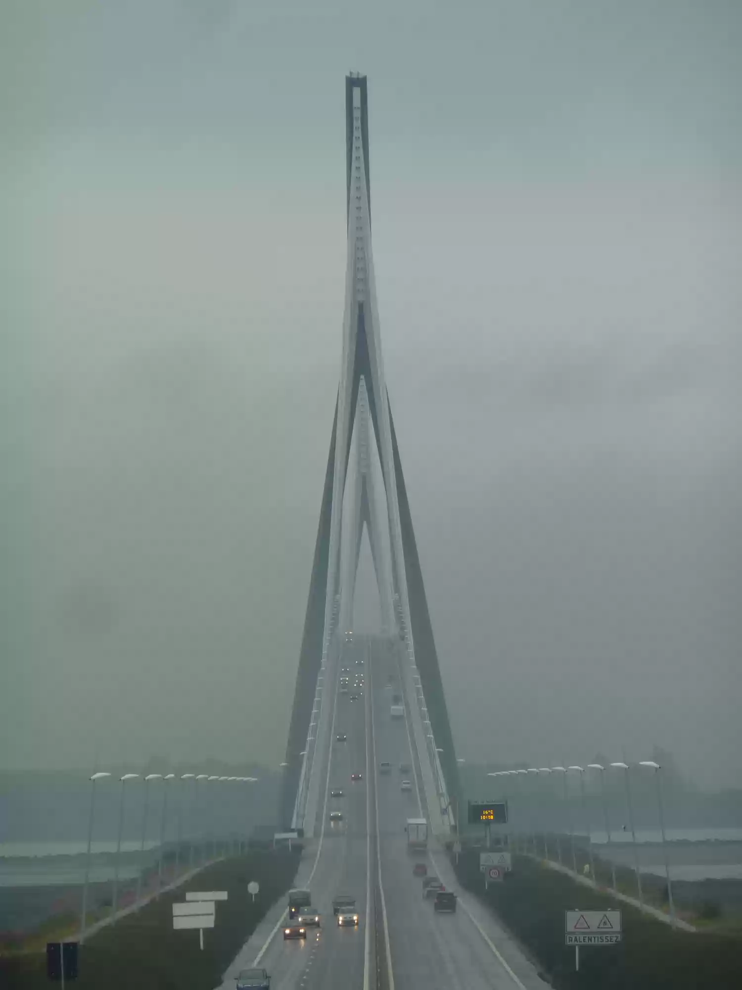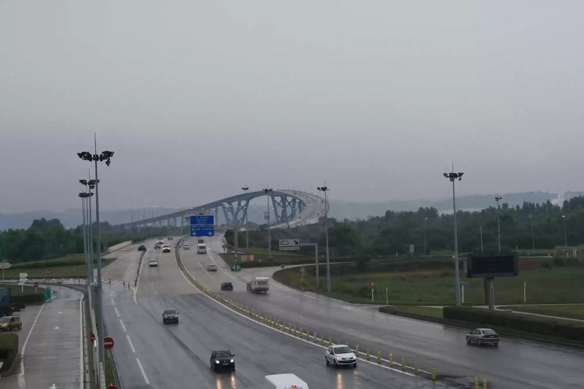 Bridge of Normandie (Pont de Normandie), spanning the Seine river between Le Havre and Honfleur, built in 1988-1995. The total length of the bridge is 2.1km with a longest span of 856m. The pylons are 215m high. Bridge over a canal in the Le Havree harnour, next to the bridge of Normandie. Landscape surrounding the bridge. Armada 2019 Labels