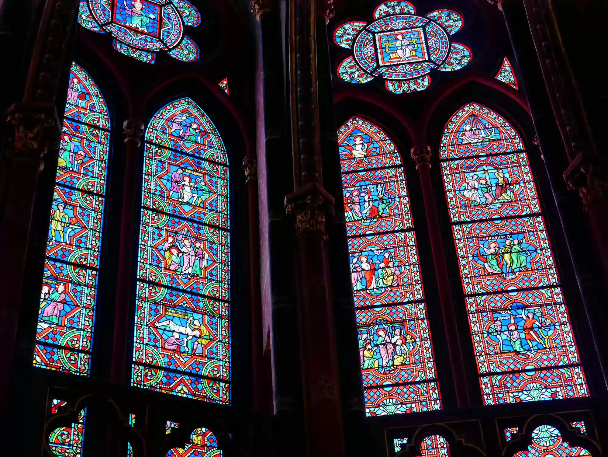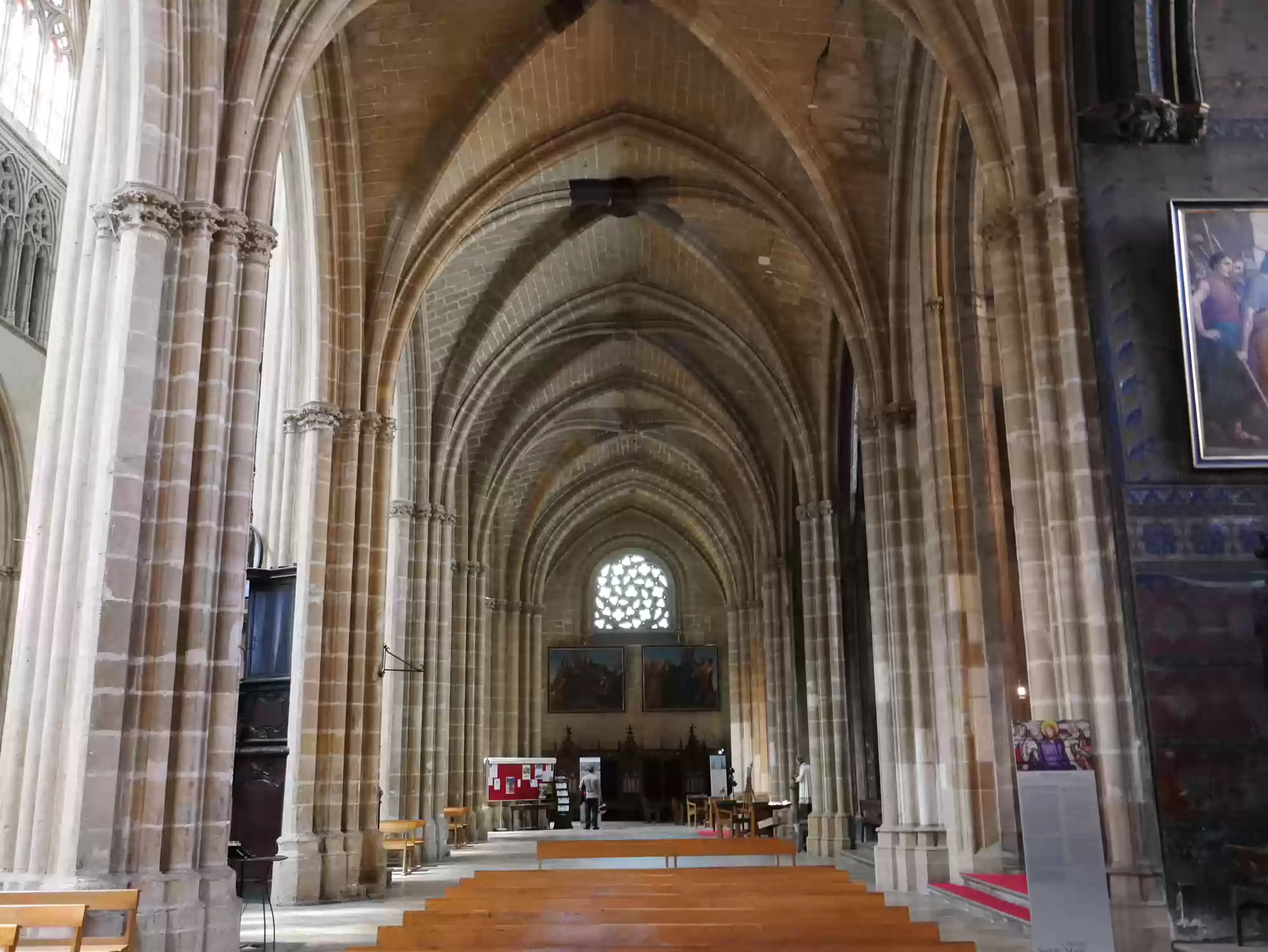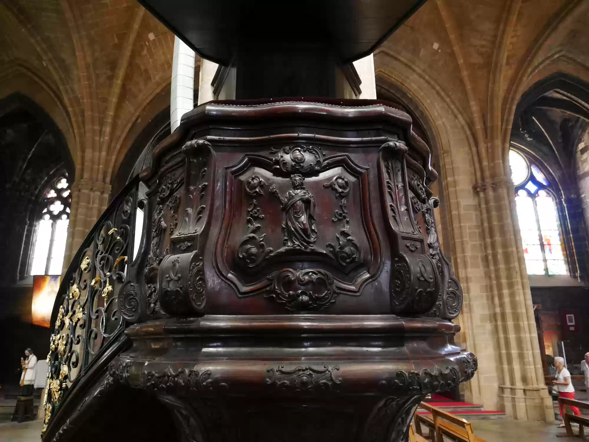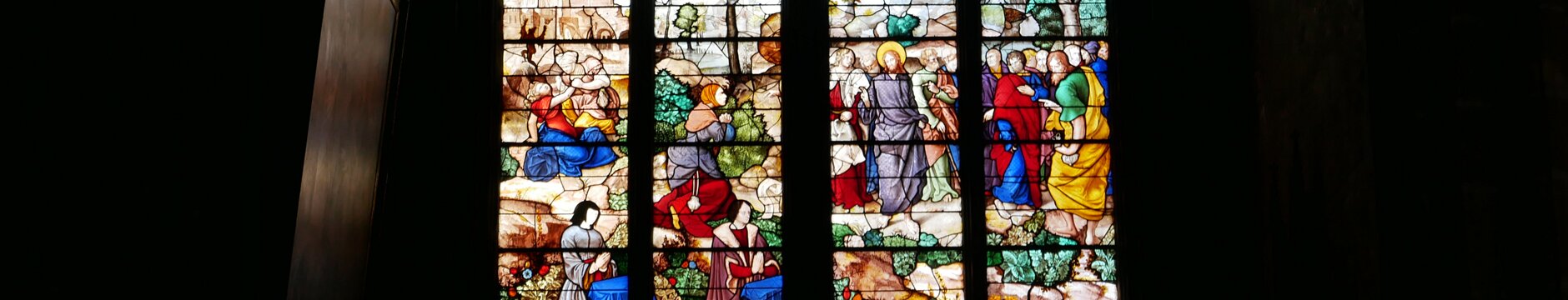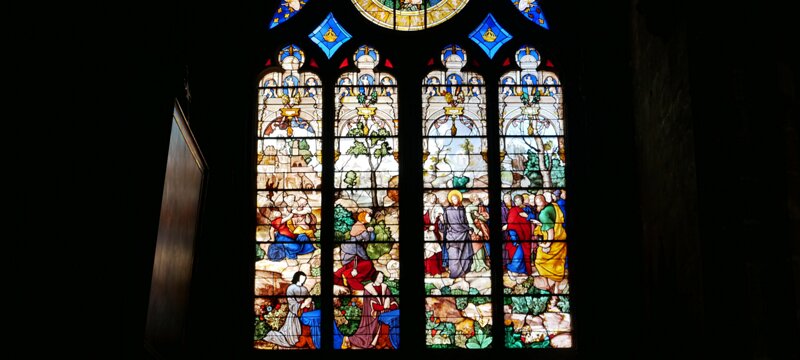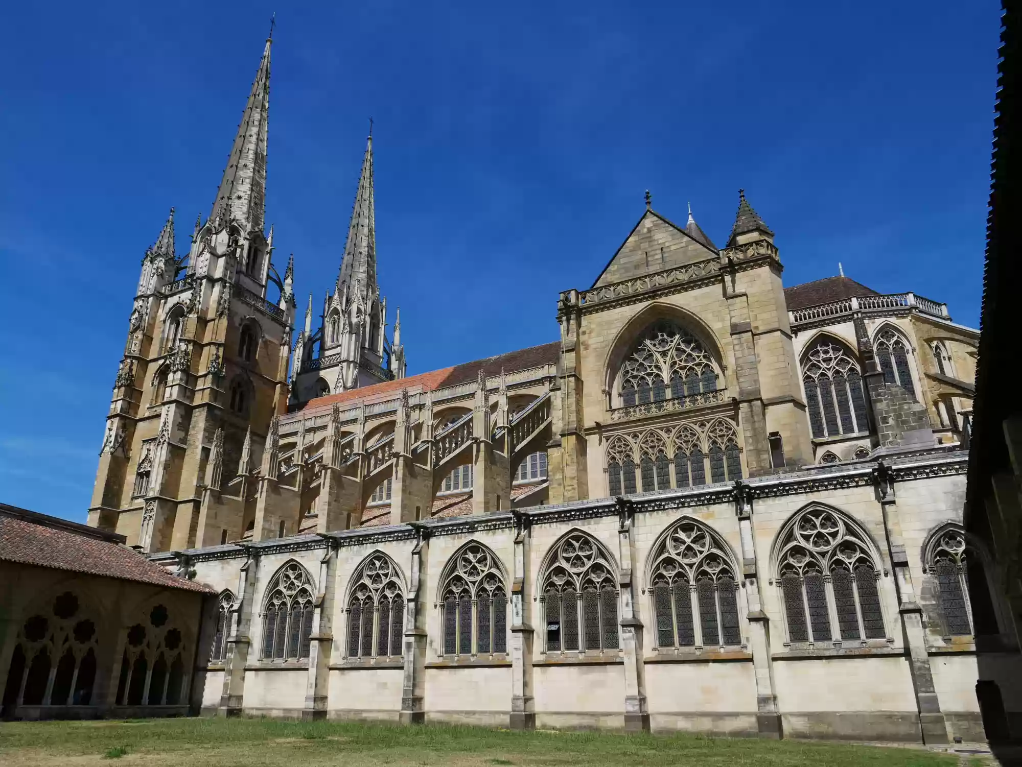 Cloister6 images Bayonne cathedral, 13-14th centuries, gothic. Bayonne cathedral, 13-14th centuries, gothic. Choir furniture, by Dominique Kaeppelin, 2003. Chapel. Canaanite stained-glass window, 1531, Renaissance. Healing of a daughter of a canaanite man by Jesus. Petit Bayonne Labels