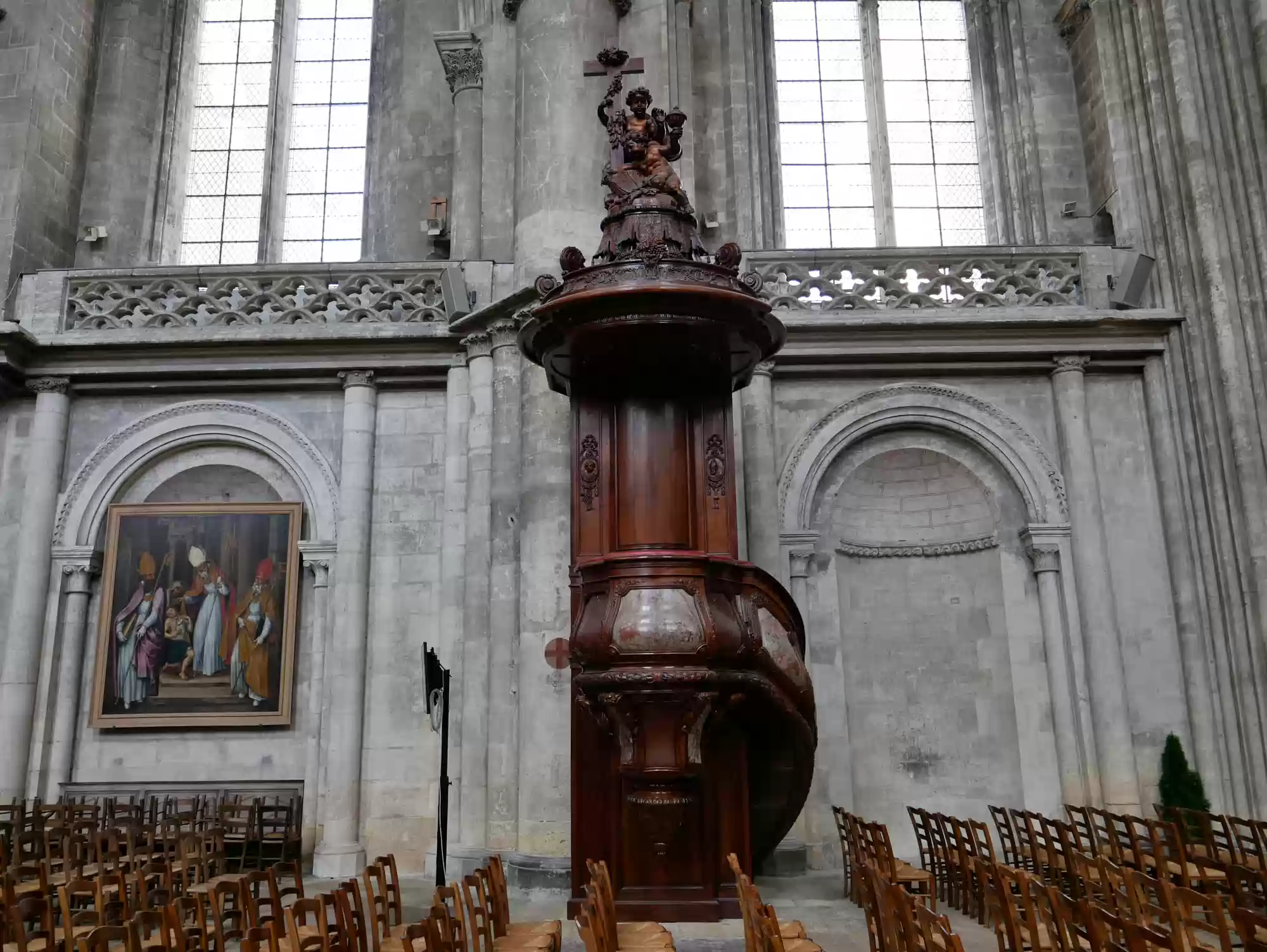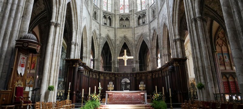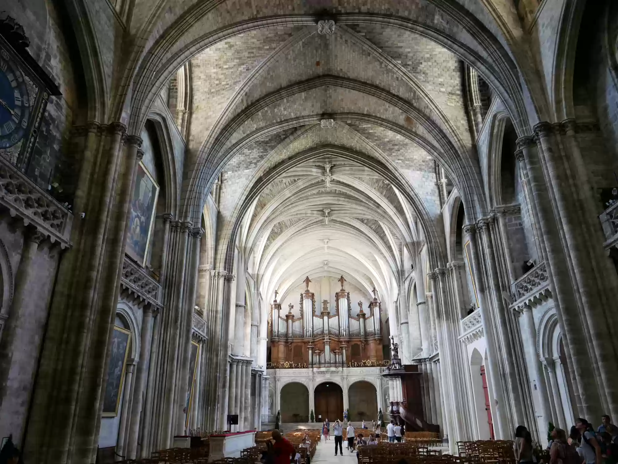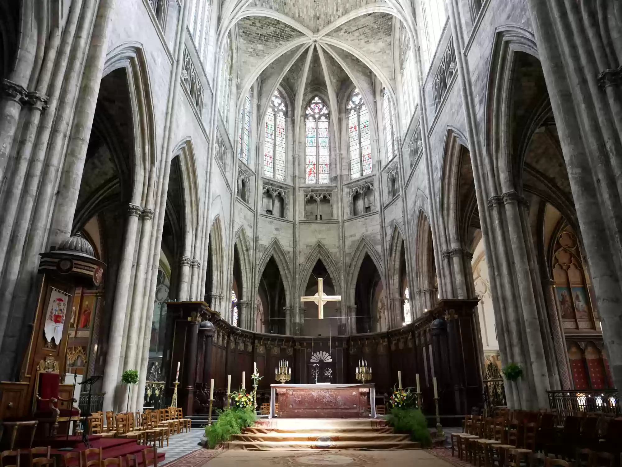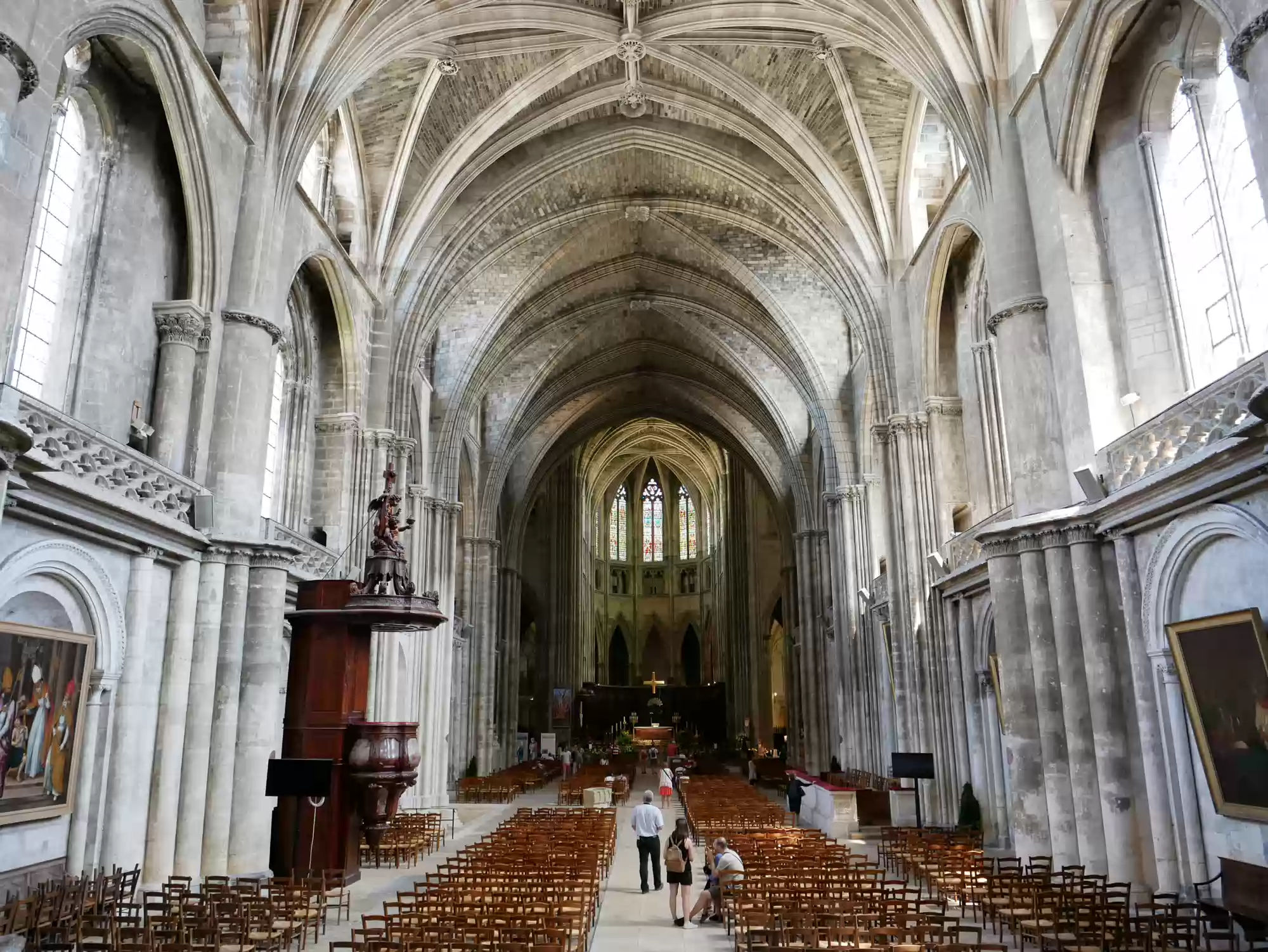 Nave, 2nd half of the 12th century. Nave, 2nd half of the 12th century. Choir, 1310-1330. Choir, 1310-1330. Choir. Saint Andrew. Saint Andrew. Mount Carmel chapel, wall paintings from 1861-1862. Mount Carmel chapel, wall paintings from 1861-1862. Mount Carmel chapel, wall paintings from 1861-1862. Saint Margaret chapel. Sacred heart chapel. Pey Berland tower Labels