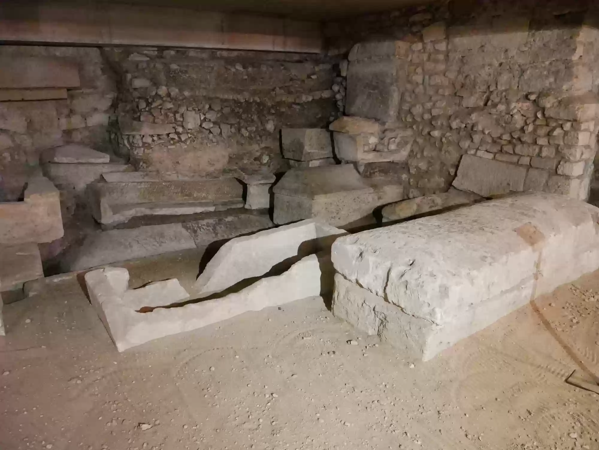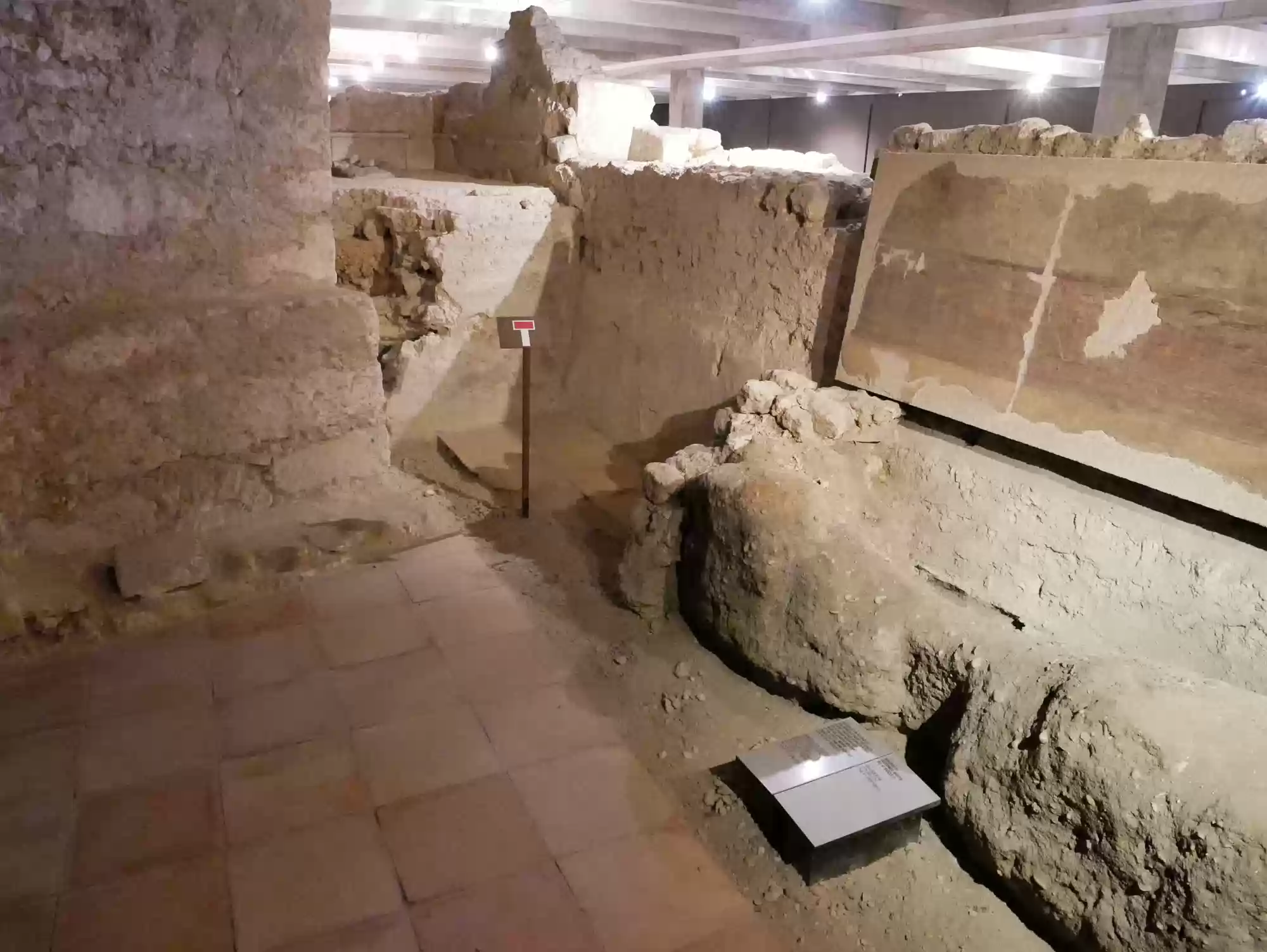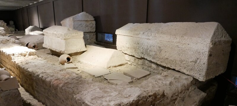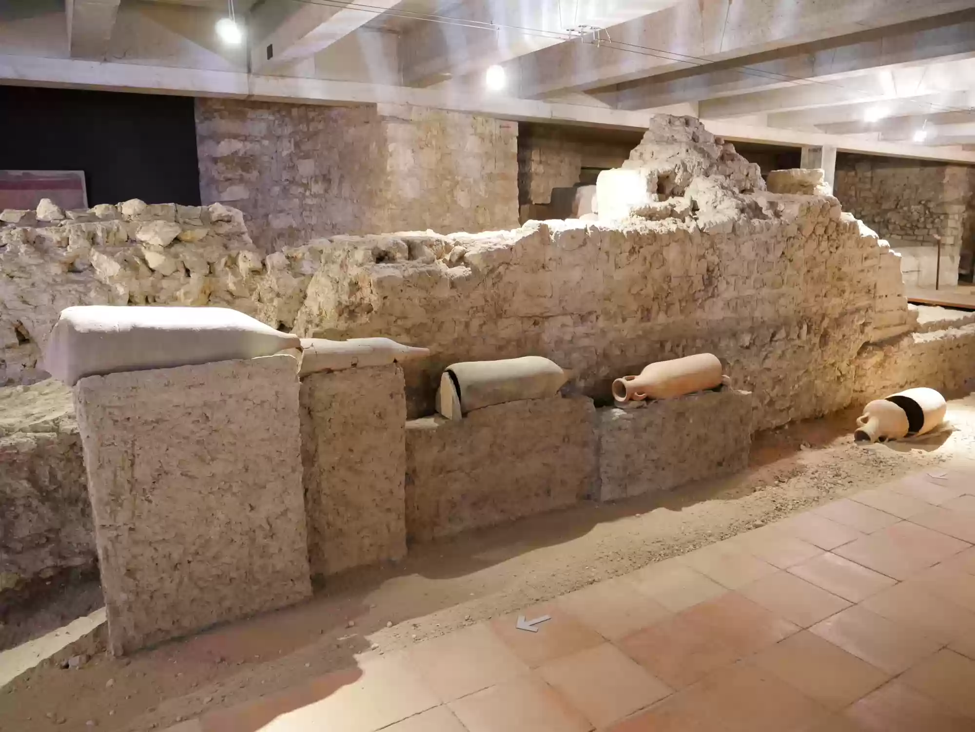 Paleochristian cemetery in the crypt of the church. 150 tombs were discovered. Foundation of a 4th-5th century building, maybe a church.