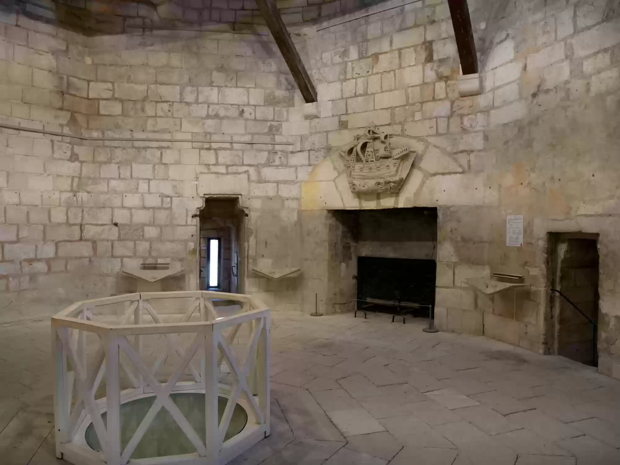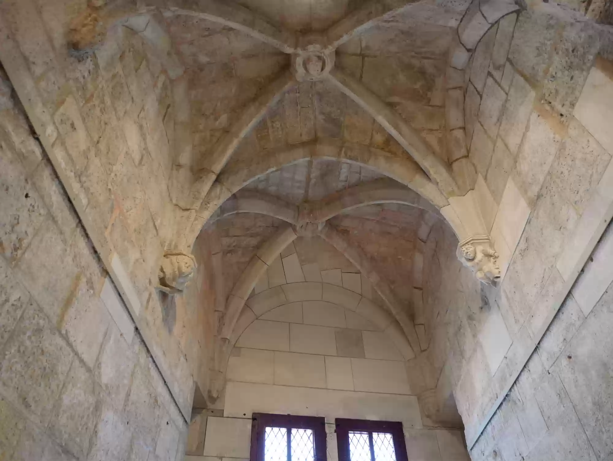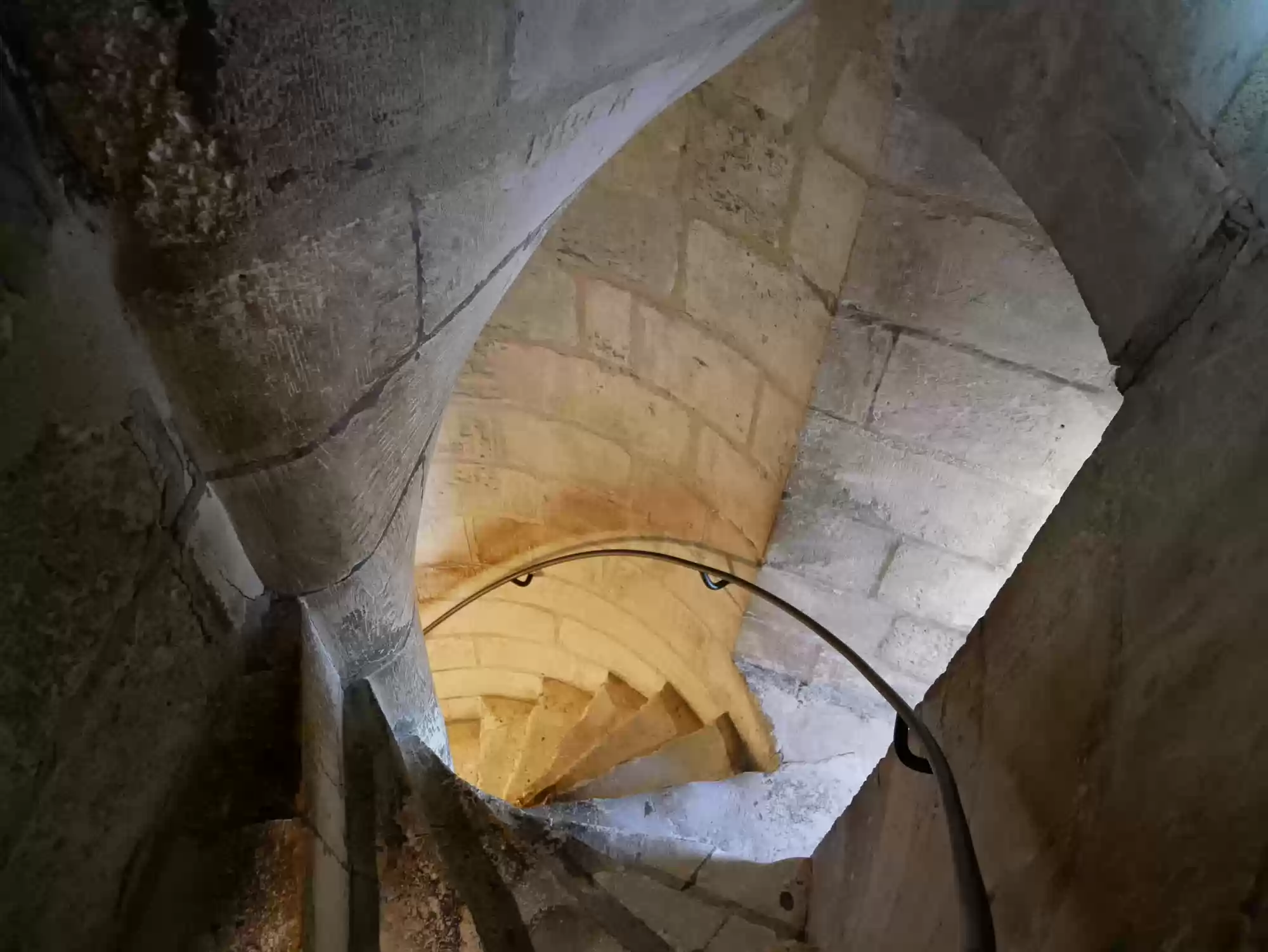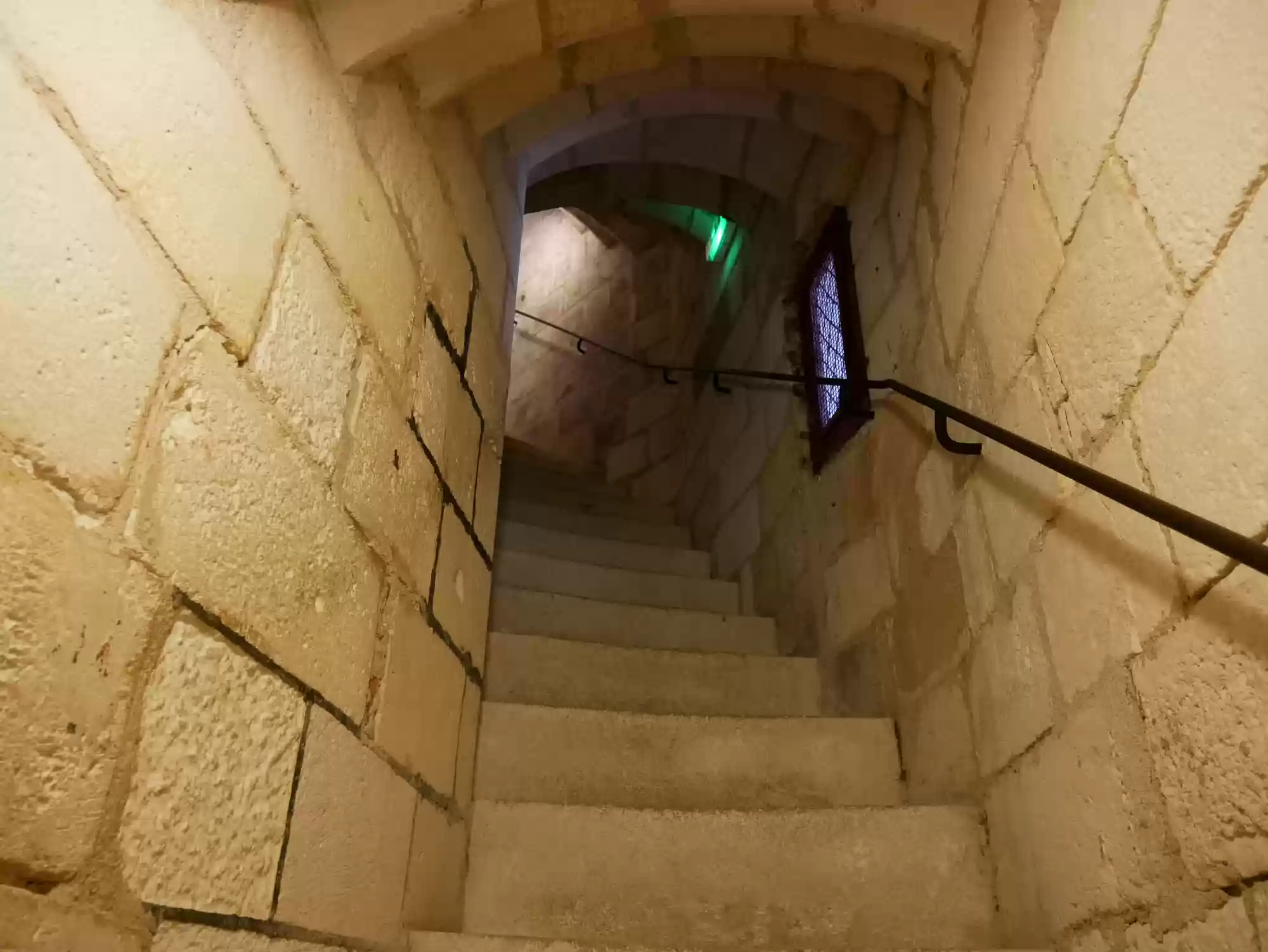 Double-helix staircase. The stairs are very steep as a second set of steps run in parallel in the same staircase. People can cross without seeing each other.
