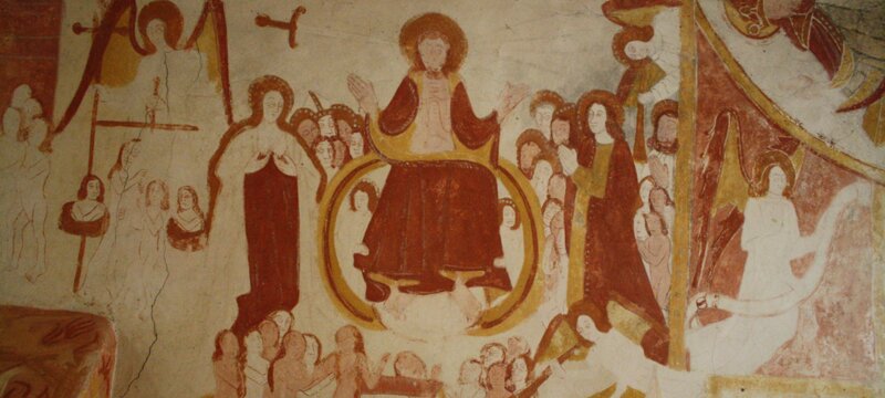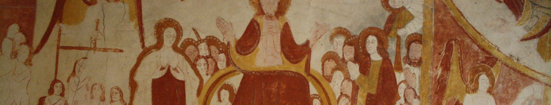 Notre Dame church, mainly romanesque, possibly built in 1184 (gothic steeple, 13th century). Notre Dame church, mainly romanesque. The shelter on the right side was added in the 18th century as a place for public gatherings. Wall paintings, mainly from the 14th century. Wall paintings, mainly from the 14th century. Wall paintings, mainly from the 14th century. Entombment of Christ. Wall paintings, mainly from the 14th century. Wall paintings, mainly from the 14th century. Choir, 15th century. Wall paintings, late 15th century. Wall paintings, late 15th century. Wall paintings, late 15th century. Wall paintings, late 15th century. Last judgment. Jesus carrying his cross. Scenes from the life of Jesus. The last supper. Lantern of the dead, 13th century. The lanterns were installed in cemeteries; a light was set at the top of of lantern. Lantern of the dead, 13th century. The lanterns were installed in cemeteries; a light was set at the top of of lantern. Labels