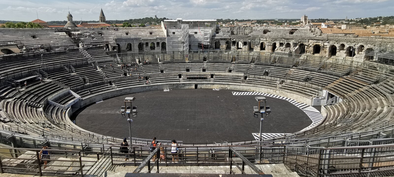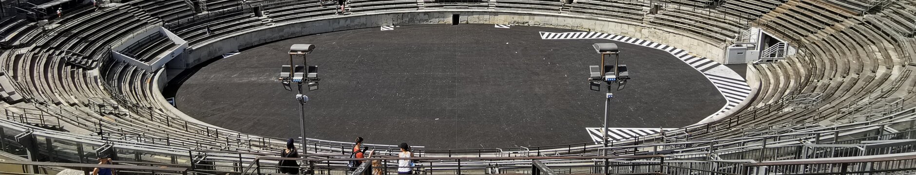 Nimes arena, 90-120 AD, 133x101x21 meters (external), 69x38 meters (arena). La Fontaine gardens Labels