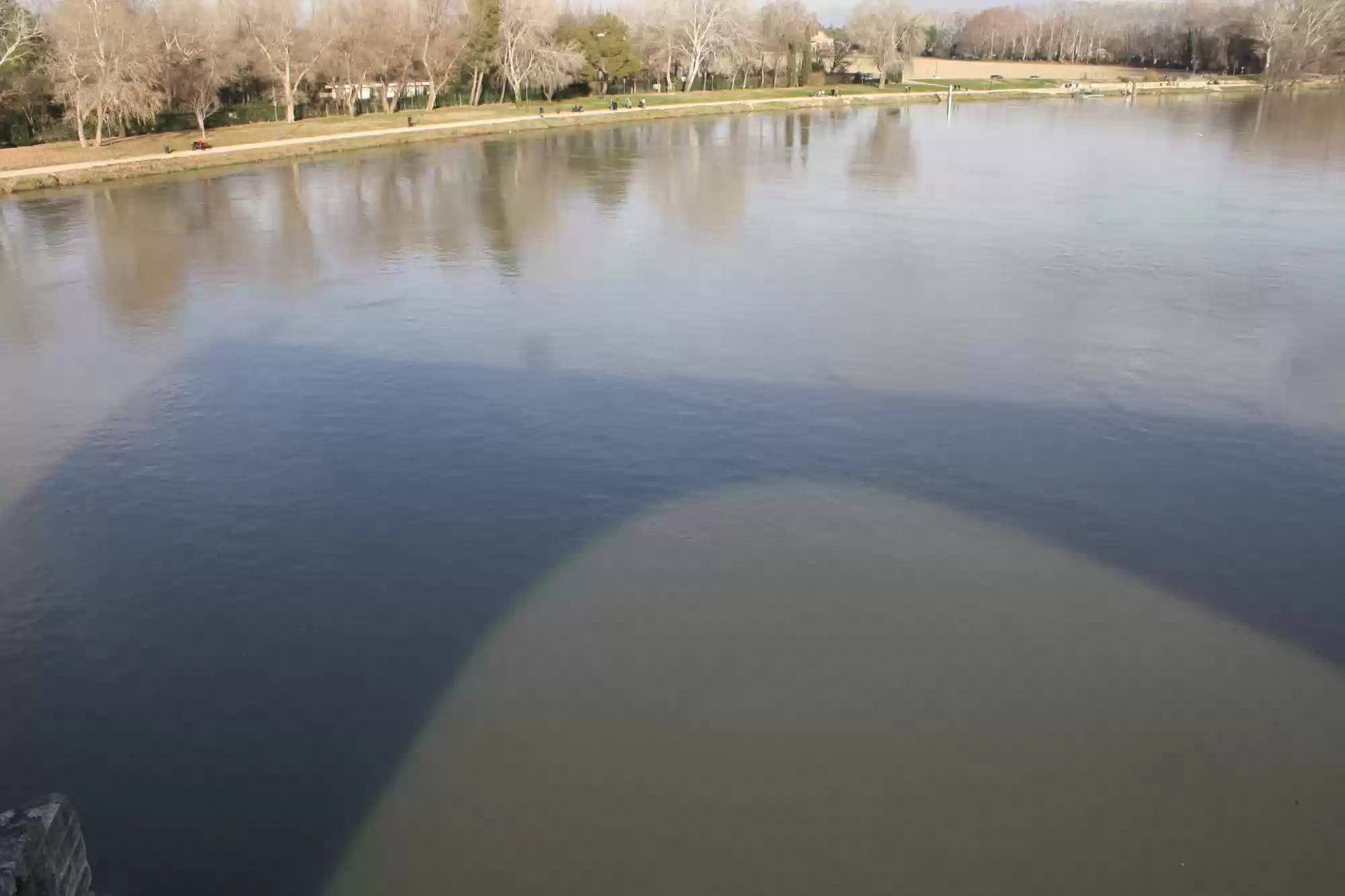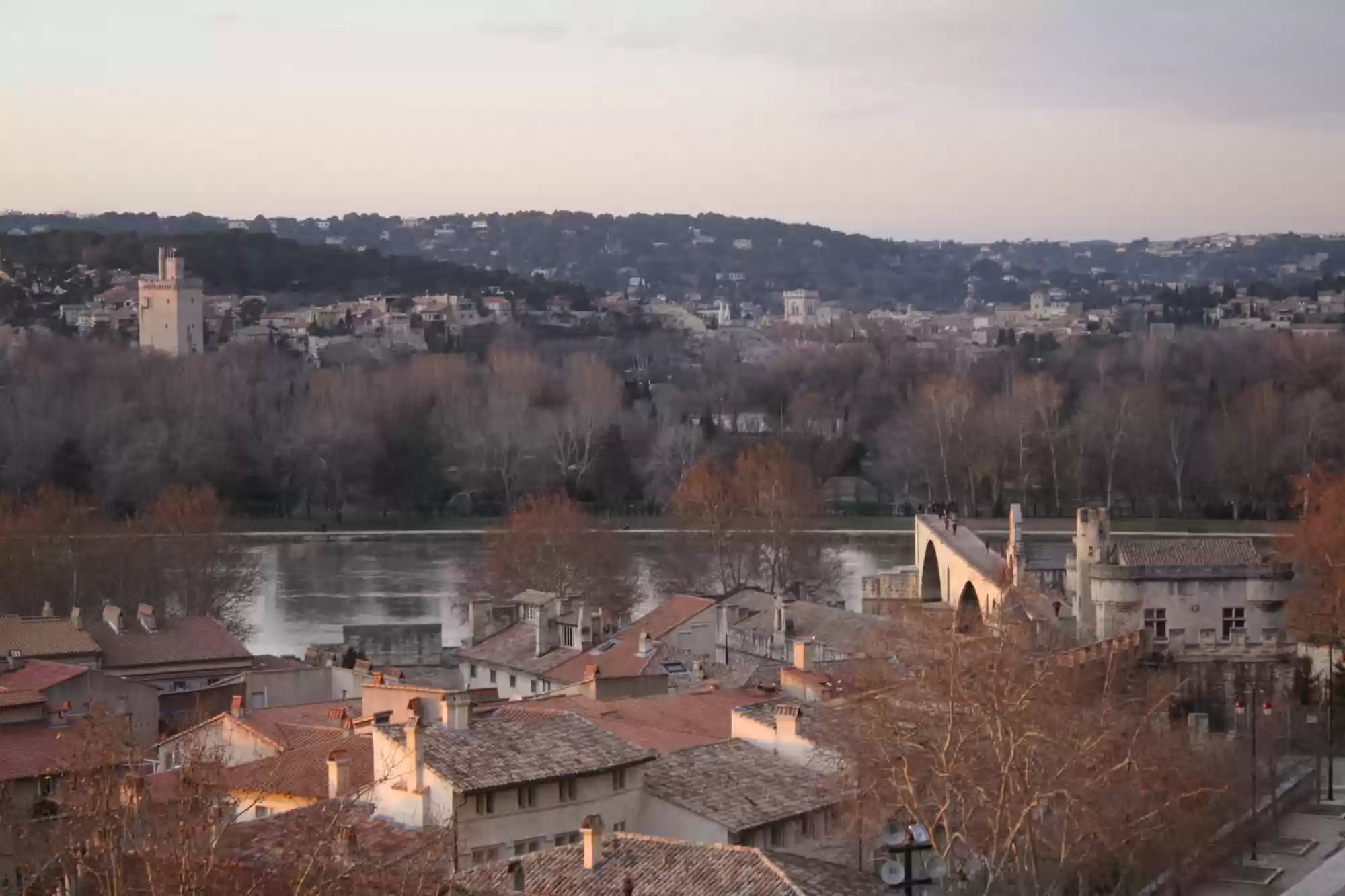 Rhône river, with the partly destroyed Saint Bénézet bridge and Villeneuve-les-Avignon across the river. The tower on the righ side of the…