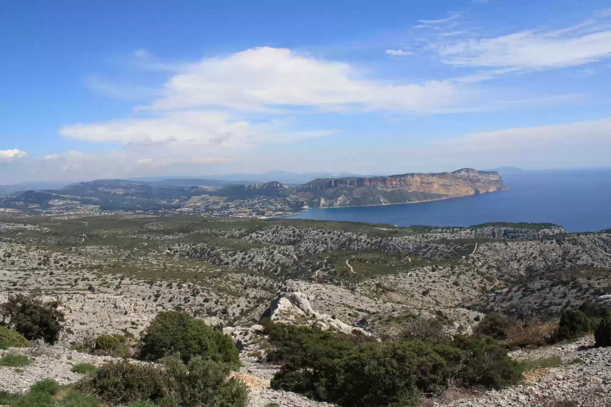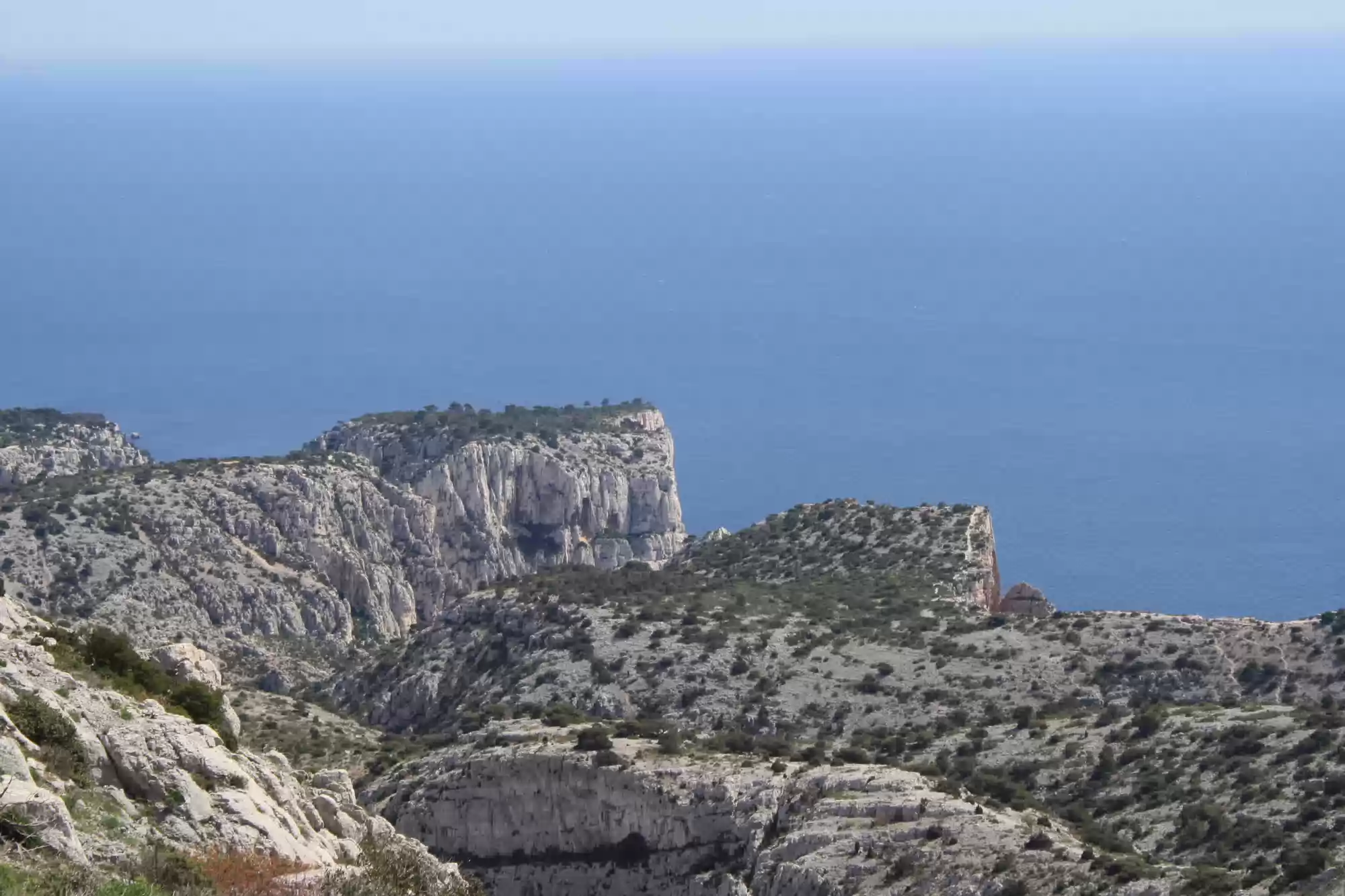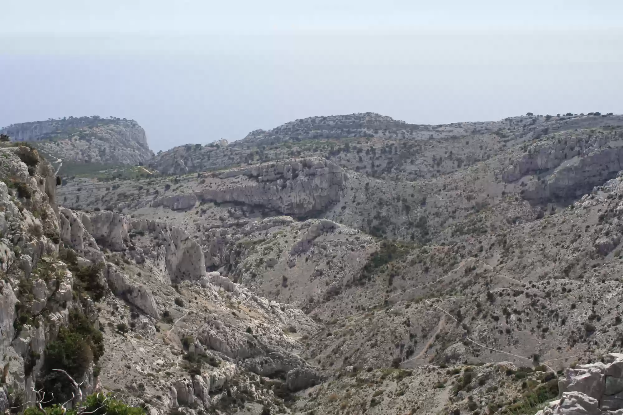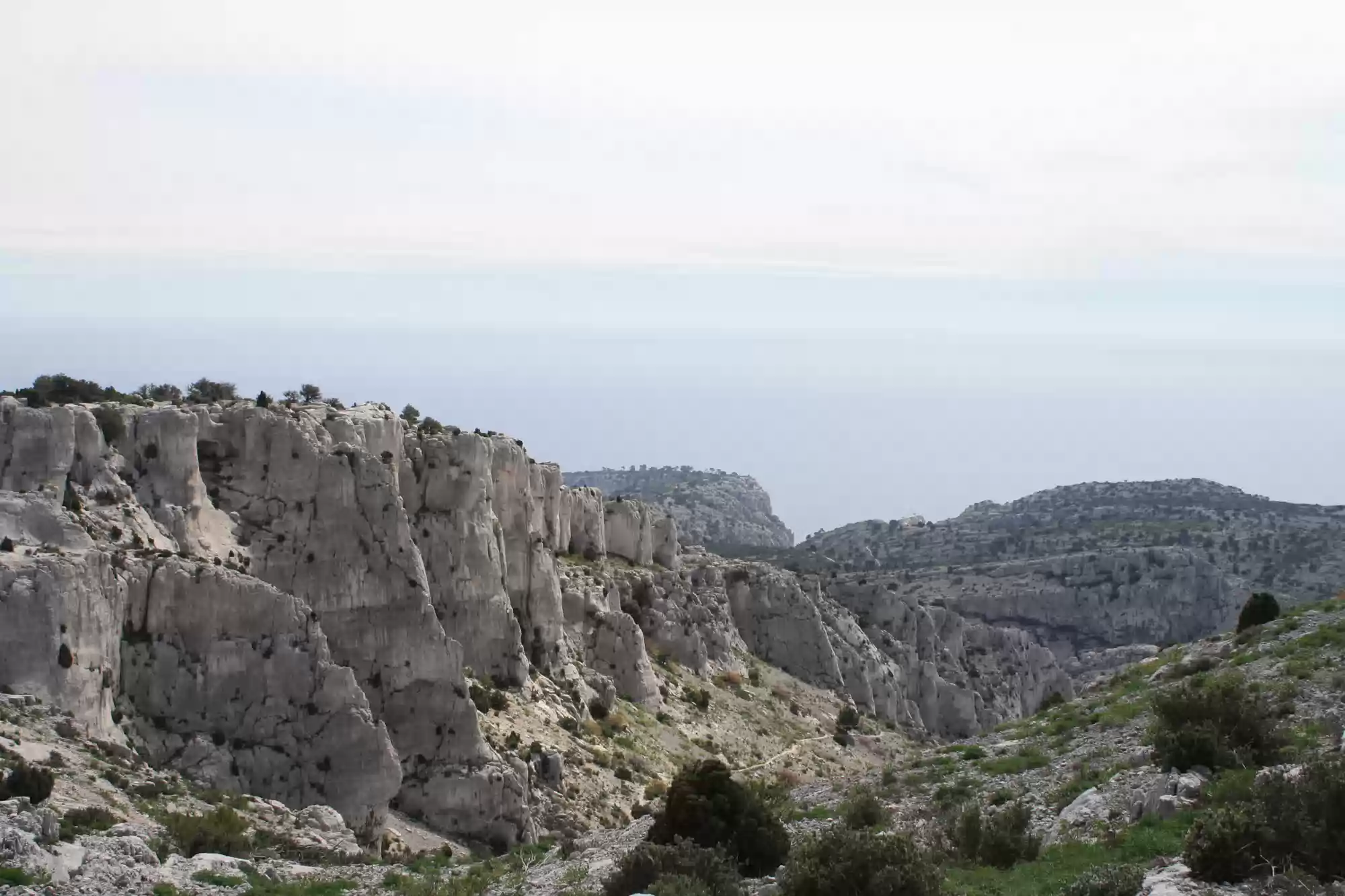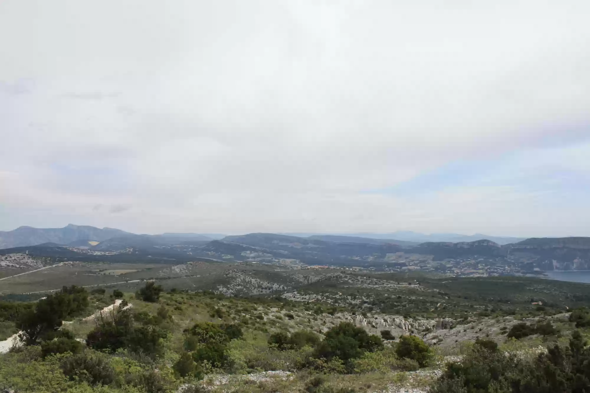 Landscapes of mountain and garrigue (low vegetation that can grow in dry areas in the Mediterranean territories). The whiter area on the mountain (center-right) burned down and has not fully regrown yet. Marseilles. Cassis. SormiouCassis Labels