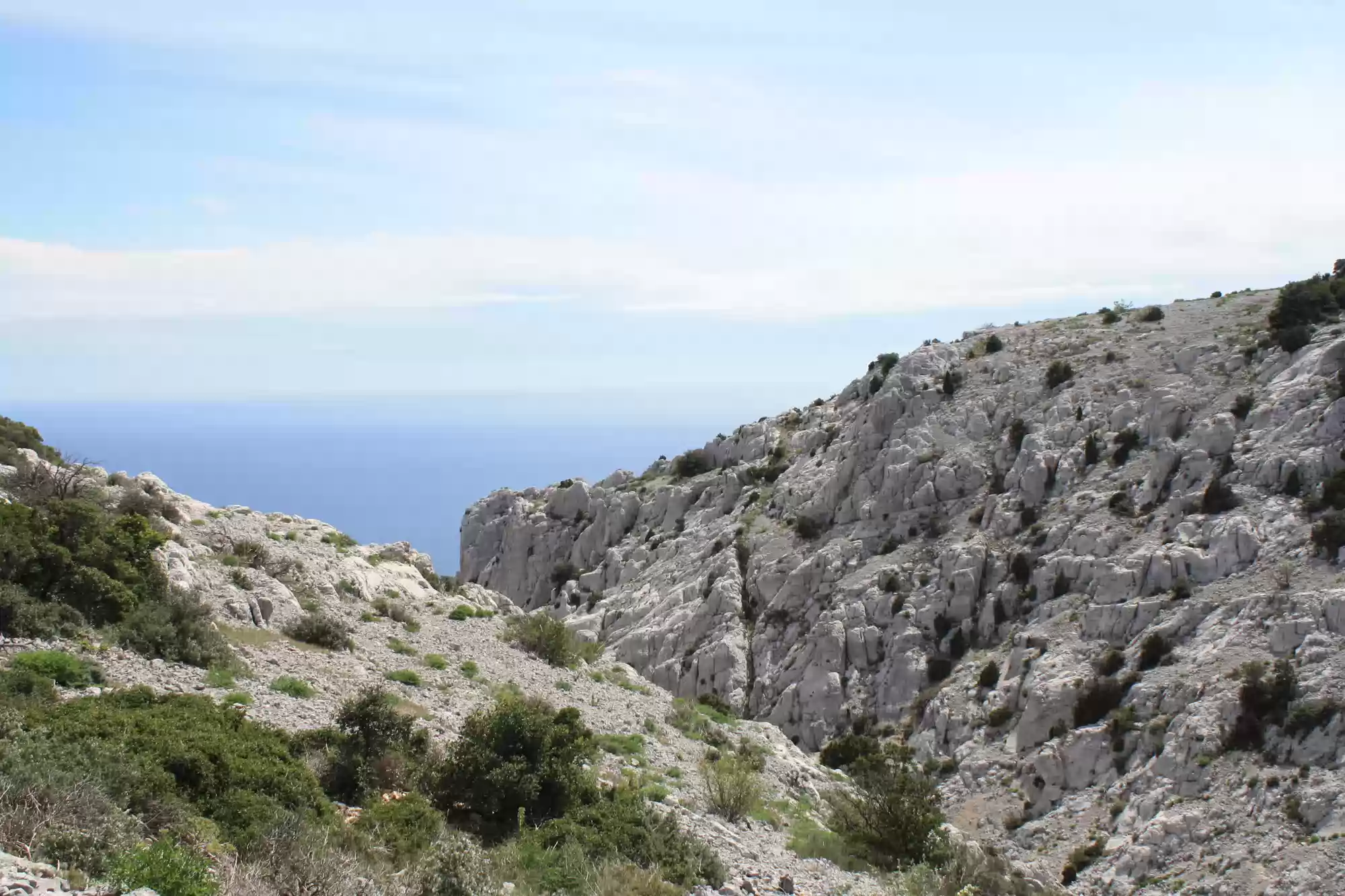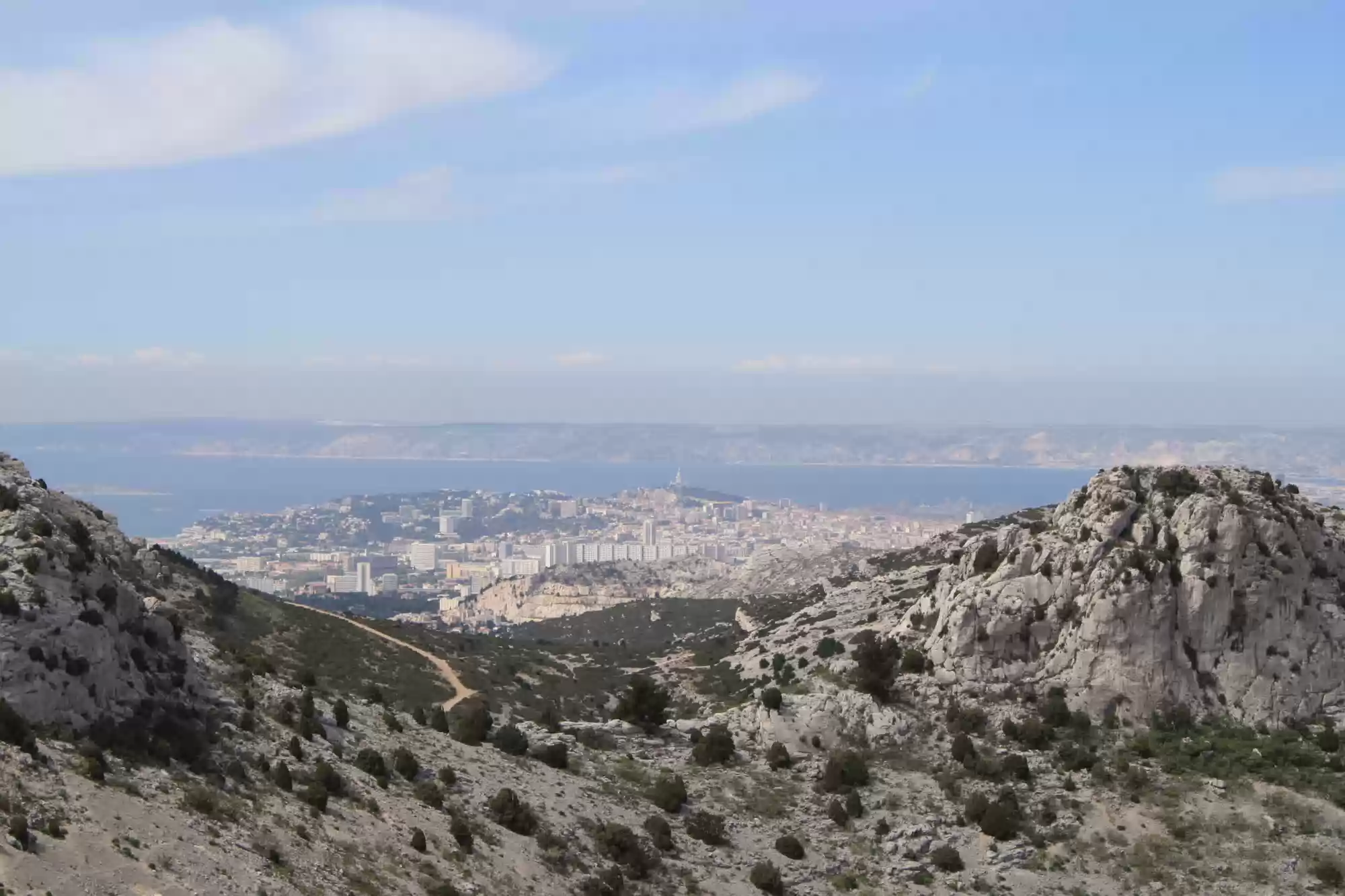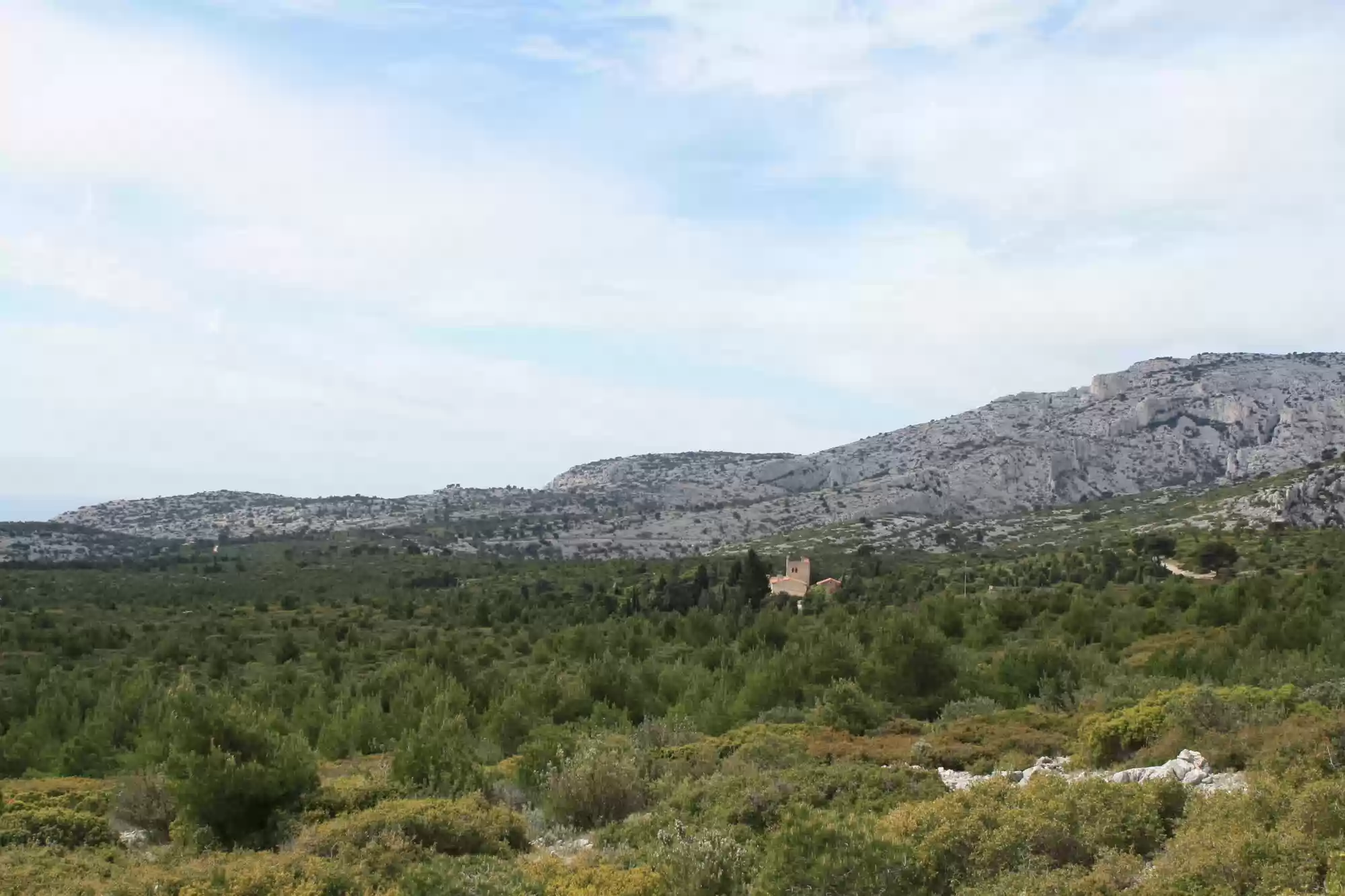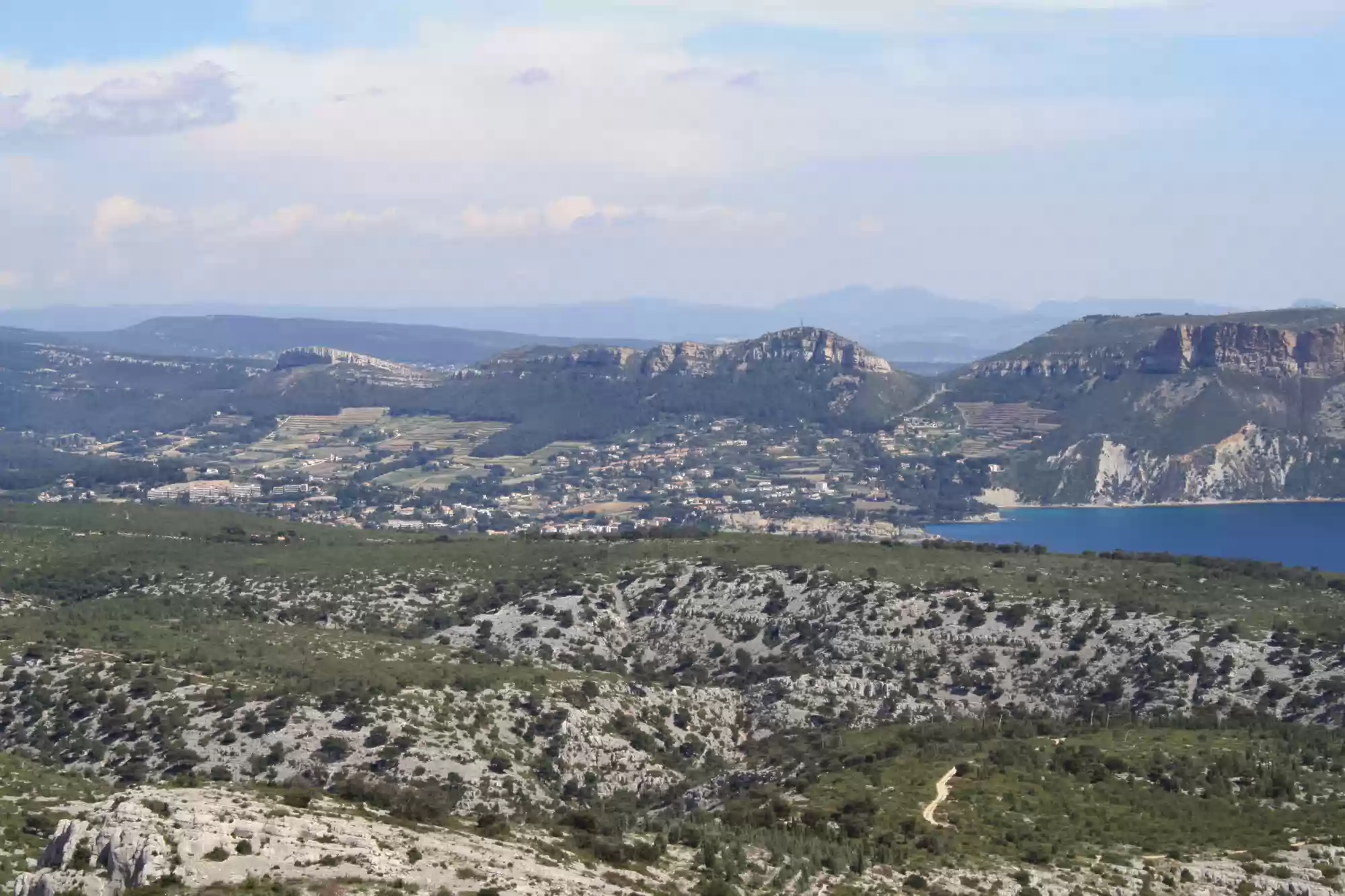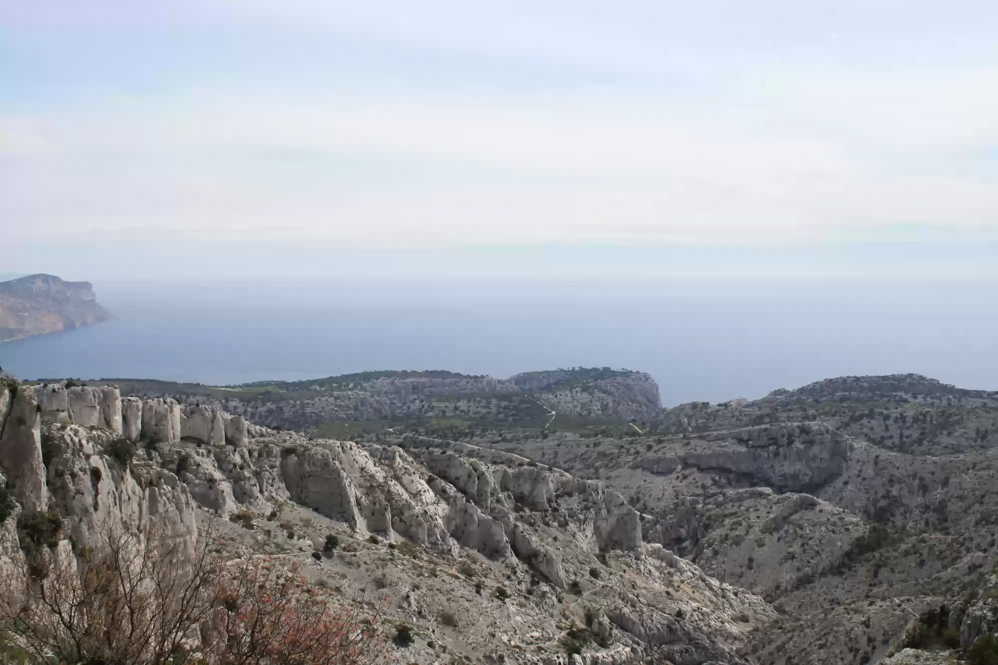 Landscapes of mountain and garrigue (low vegetation that can grow in dry areas in the Mediterranean territories). The whiter area on the mountain (center-right) burned down and has not fully regrown yet. Marseilles. Cassis. SormiouCassis Labels