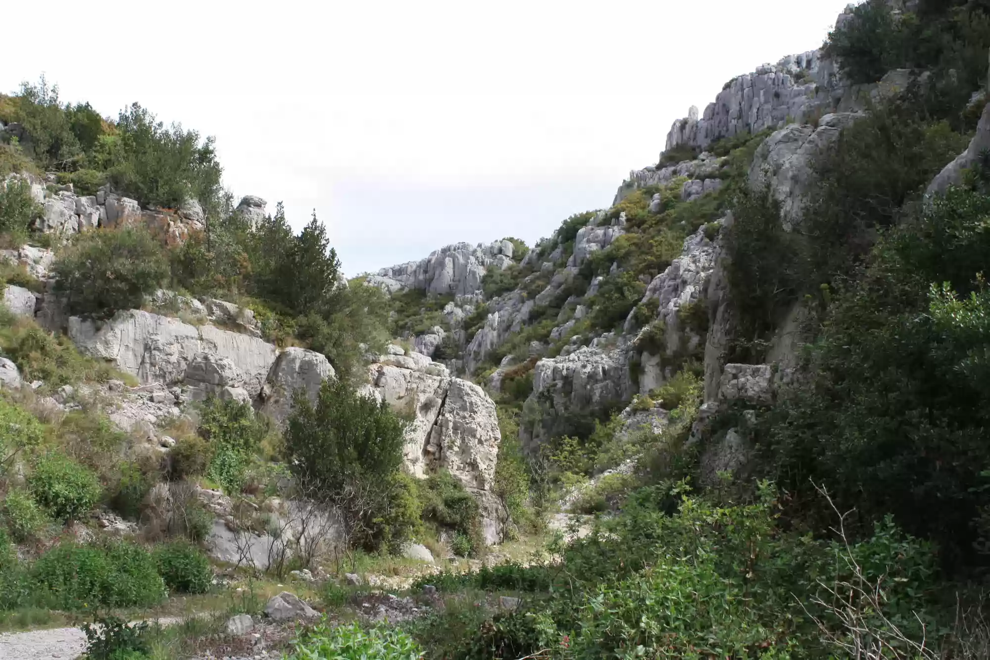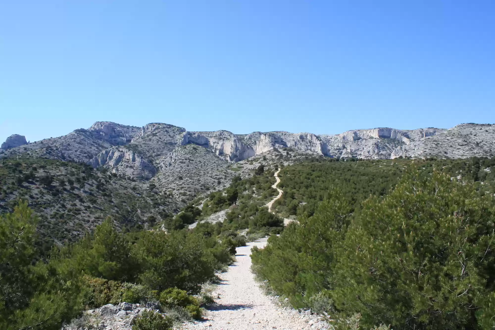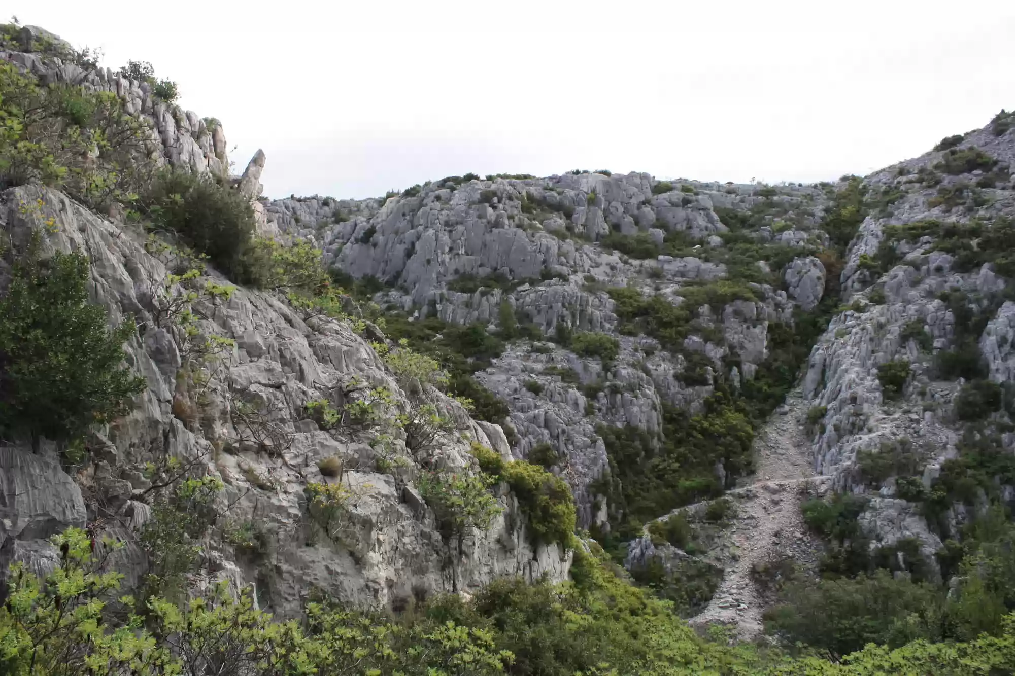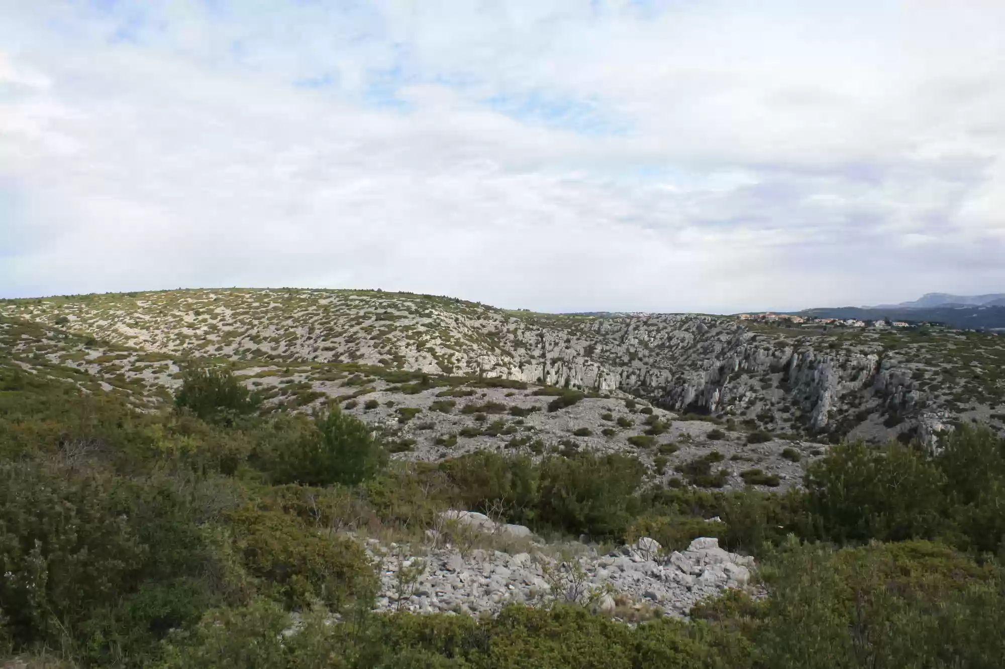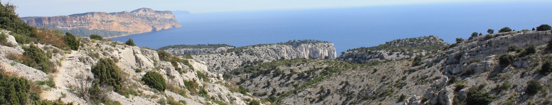 Landscapes of mountain and garrigue (low vegetation that can grow in dry areas in the Mediterranean territories). The whiter area on the mountain (center-right) burned down and has not fully regrown yet. Marseilles. Cassis. SormiouCassis Labels