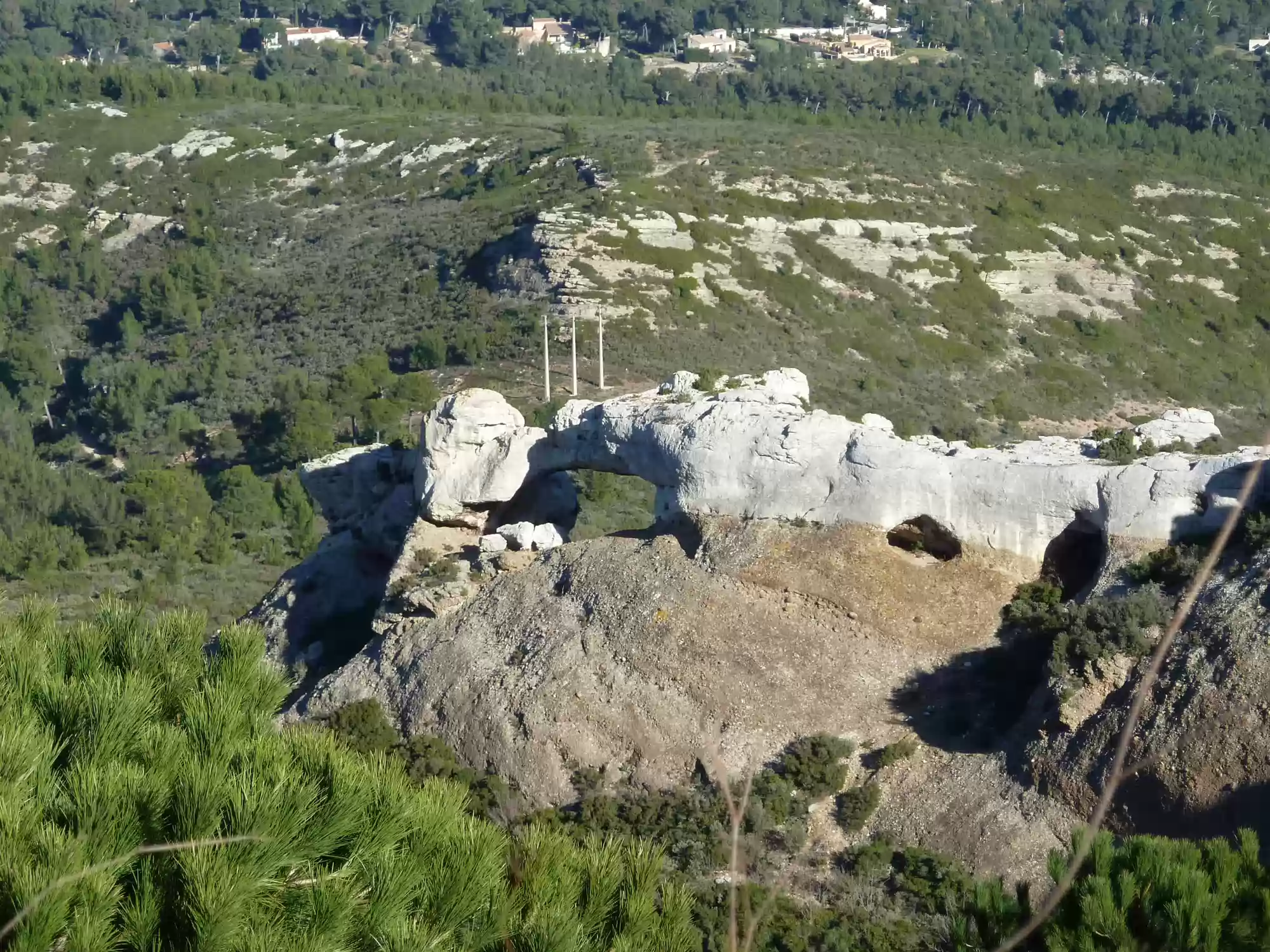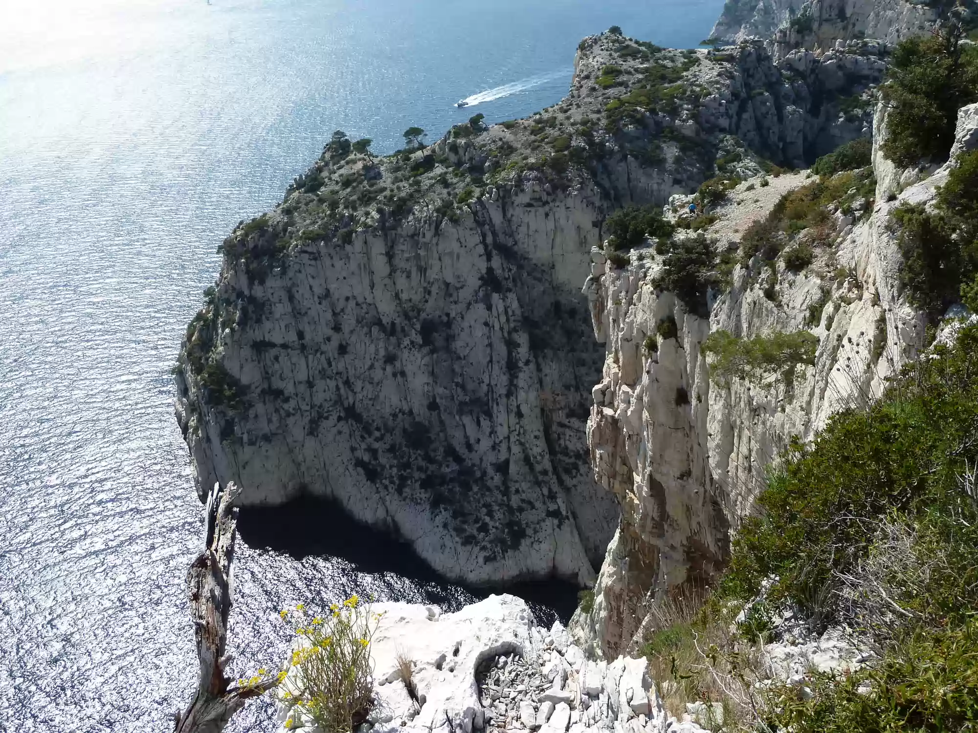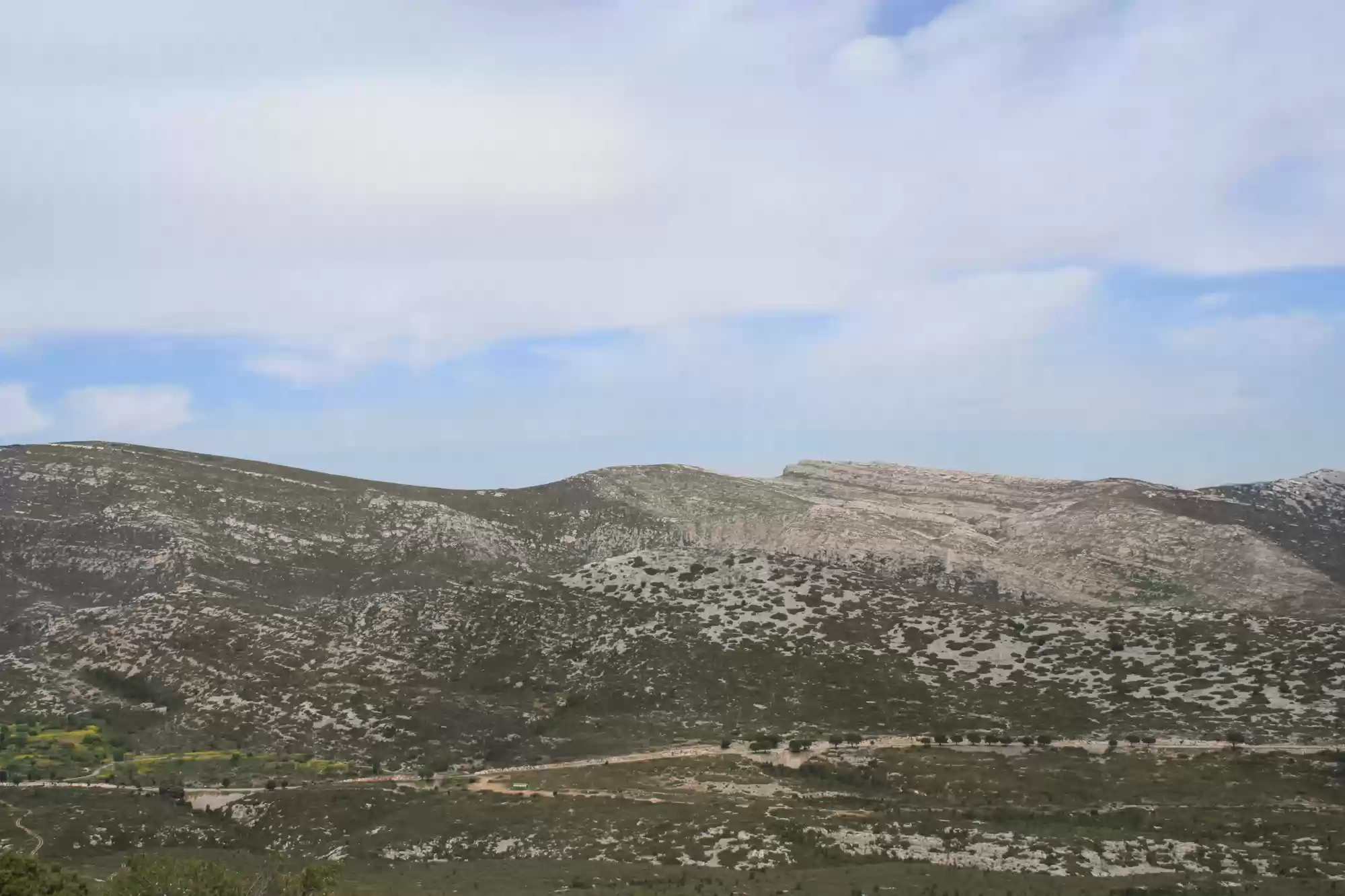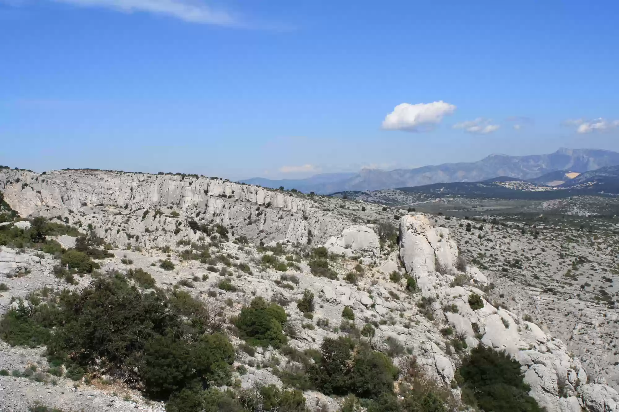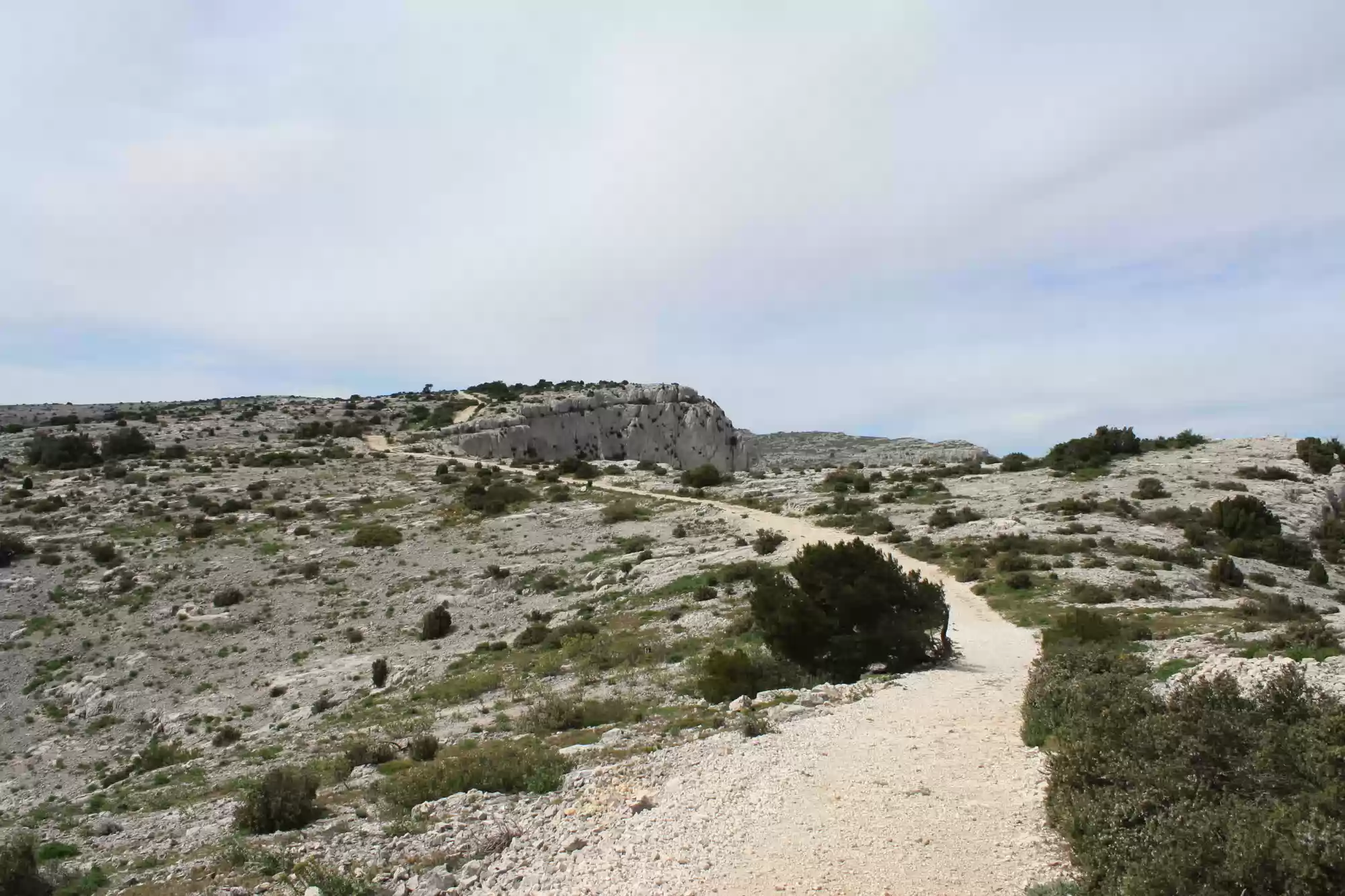 Landscapes of mountain and garrigue (low vegetation that can grow in dry areas in the Mediterranean territories). The whiter area on the mountain (center-right) burned down and has not fully regrown yet. Marseilles. Cassis. SormiouCassis Labels