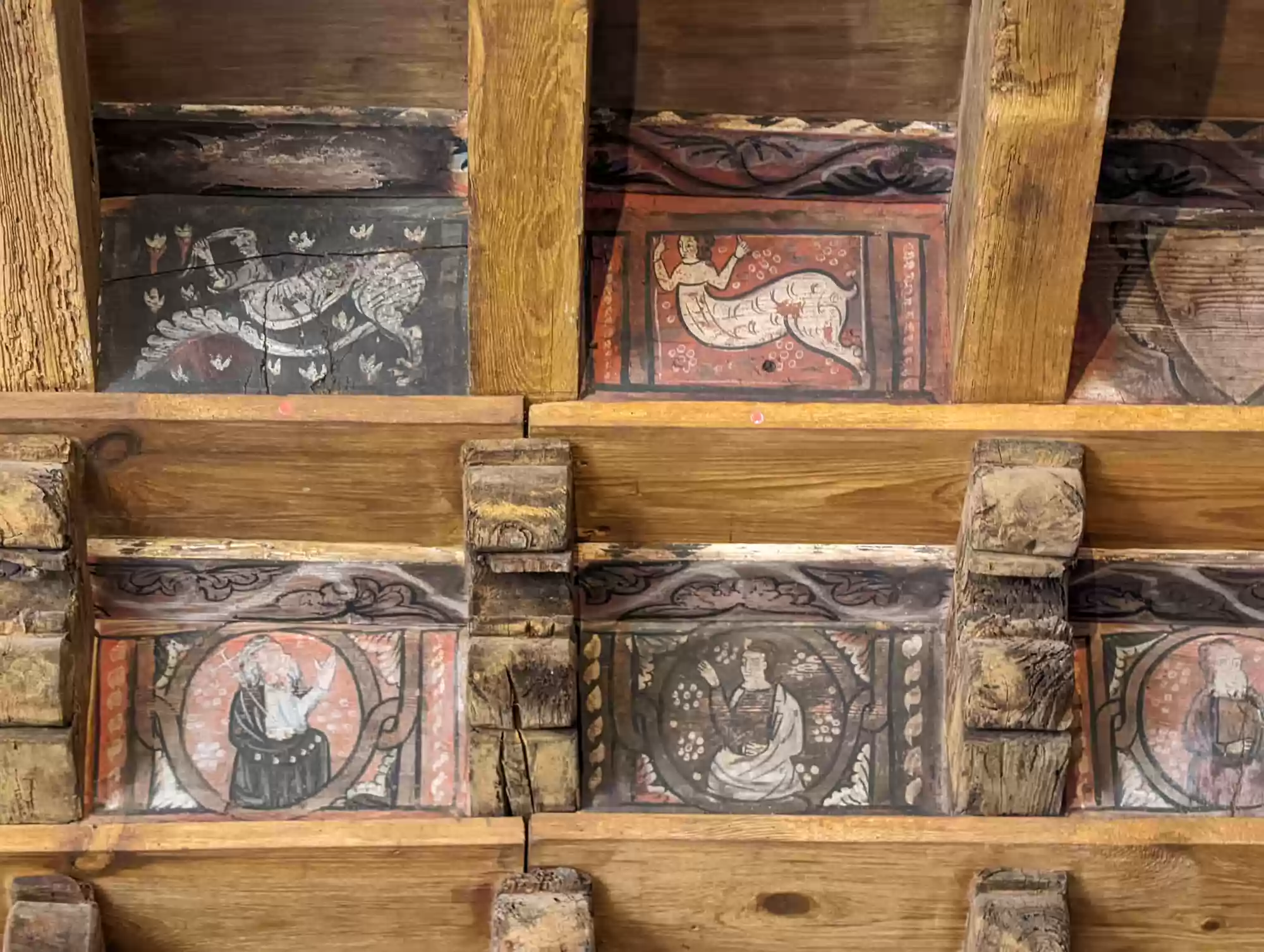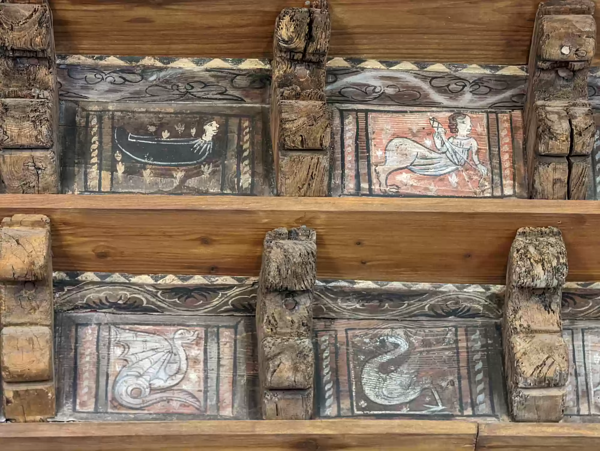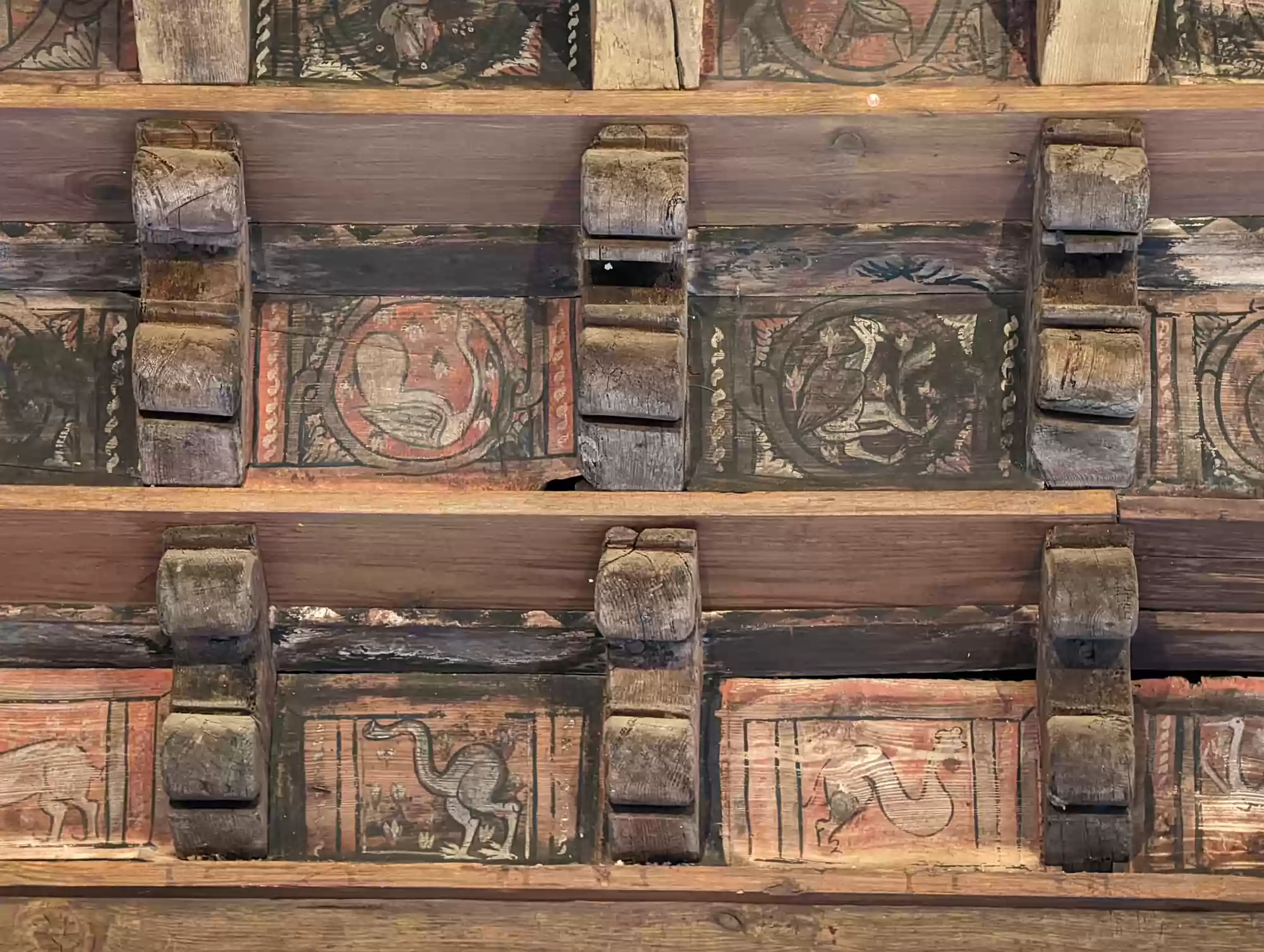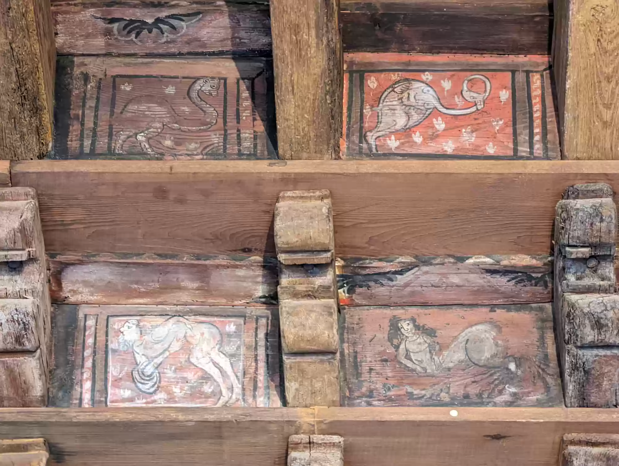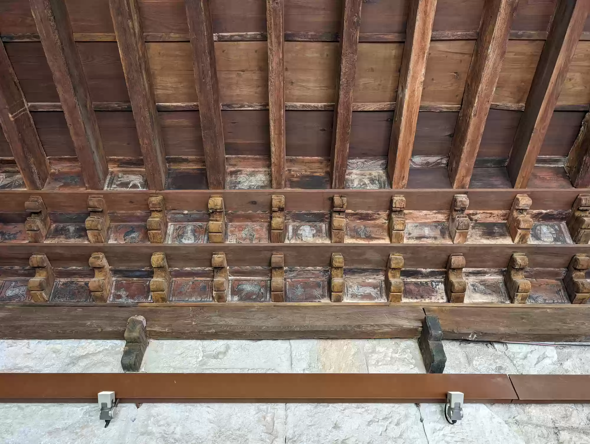 PXL_20240615_105221218 The ceiling was made in larch wood from Alpine forests, a type of wood that is said not to rot. Originally, 1200 small panels were painted, out of which 300...