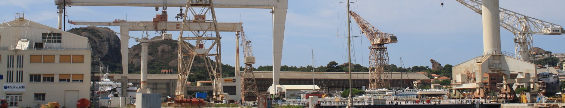 The former shipyards. The naval shipyards which once ensured the wealth of La Ciotat were closed in 1986. Crane used from 1907 to 1986 to move merchandise arriving on a railtrack along the old harbor to another railtrack leading to the naval shipyards. Naval shipyards. Mugel Park Labels