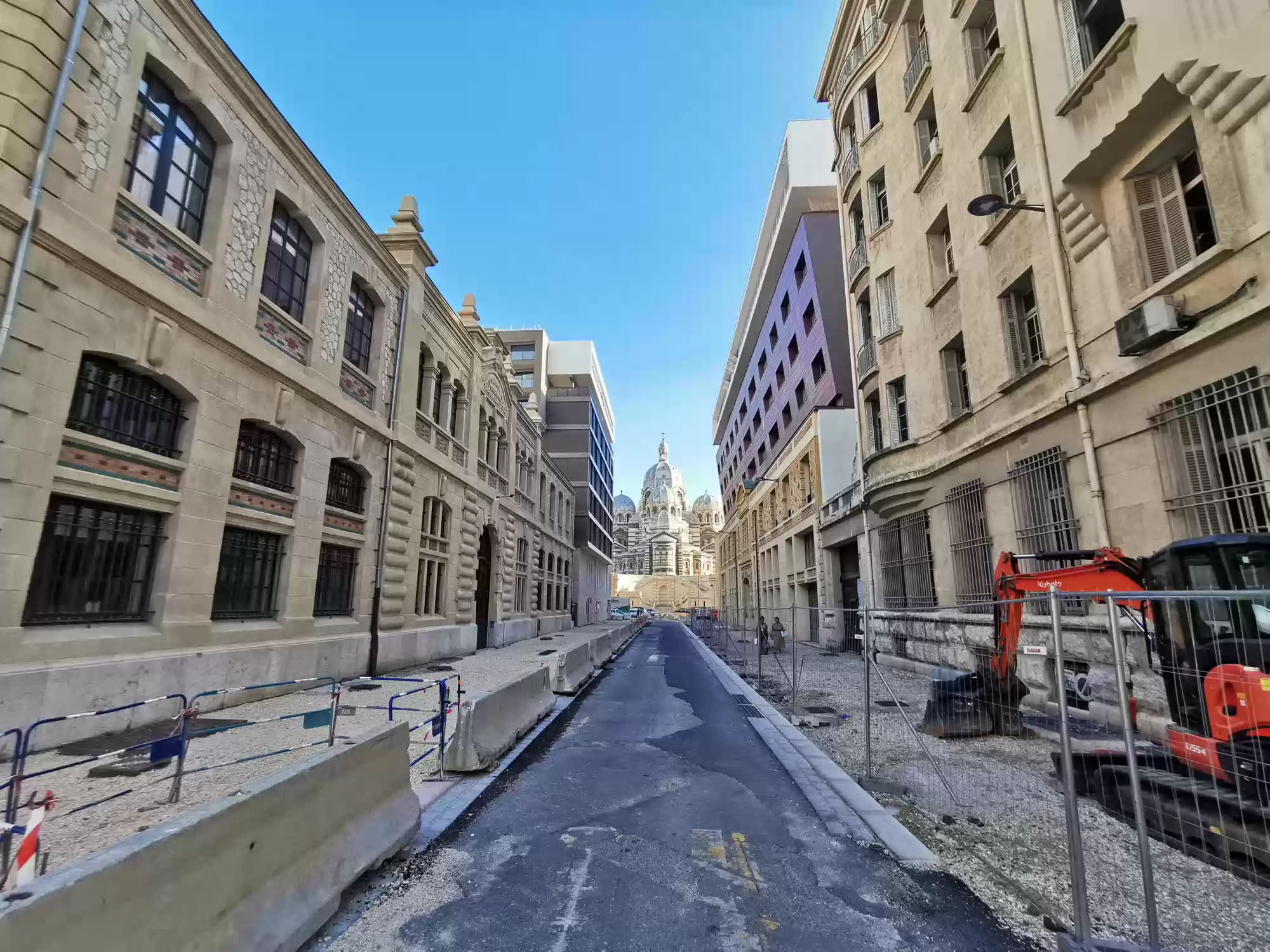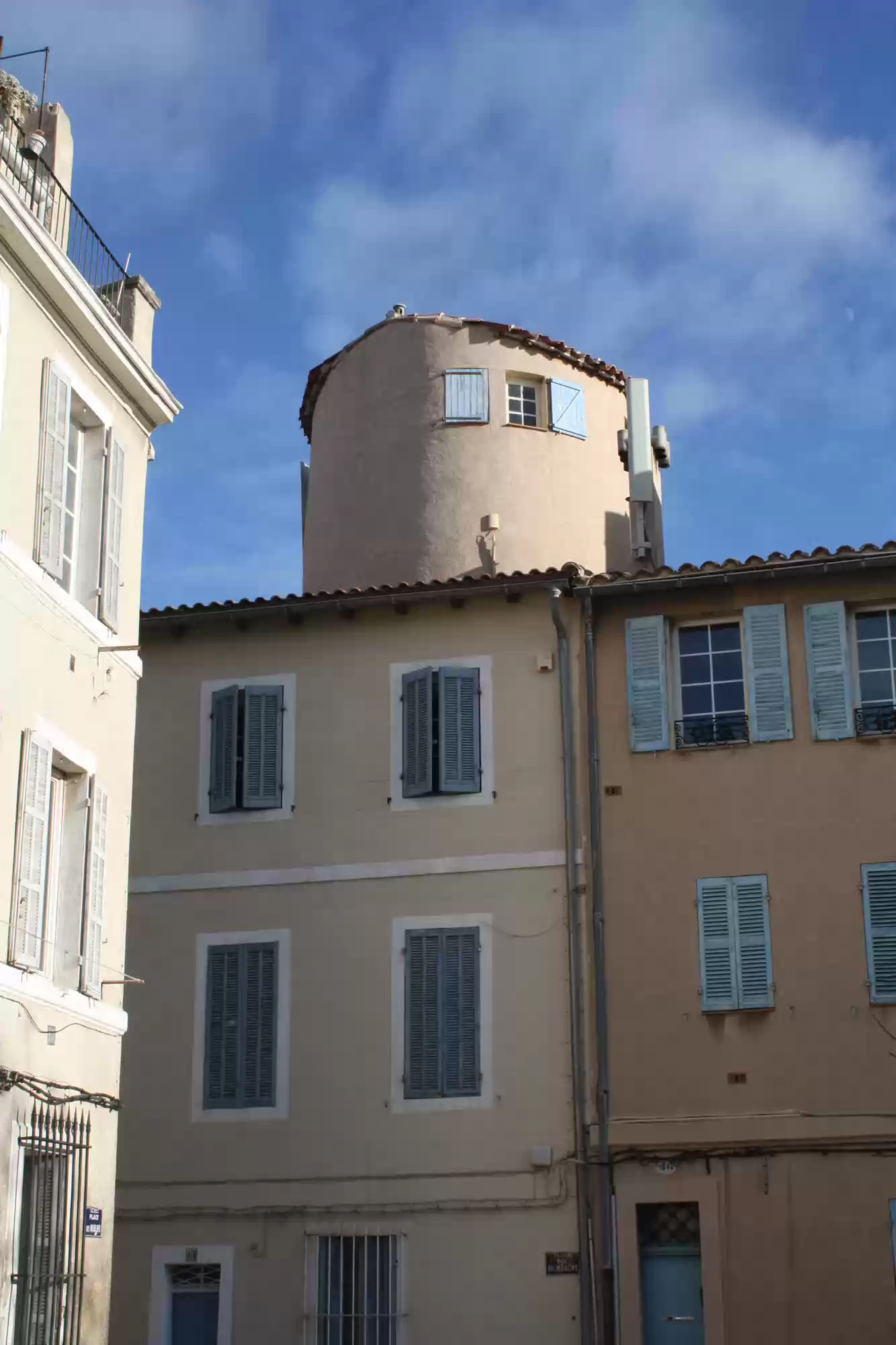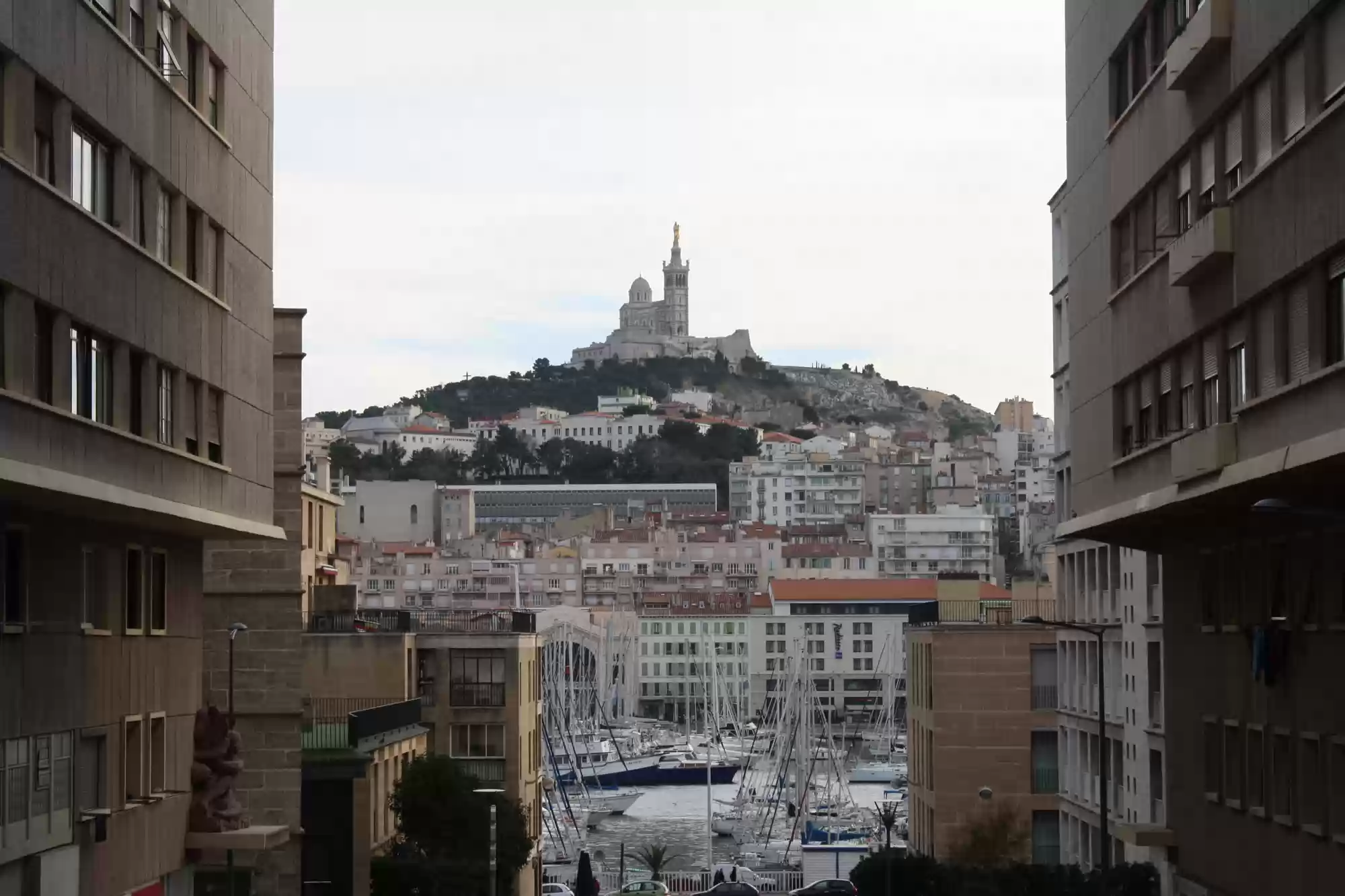 Notre-Dame-De-La-Garde seen behind reconstructed buildings from the 1940s, following the World War II destructions.