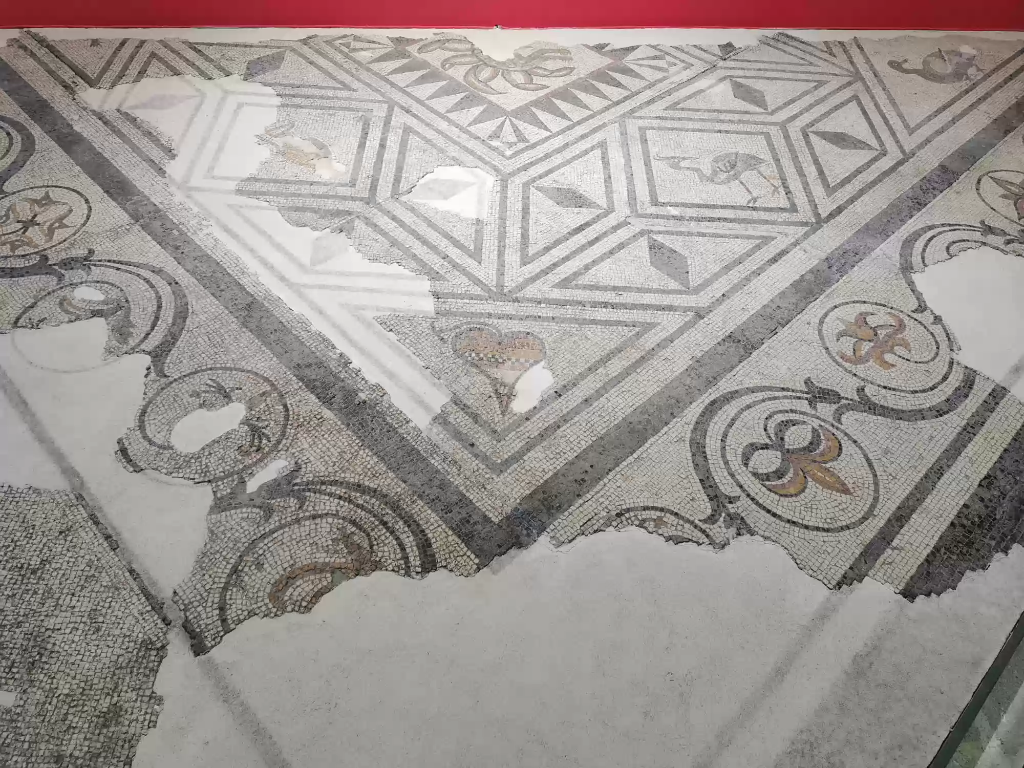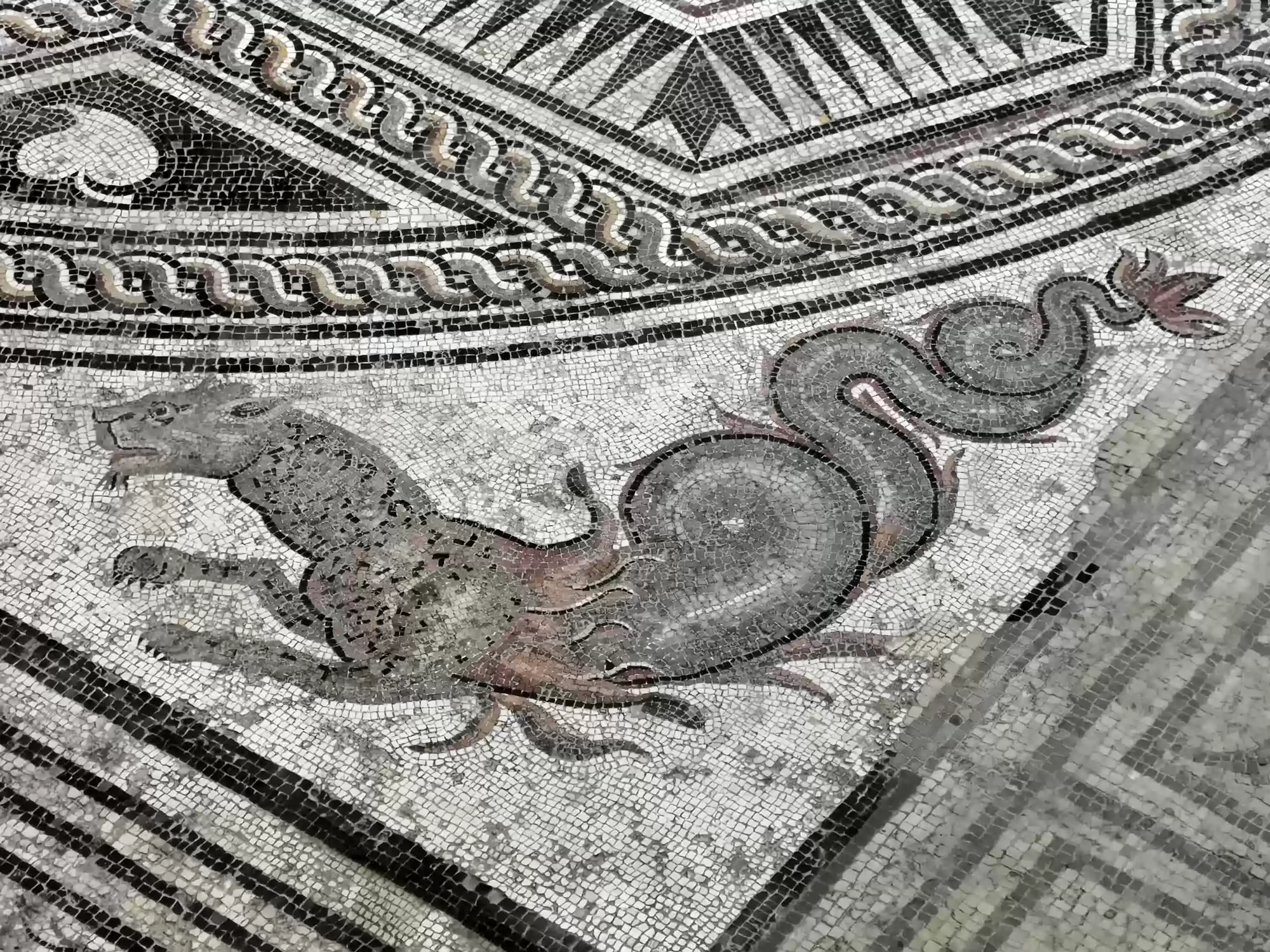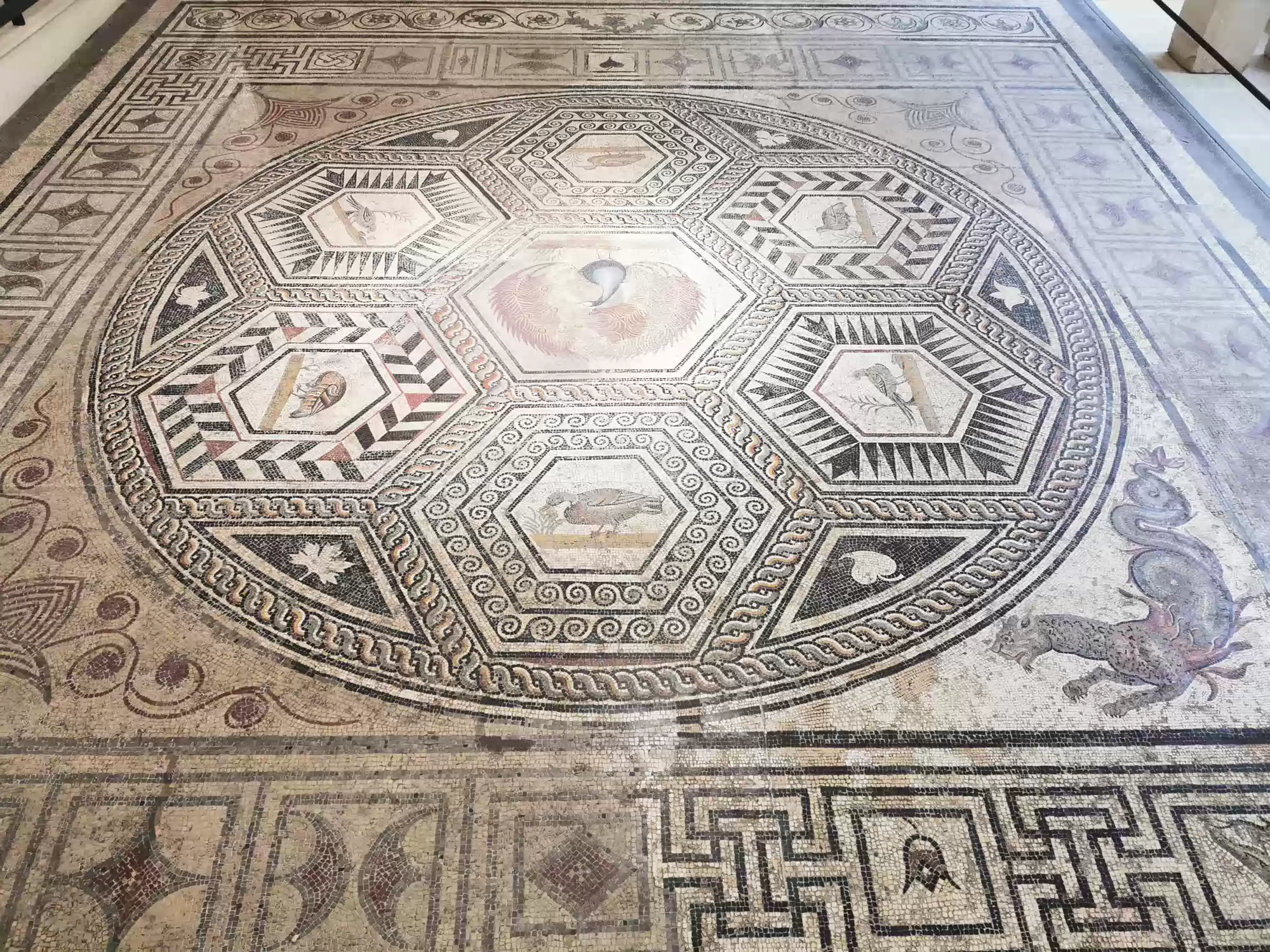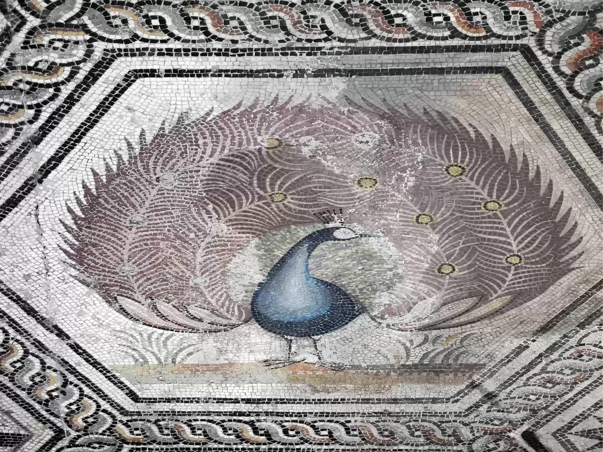 This mosaic is one of the six polychrom pavings (200 m2 of decor) in the Peacock domus, a large house (middle of Ile century…