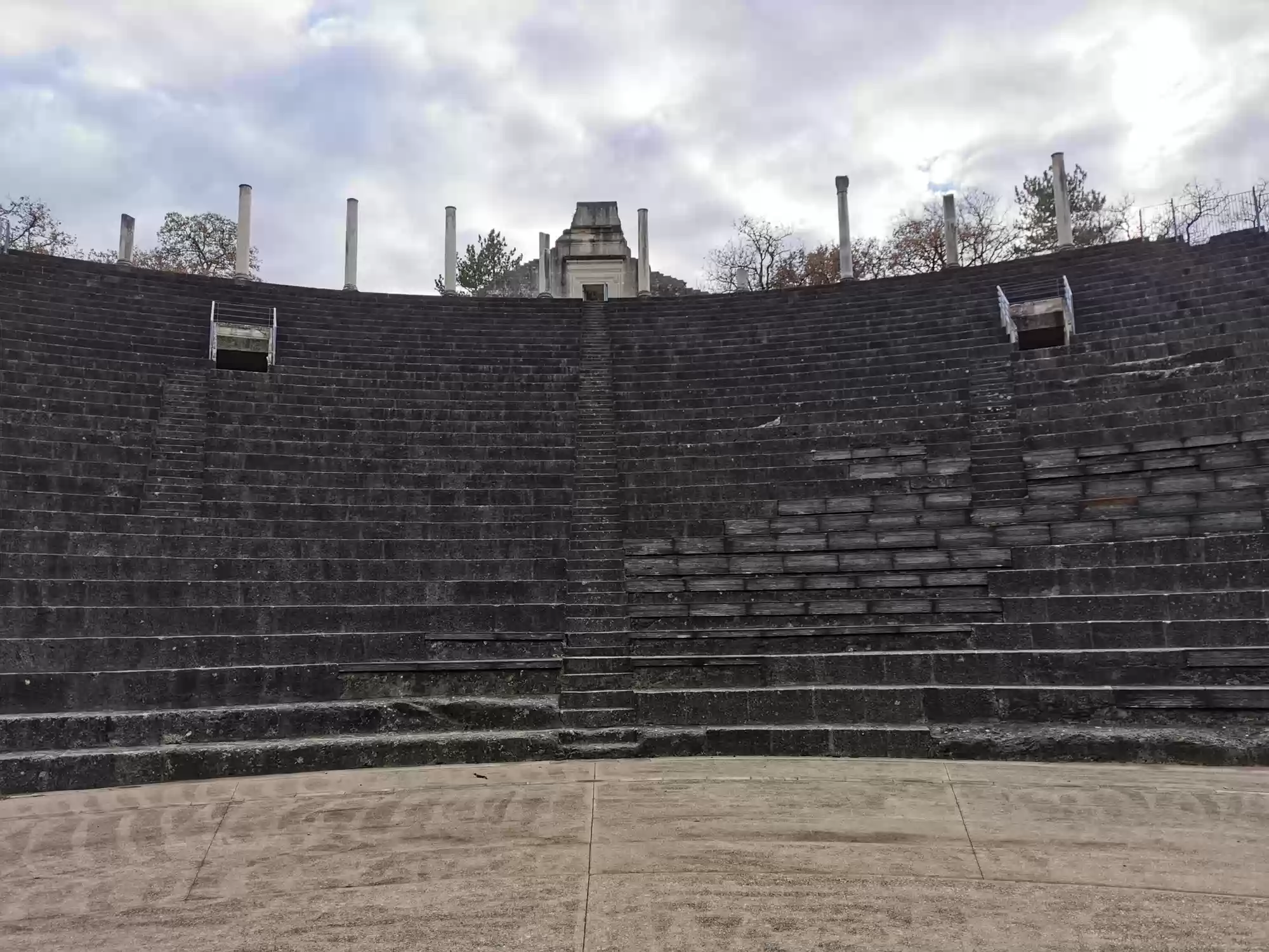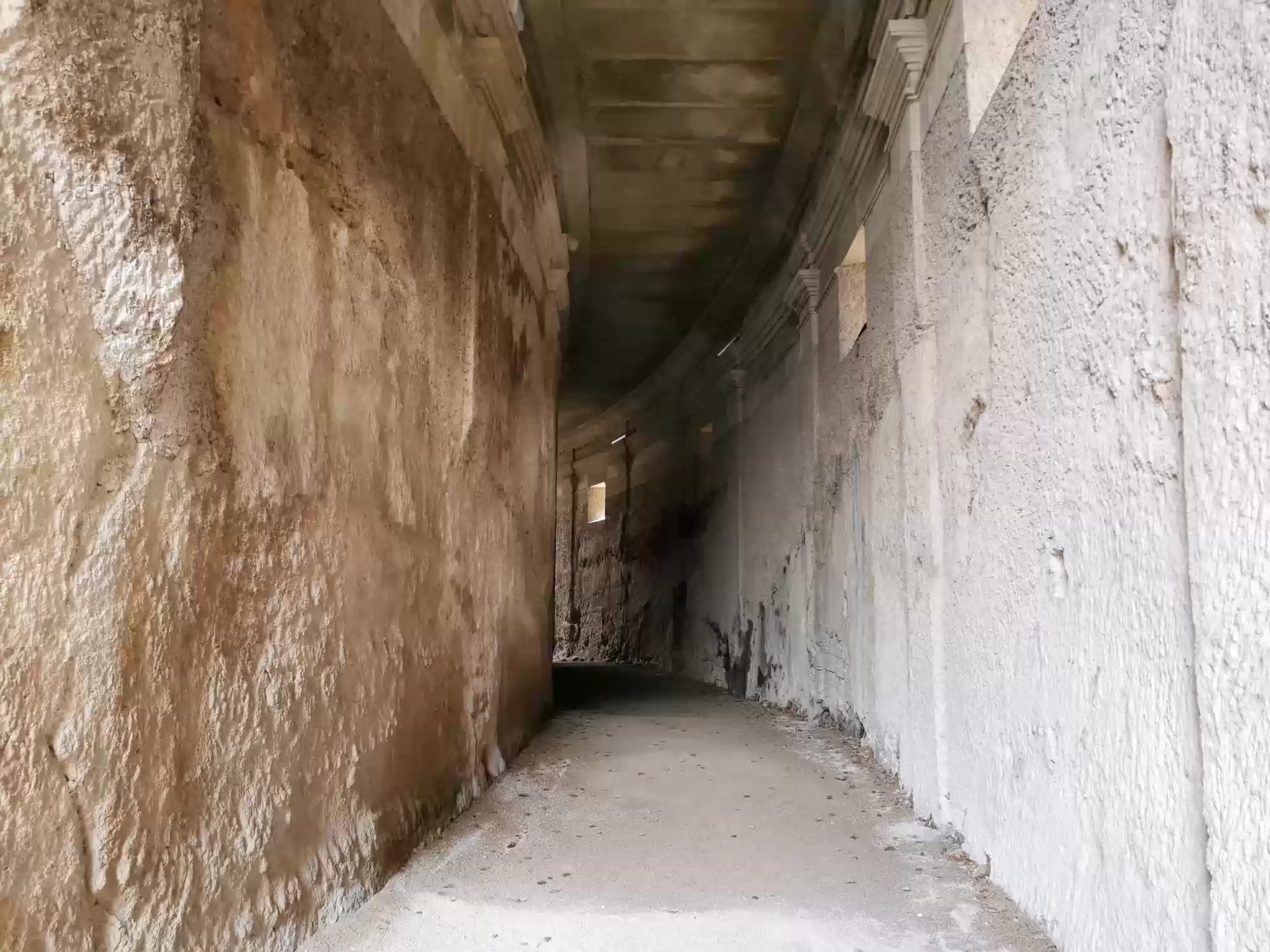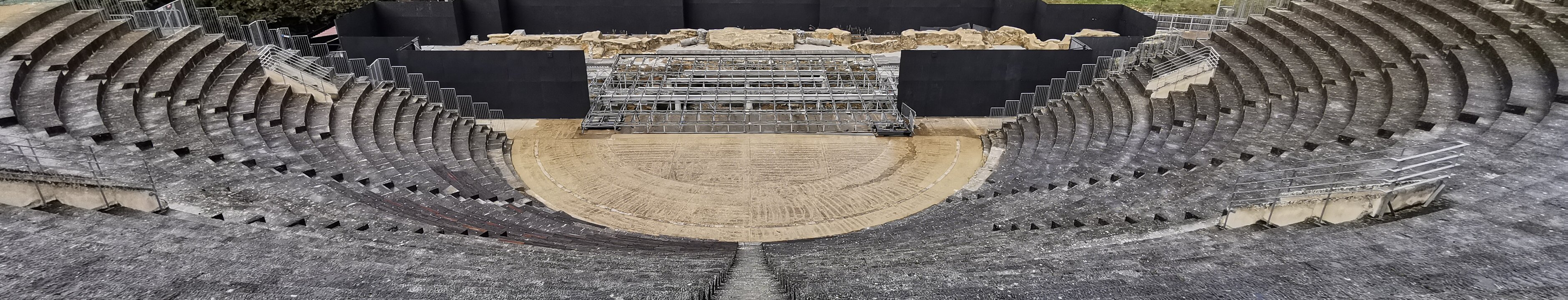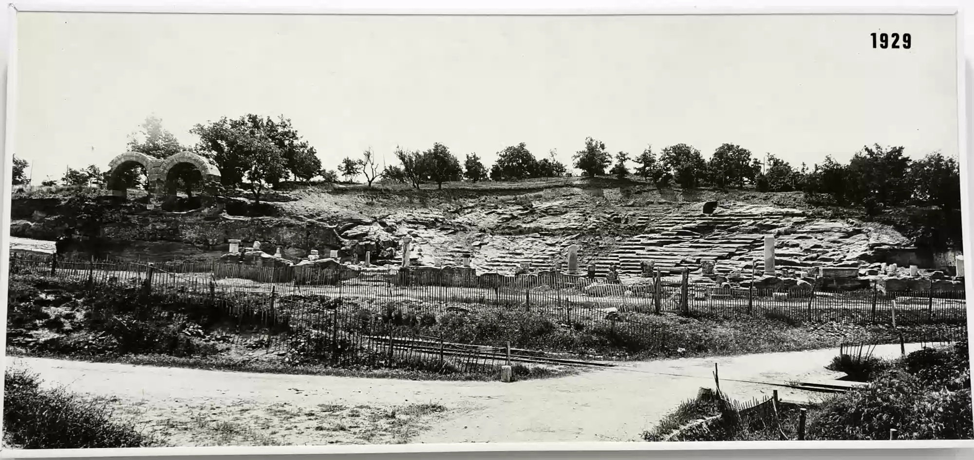 Theater in 1929. Before it was excavated, the theater was completely buried and invisible. Theater, 96 meters diameter, 30 rows, 29m tall, capacity: 6000. Mechanism below the stage. Labels