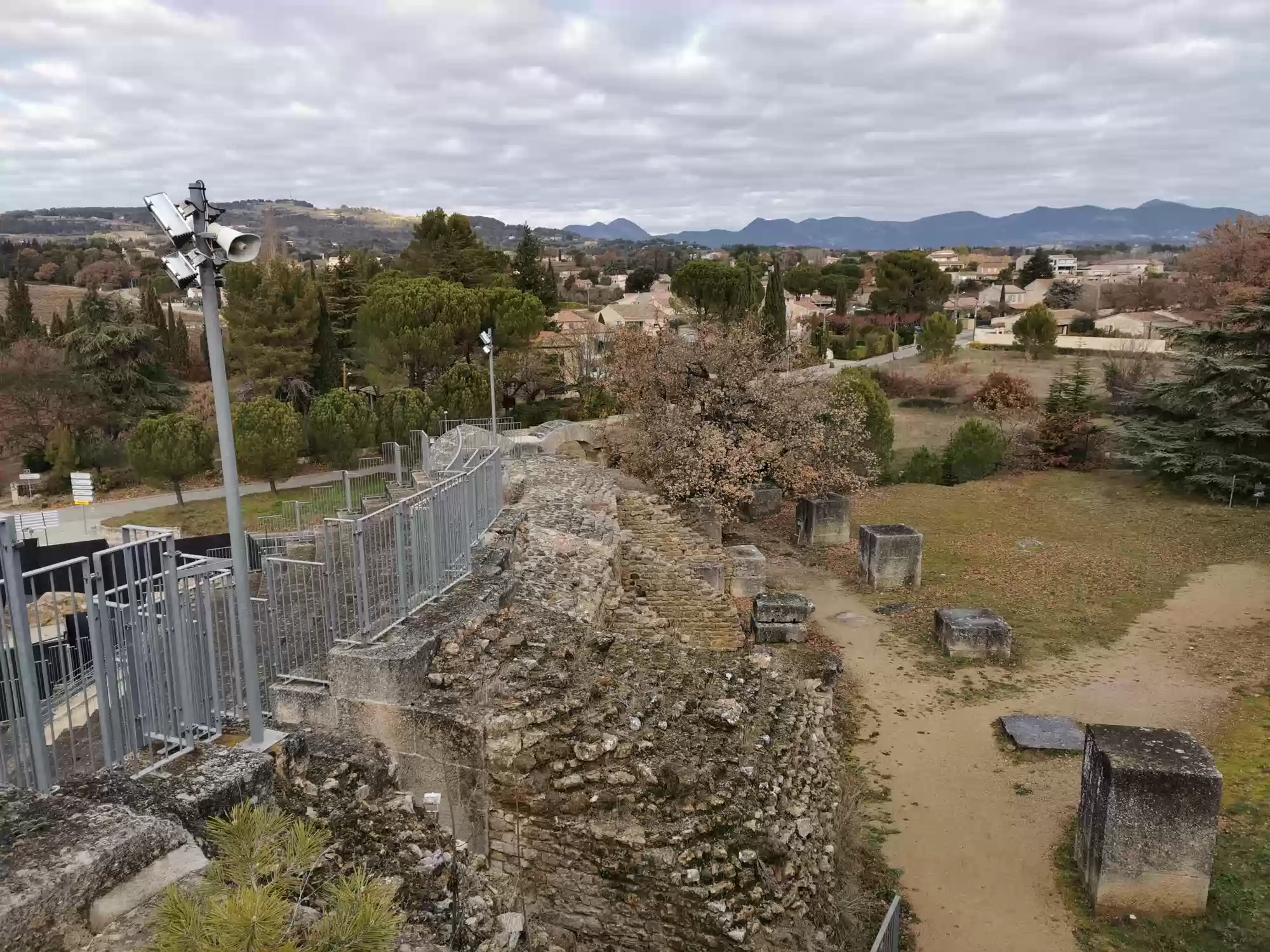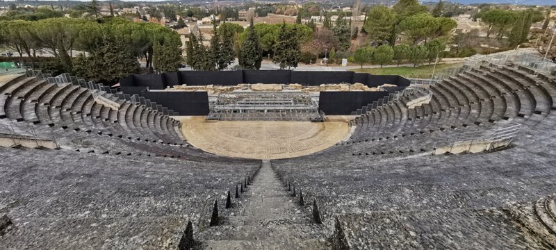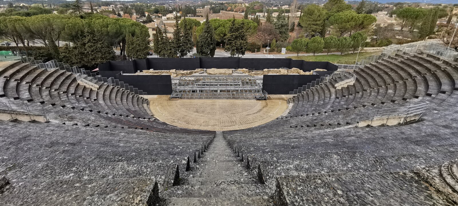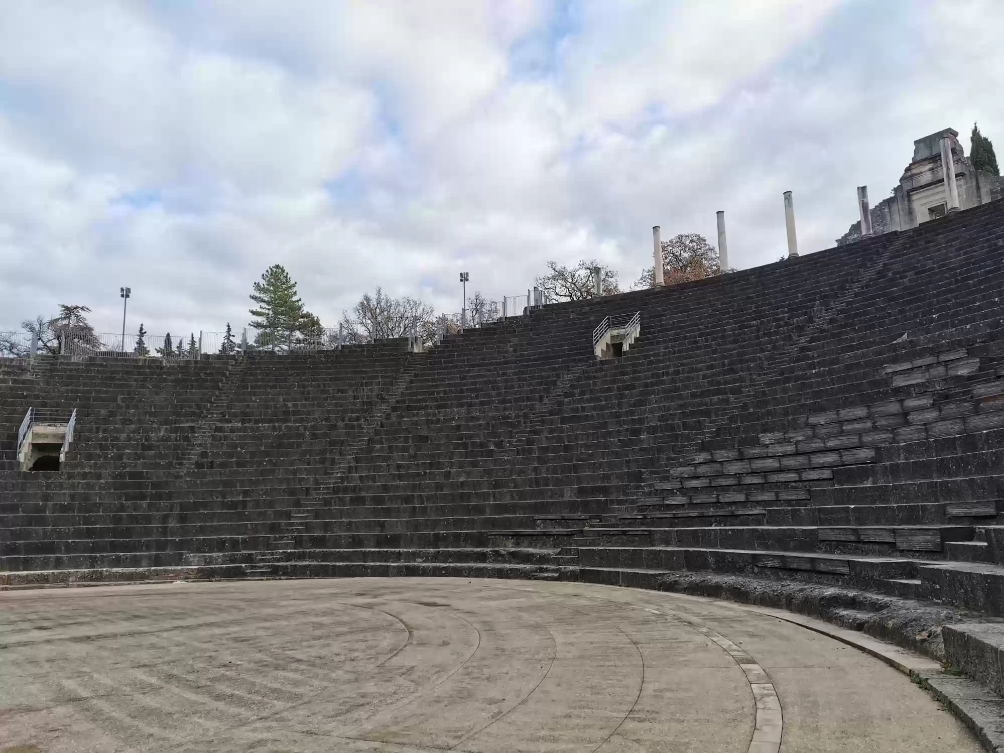 Theater in 1929. Before it was excavated, the theater was completely buried and invisible. Theater, 96 meters diameter, 30 rows, 29m tall, capacity: 6000. Mechanism below the stage. Labels