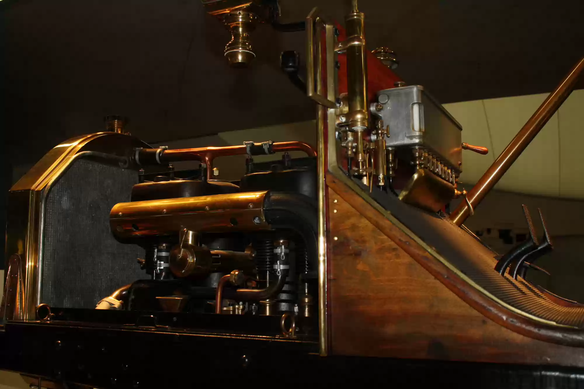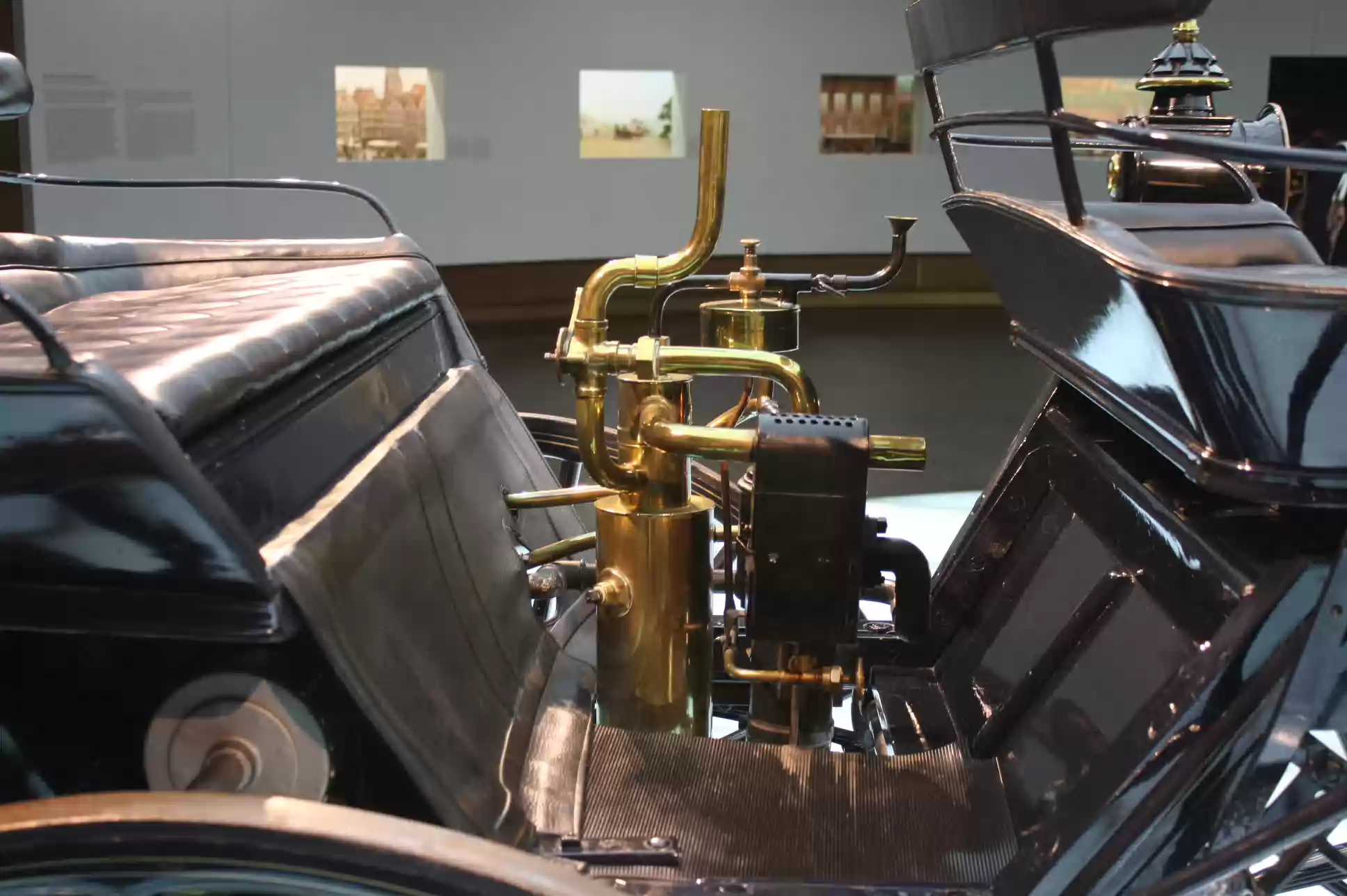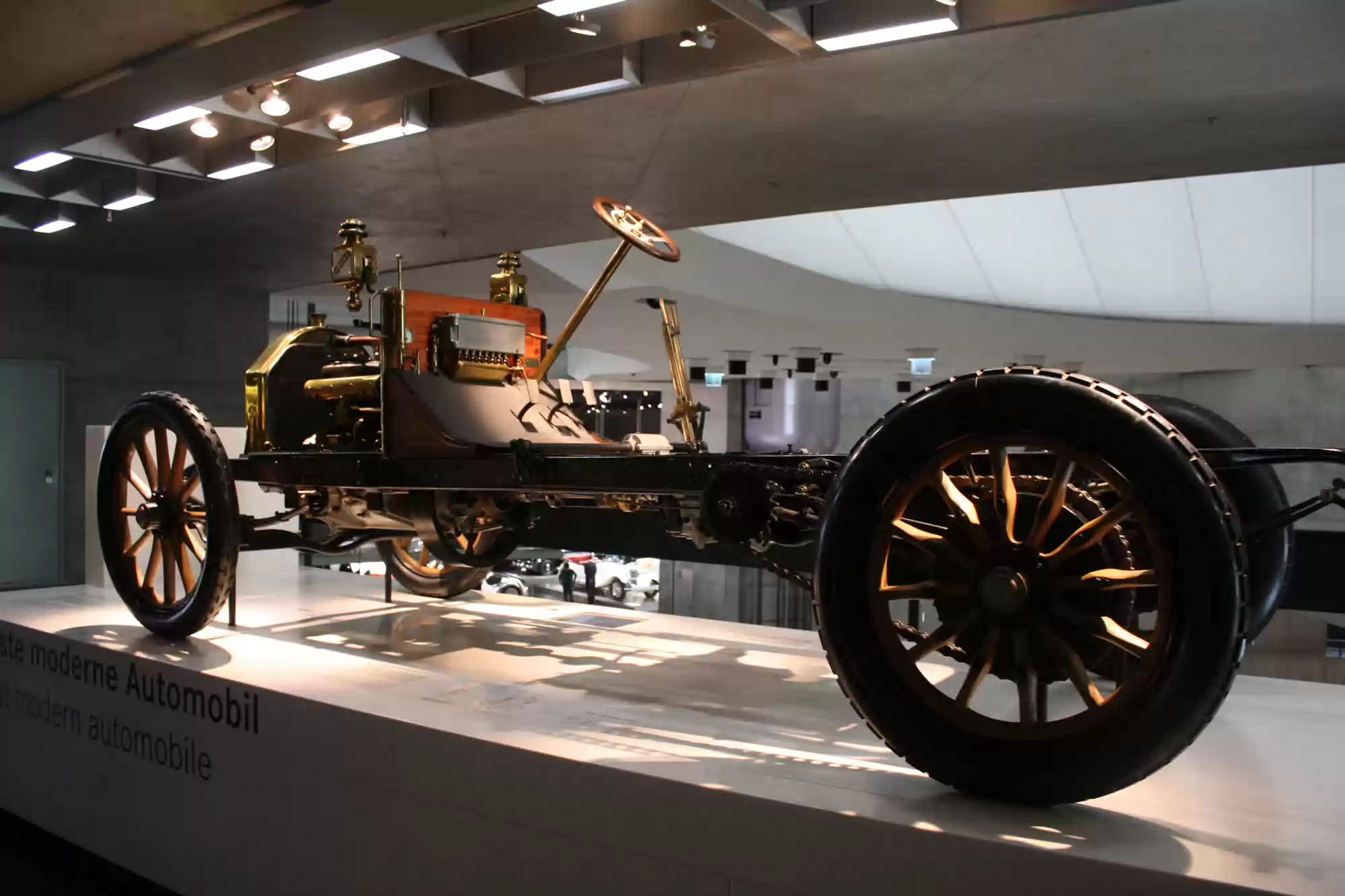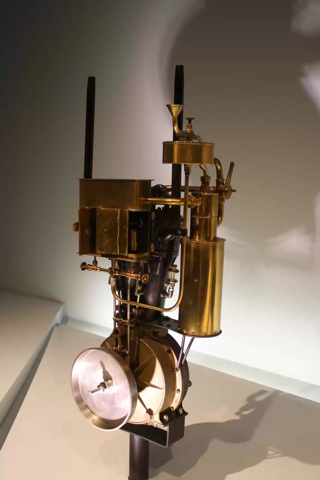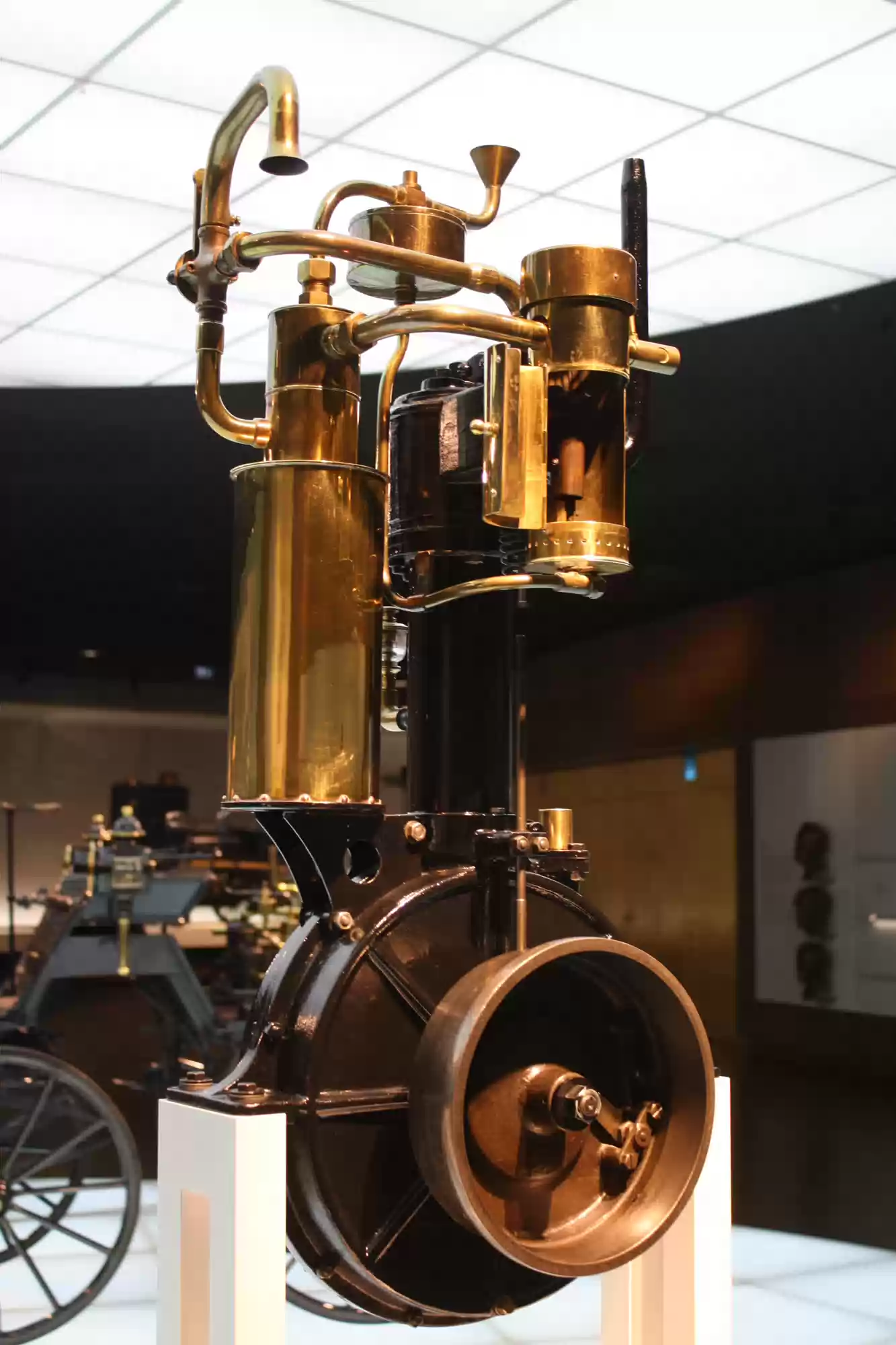 Daimler 1.5 HP 2-cylinder engine, based on the Grandfather clock, 2 cylinders arranged in a V shape. 565 cm3, 61 kg.
