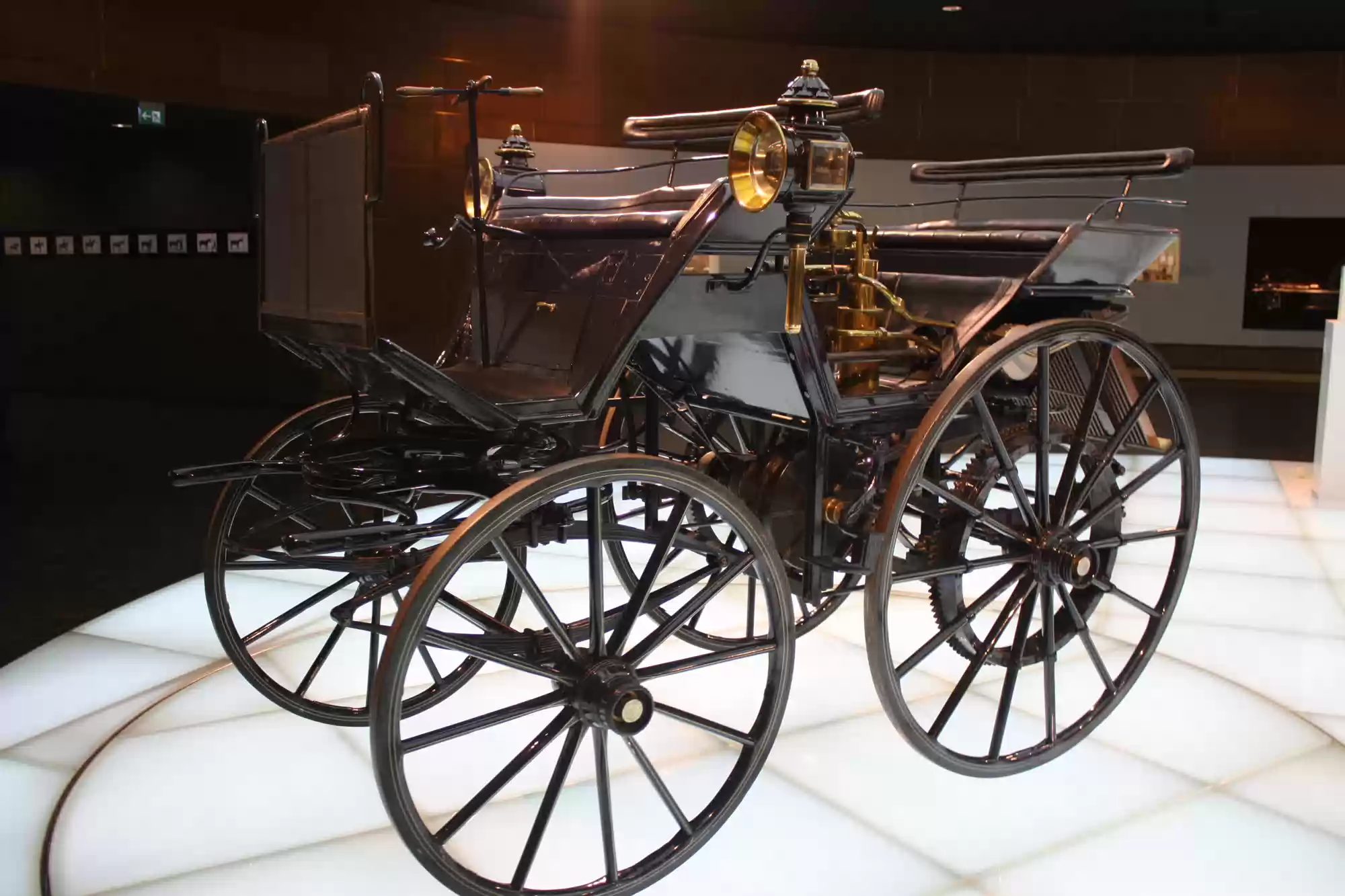 Daimler motorized carriage, 1886, 1 cylinder, 462 cm3, 1.1 HP, 18 km/h.