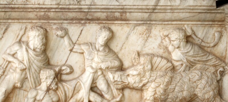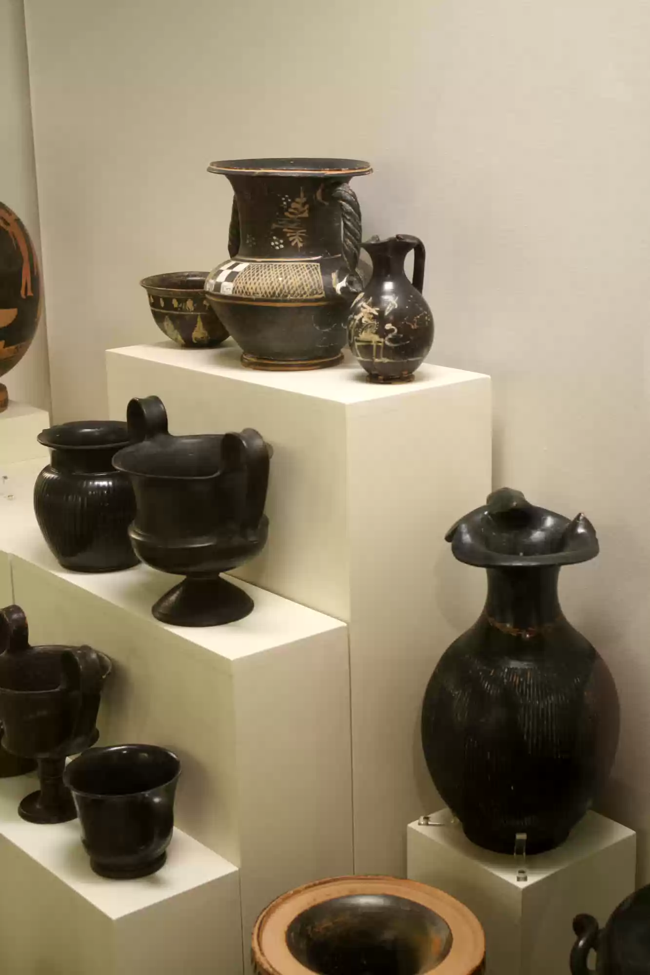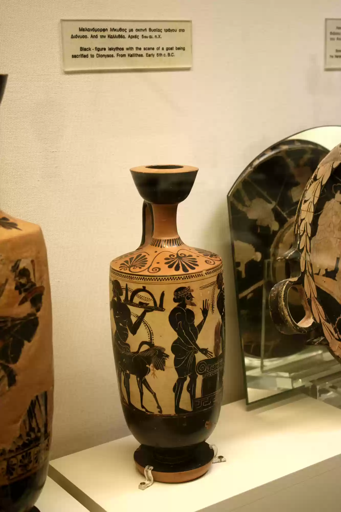 Black figure lekythos with a scene of a goat being sacrificed to Dionysos, from Kallithea, early 5th century BC.
