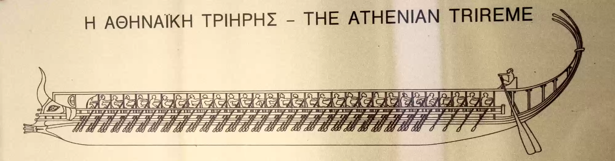 A trireme was a long vessel with 170 oarsmen. It was the basic weapon of naval warfare in ancient times, and the instrument of the Athenian naval empire.