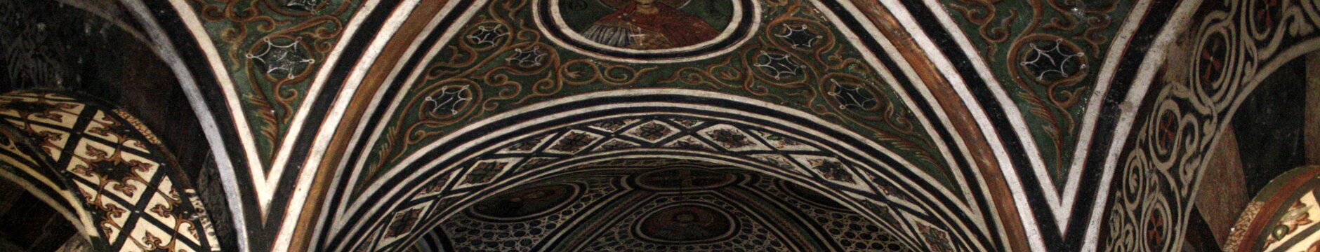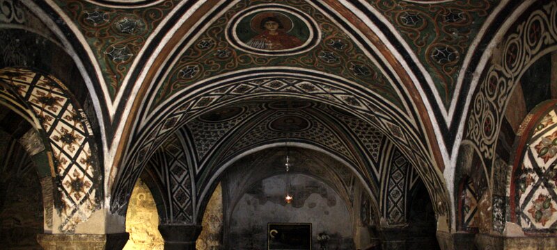The crypt was built in the 10th century. Grave of Saint Luke (Hosios Loukas) in the crypt dedicated to Saint Barbara, below the katholikon. Passion of the Christ. KatholikonMuseum Labels