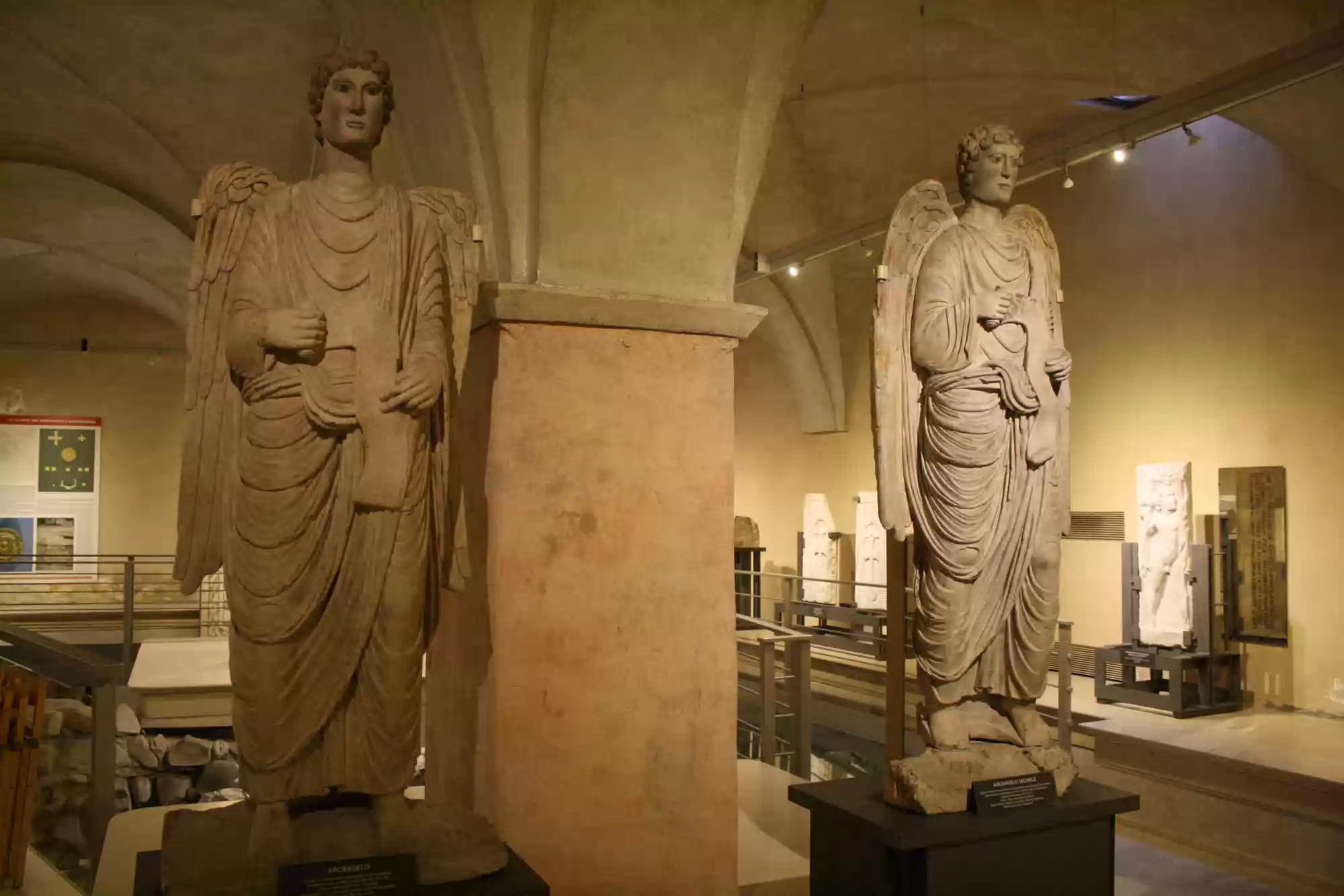 Archangels Michael and Gabriel. Originally placed in the niches above the North portal.