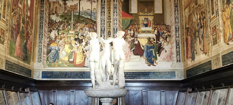 Frescoes painted by the Umbrian Bernardino di Betto, early 16th century. The frescoes tell the story of the life of Siena's favorite son, cardinal Enea Silvio… Three graces, Roman era. Book, 1473. Book, 1481. Book, third quarter of the 15th century. Labels