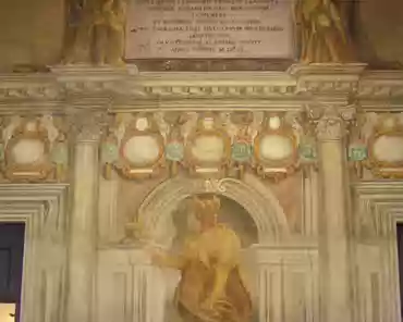 Teatro olimpico, 1585, the first example of a modern covered theater, designed by Palladio, but built after his death. The teatro itself, still used for representations. Inside the teatro. Scene with lavish classical adornment. VillasChurches Labels