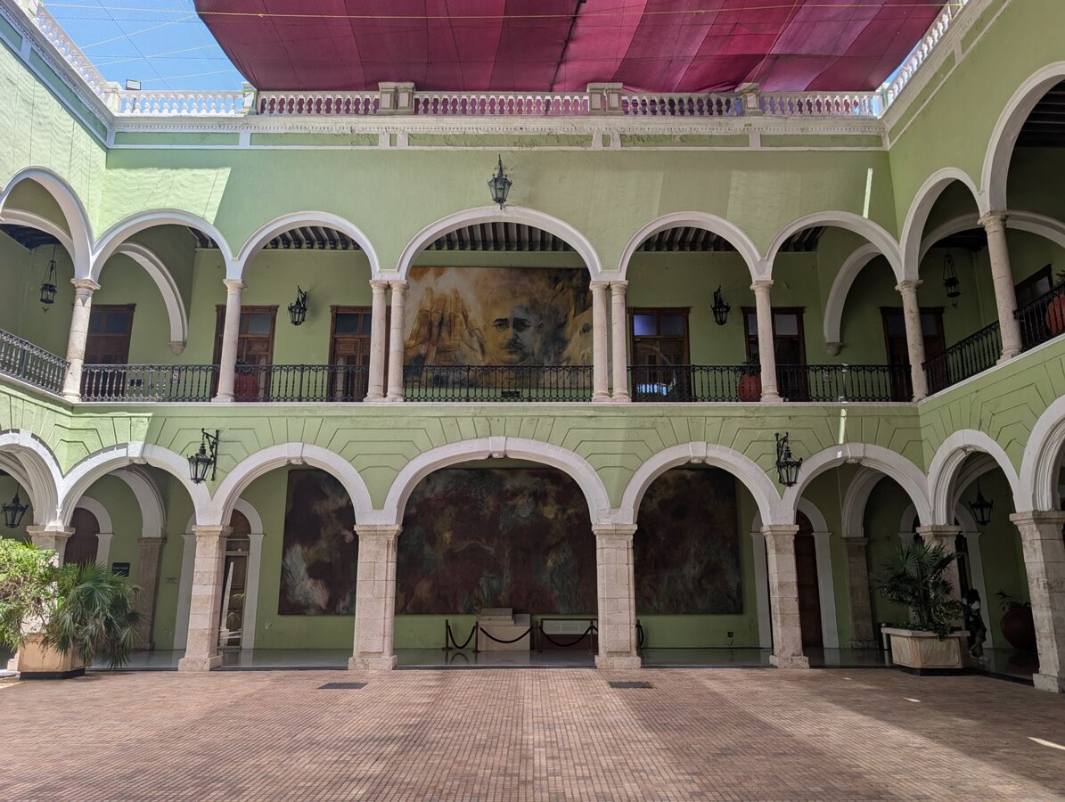 This second mural, continues the story begun in the first (which hangs in the opposite corridor); here the conquest has been completed and the Mayan…