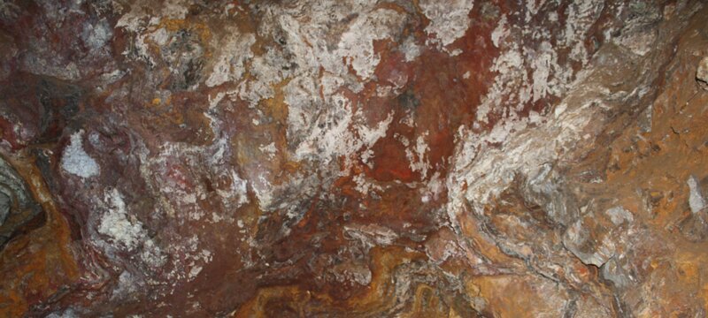 Queen's mine operated between 1877 and 1975. Copper, silver, lead, and gold was extracted from the mine's ore. A crack in the mine. Holes, dynamite and leads. Mobile bathroom. Pneumatic tools. Labels
