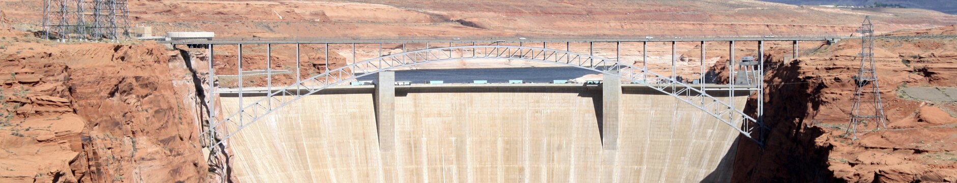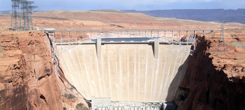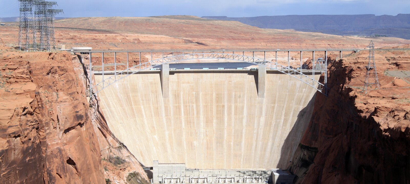 Glenn Canyon dam was built between 1956-1964. Height: 216m; length: 475m; 3.7 million cubic meters of concrete; 1320 MW generated power.