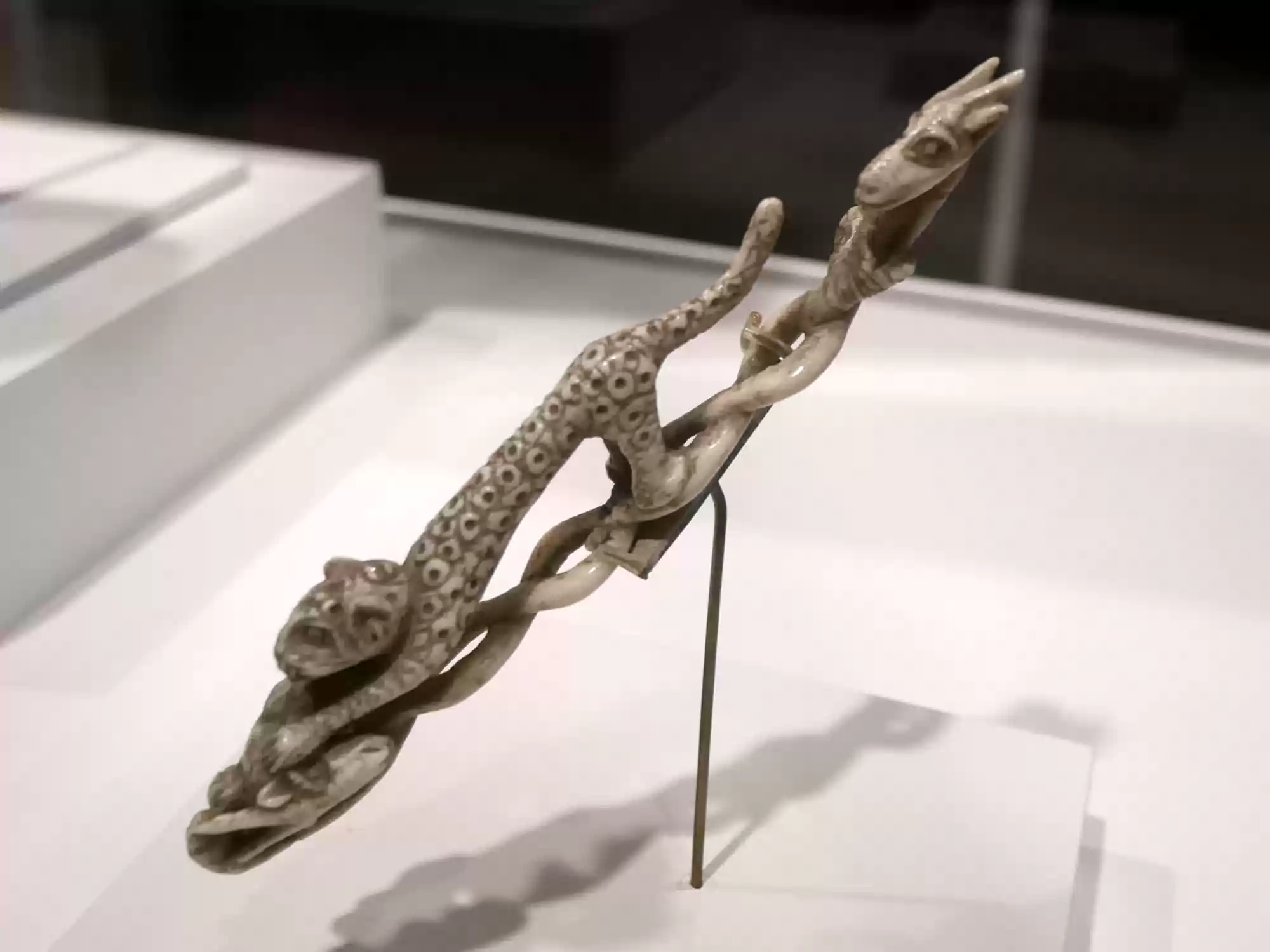 Owo or Edo artist, handle of a spoon (?) with a leopart and two goats, Nigeria, 16th century.
