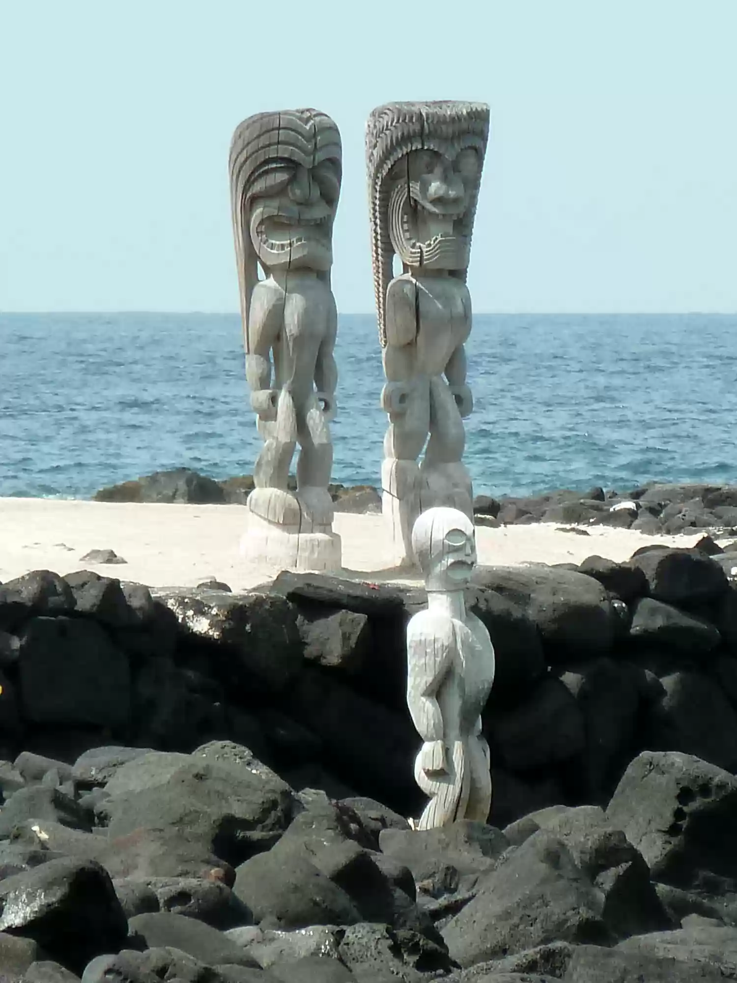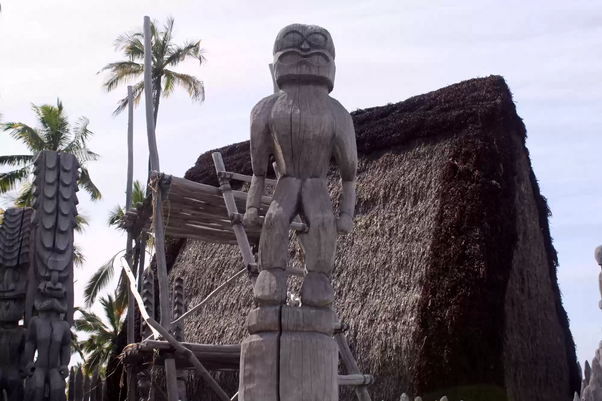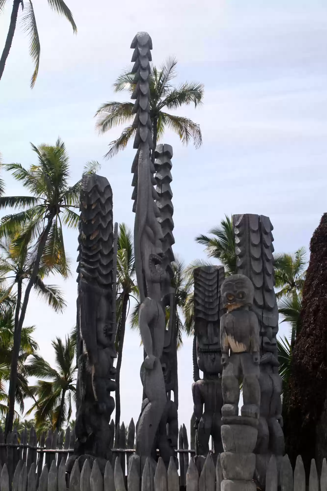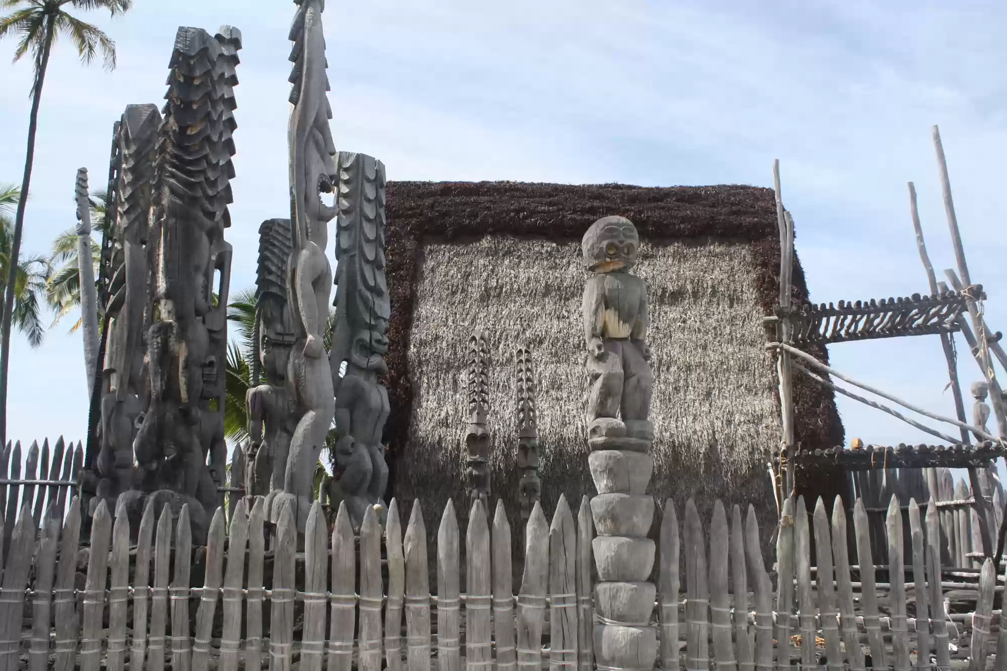 Hale o keawe: ki'i (wooden images) stand watch over the rebuilt temple and mausoleum that once held the bones of 23 ali'i (noble chiefs). Ho'okupu (offerings)…