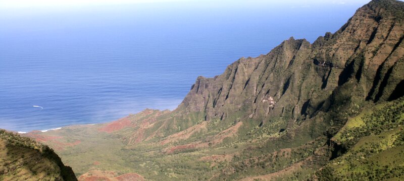 Kalalau valley, along the Na Pali coast. Fluted ridges are made by water running down the slopes during heavy rains and cutting through the softer basalt…
