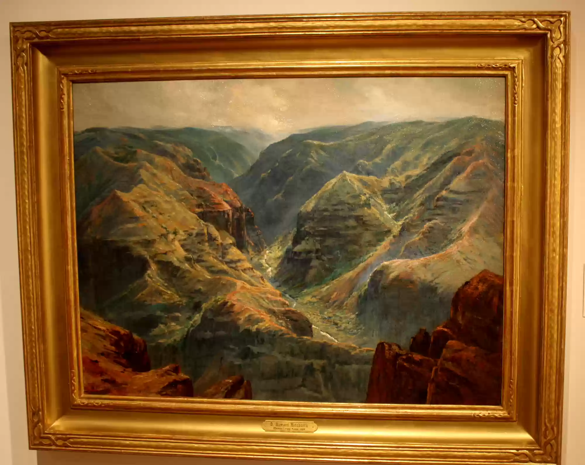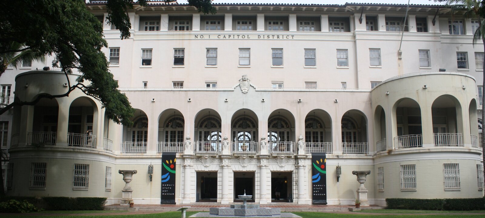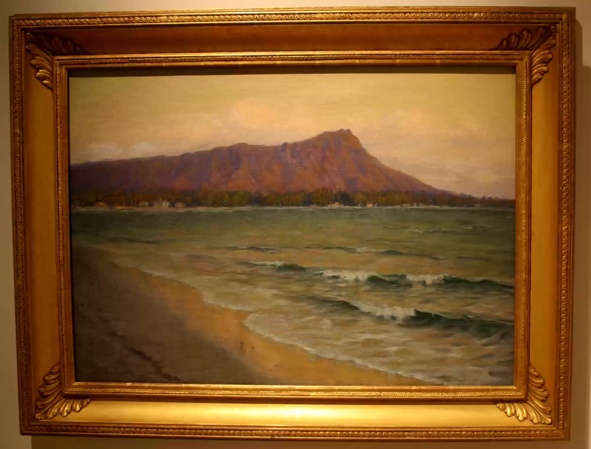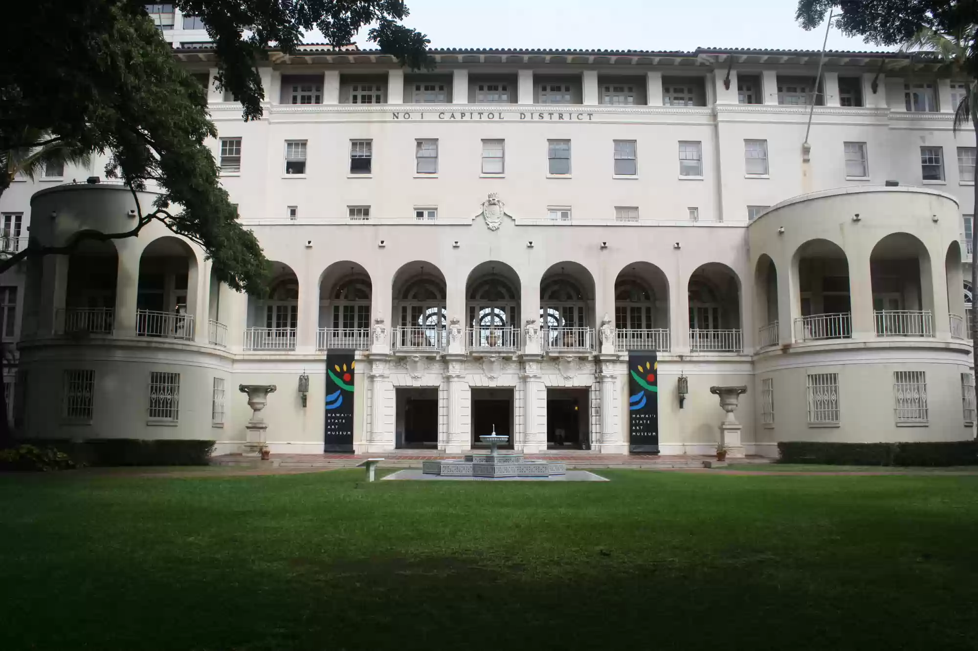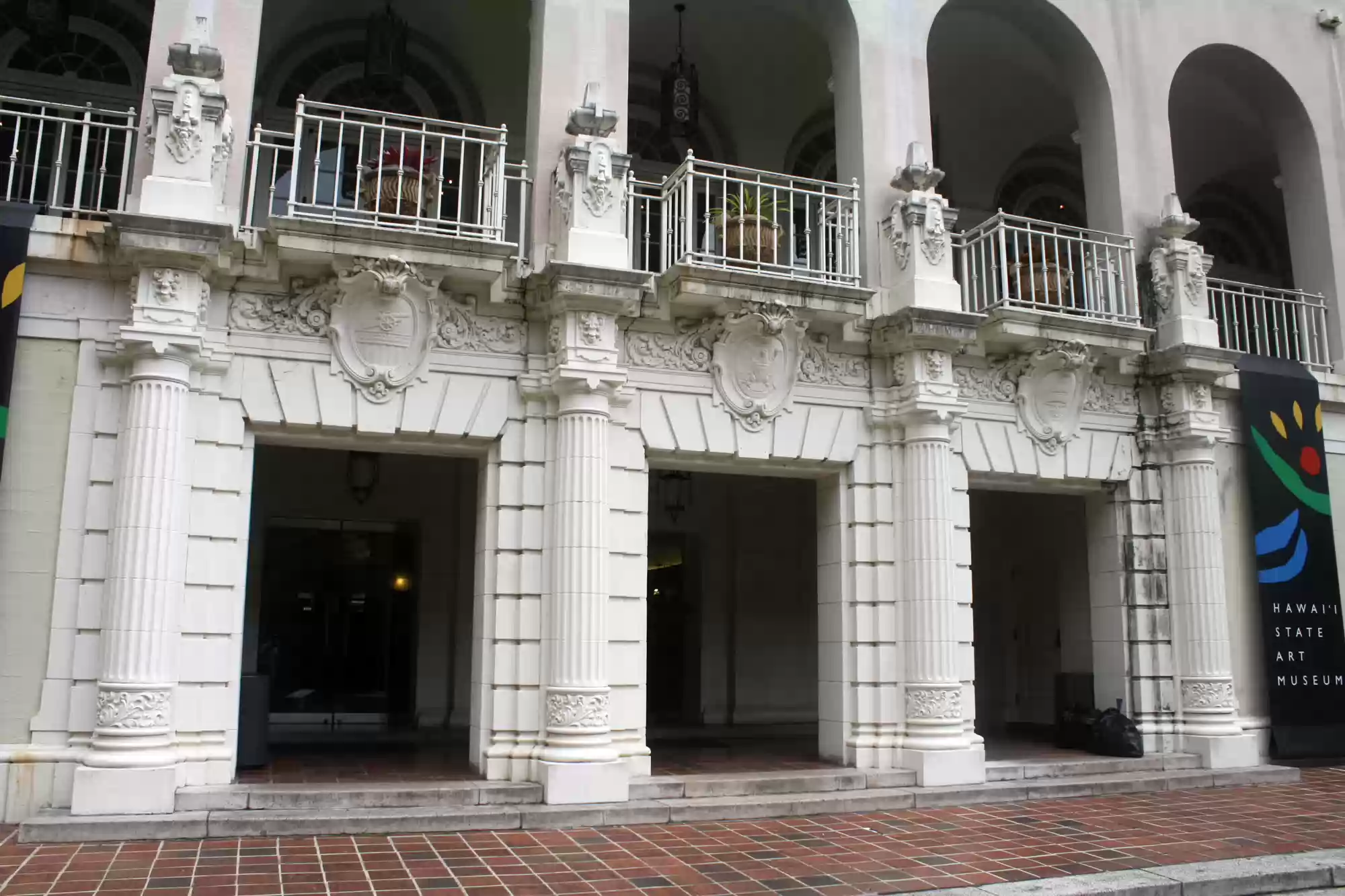 Fountain gifted by the Kingdom of Morocco to the people of the state of Hawaii, 2012. Artist unknown, Hawaiian flag quilt, c. 1898. D. Howard Hitchcock, Panorama of Waimea Canyon, c. 1907. D. Howard Hitchcock, Waimea Canyon, Kauai, 1909. Alfred R. Gurrey Sr., Dusk at Kilauea Kauai, 1914. Lionel Walden, Diamond Head and Waikiki beach, 1918. Madge Tennent, Hula girl in national flowers, c. 1930. Madge Tennent, Hula girl in national flowers, c. 1930. Madge Tennent, Two sisters of Old Hawaii, 1933. Louis Pohl, Flow to the sea, 1971. Masami Teraoka, Ronin samurai, 1982. Hank Murta Adams, Blue torso, 1984. Hiroki Morinoue, Ocean rain, 1994. Stewart Valentine Medeiros Sr., Presentation 'Umeke. Saint Andrews Cathedral Labels