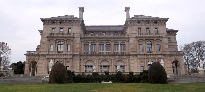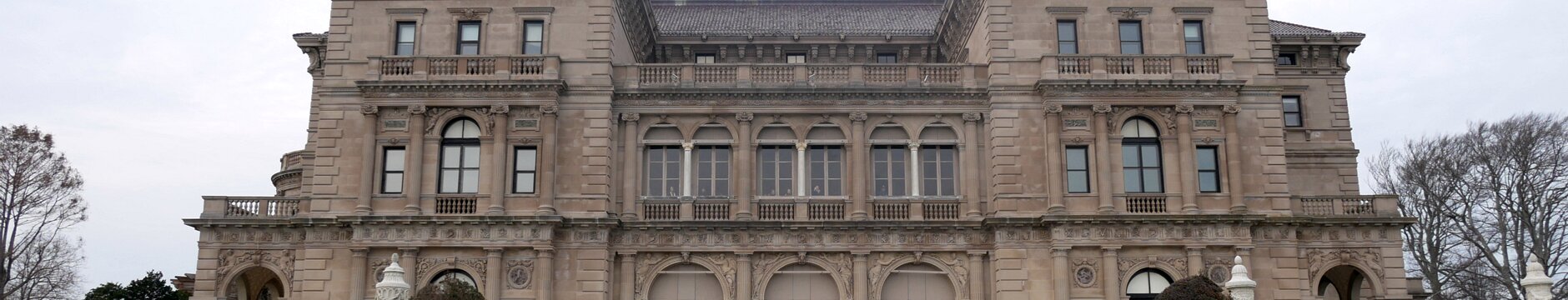 The Breakers, built by Richard Morris Hunt for Cornelius Vanderbilt II in 1893. 70 rooms, 5800 sqm living area, estate: 5.7 ha. Side. Rear. Fountain modeled after the entrance of Opera Garnier in Paris. Breakfast room. RosecliffThe Elms Labels
